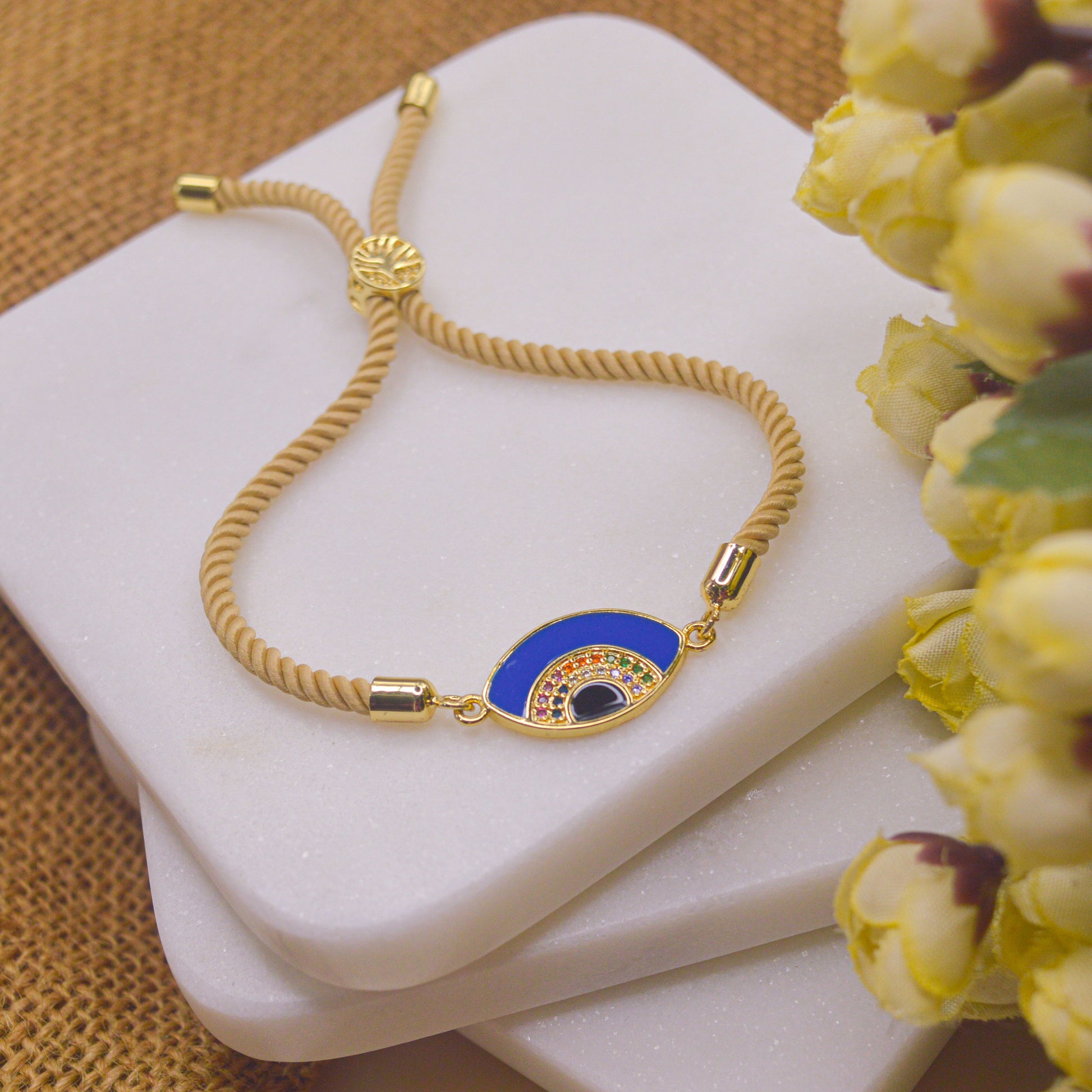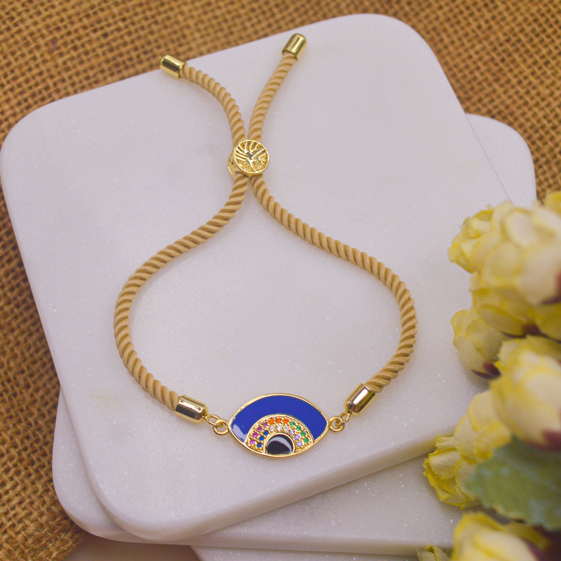 Blue Evil Eye Bracelet in Cream Band - Gold