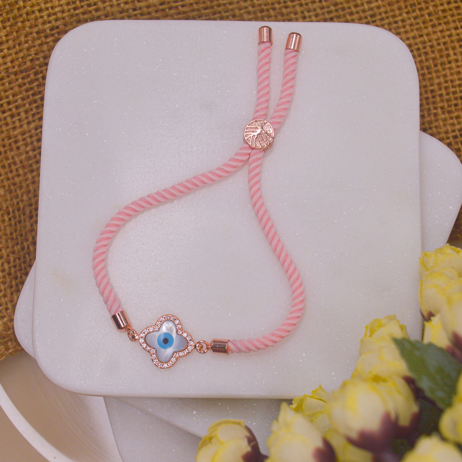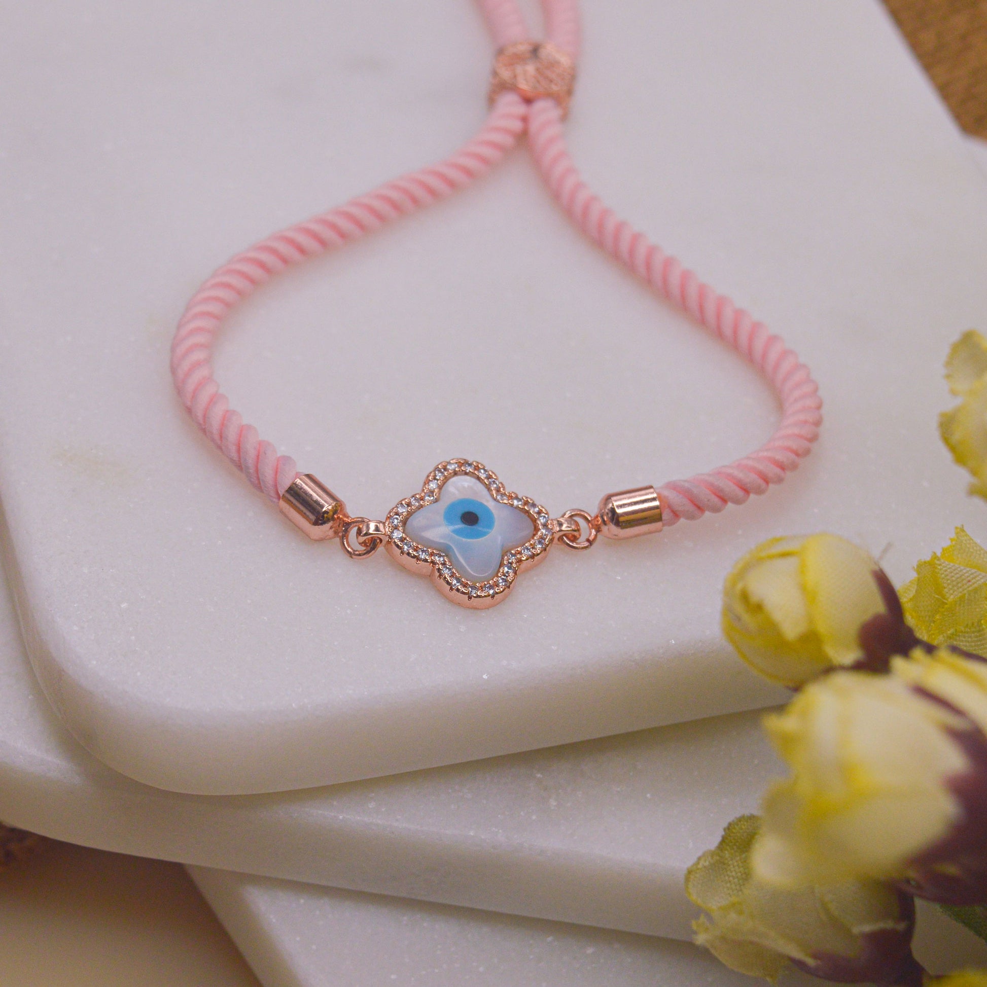 Clover Evil Eye Bracelet in Baby Pink Band - Rose Gold