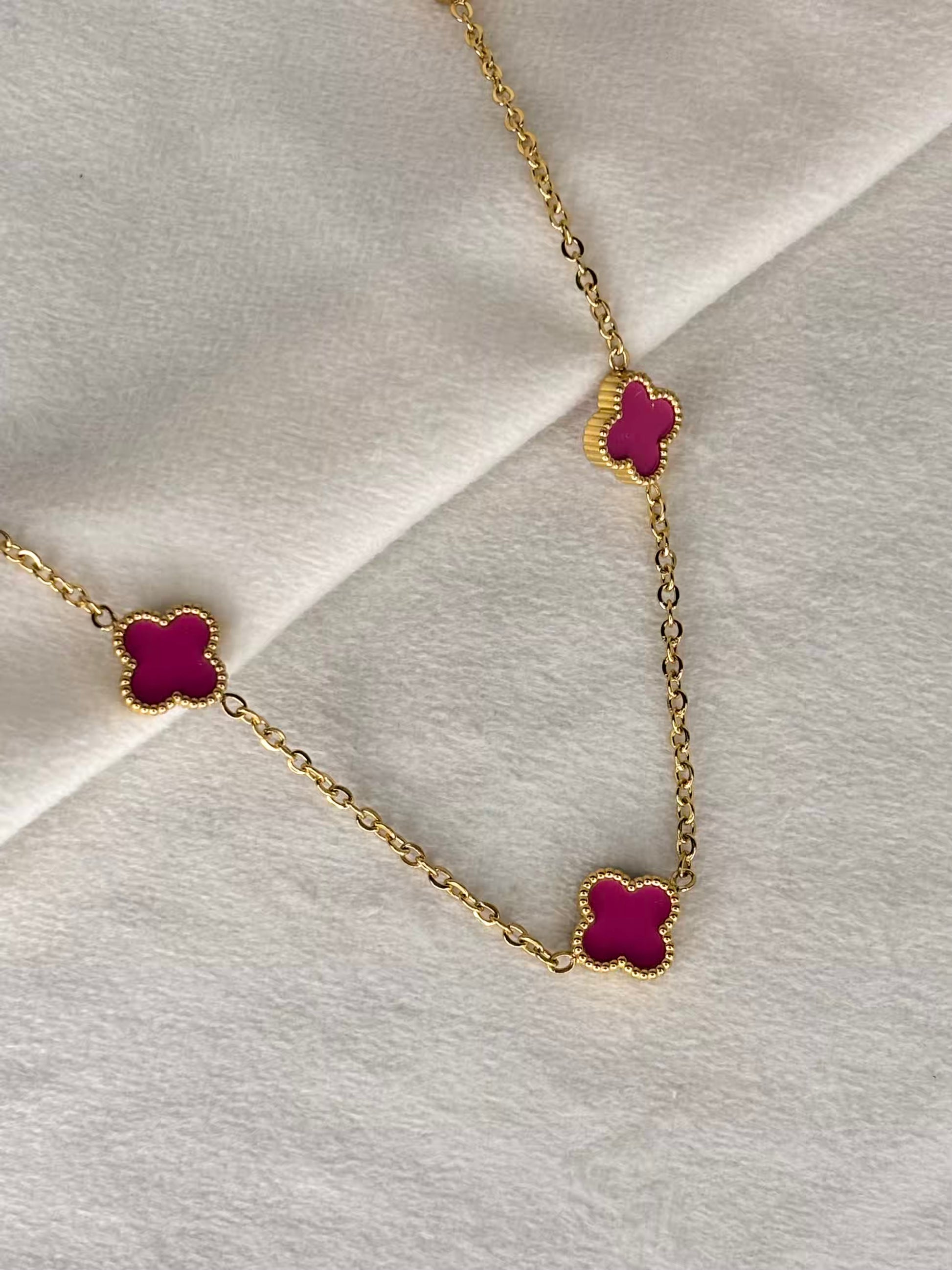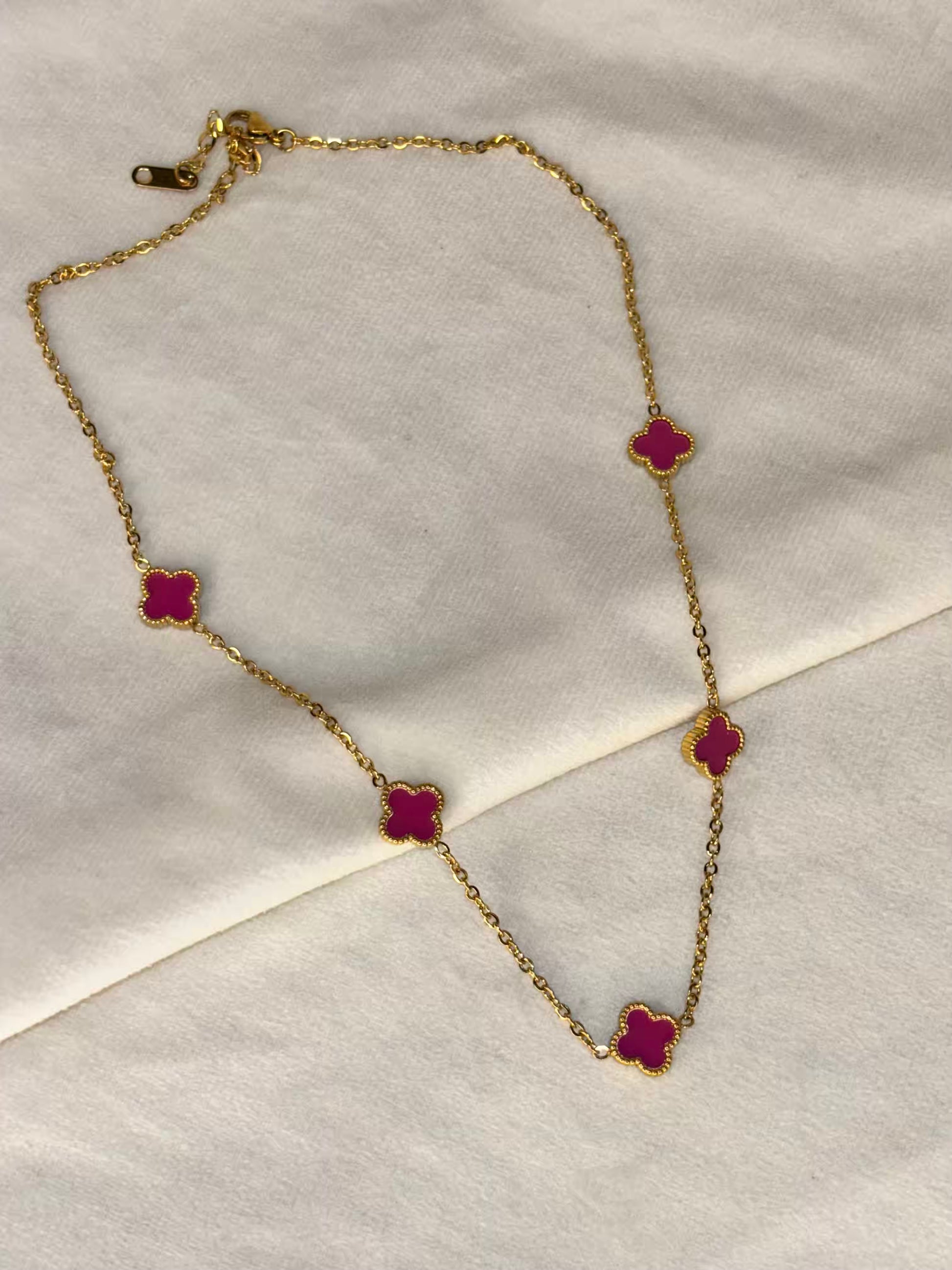 Magenta Pink 5 Clover Necklace - Gold Plated