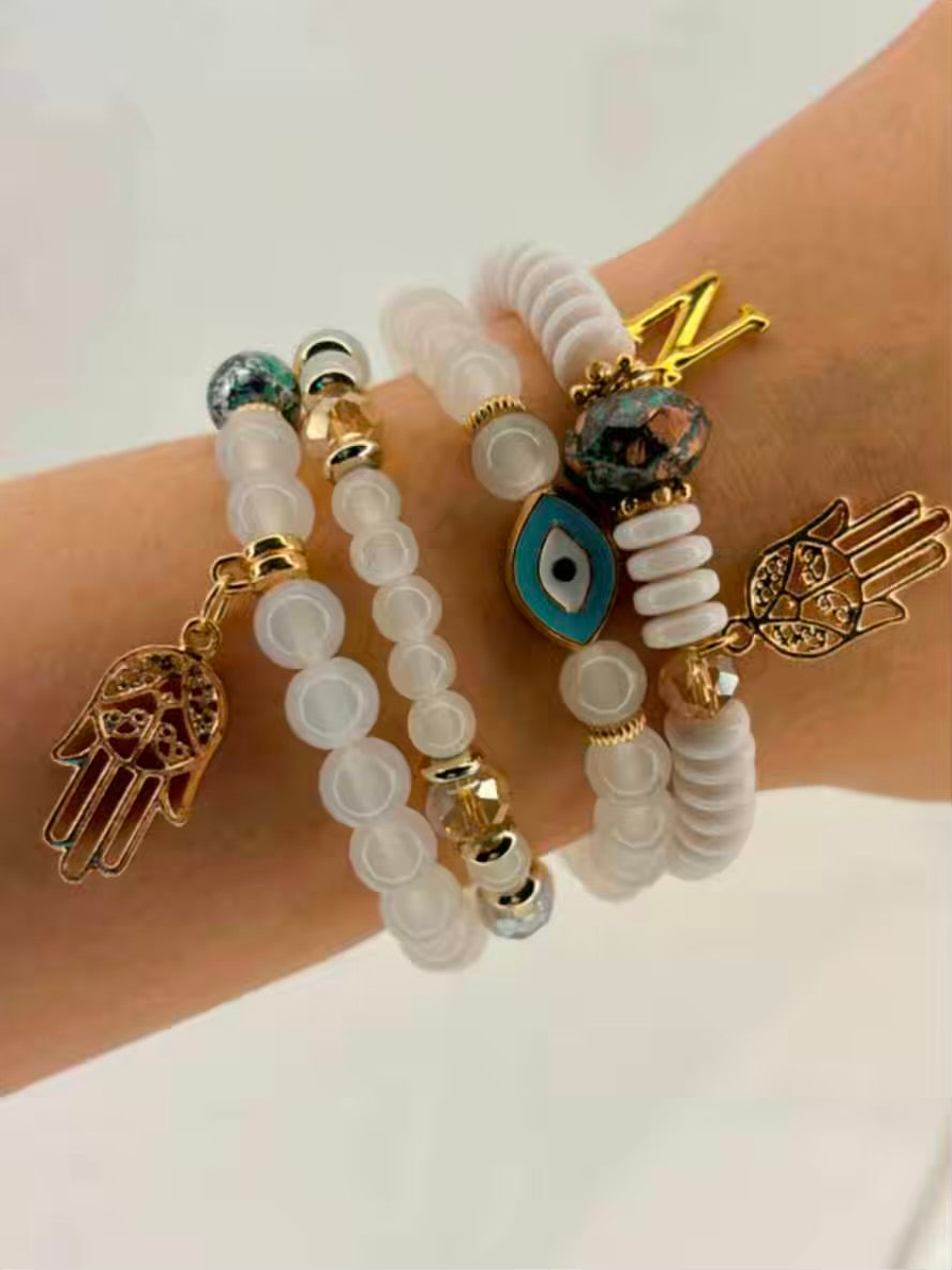White Evil Eye Hamsa Beaded Crystals Hamsa Elastic Stretchable Bracelet With Customised Initial Alphabet Unisex for Men / Women