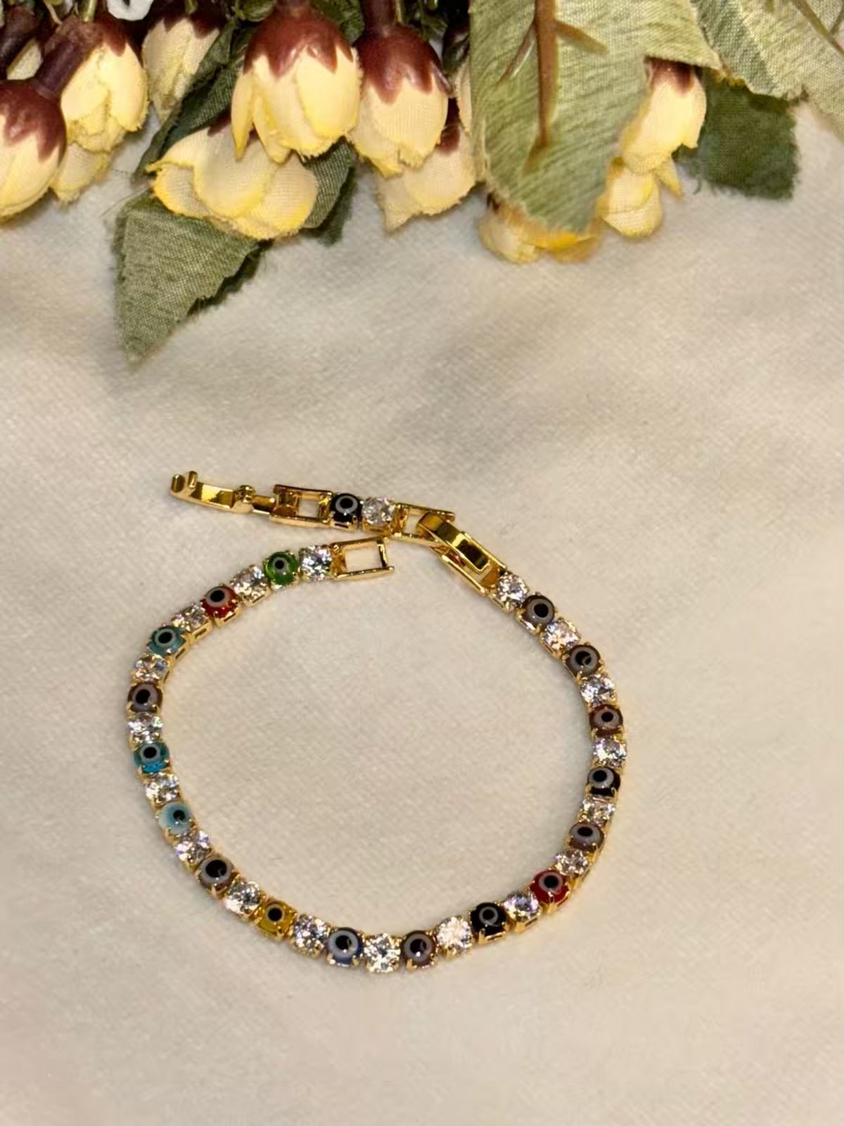 Colourful Evil Eye Shining Solitaire Diamonds Tennis Bracelet - Gold Colour