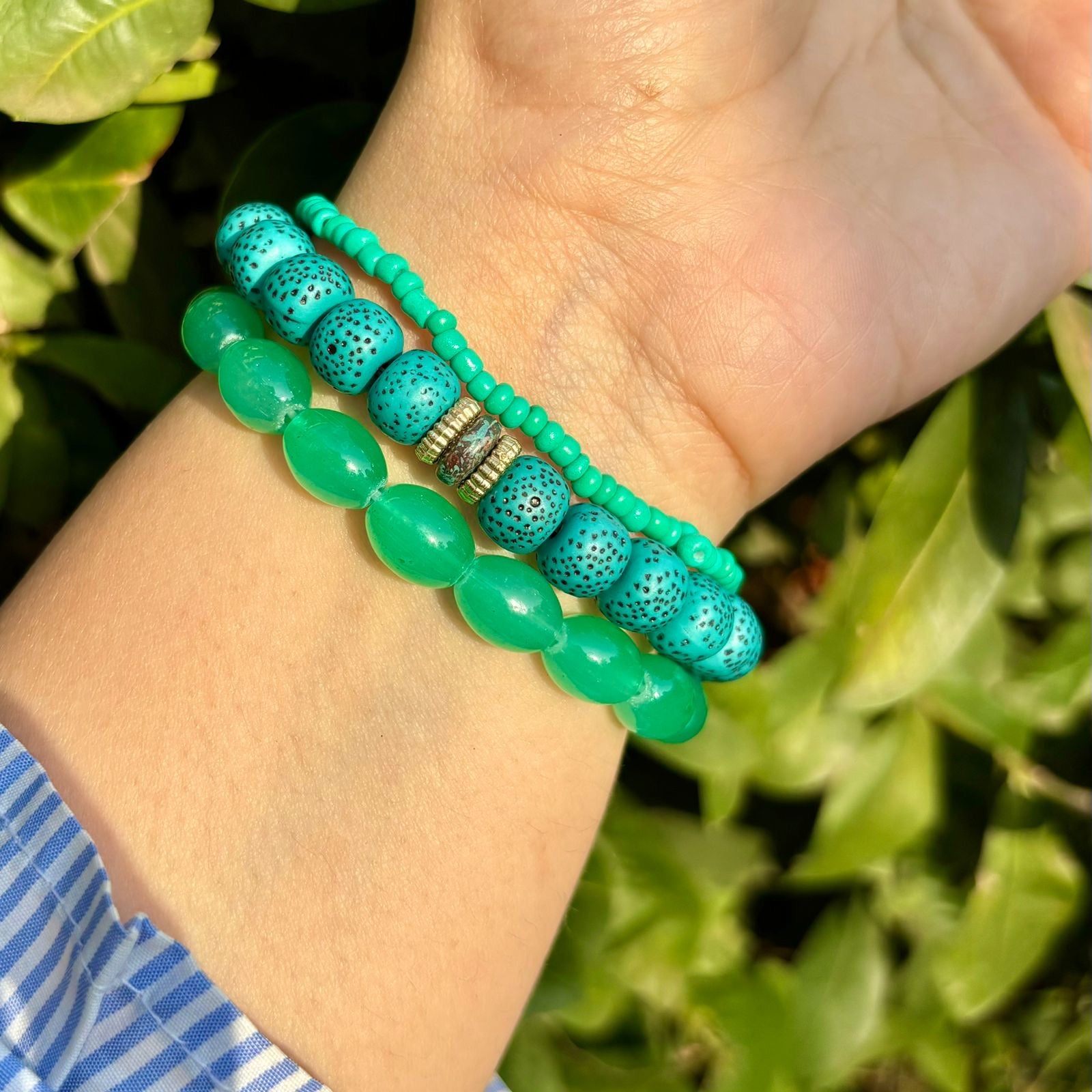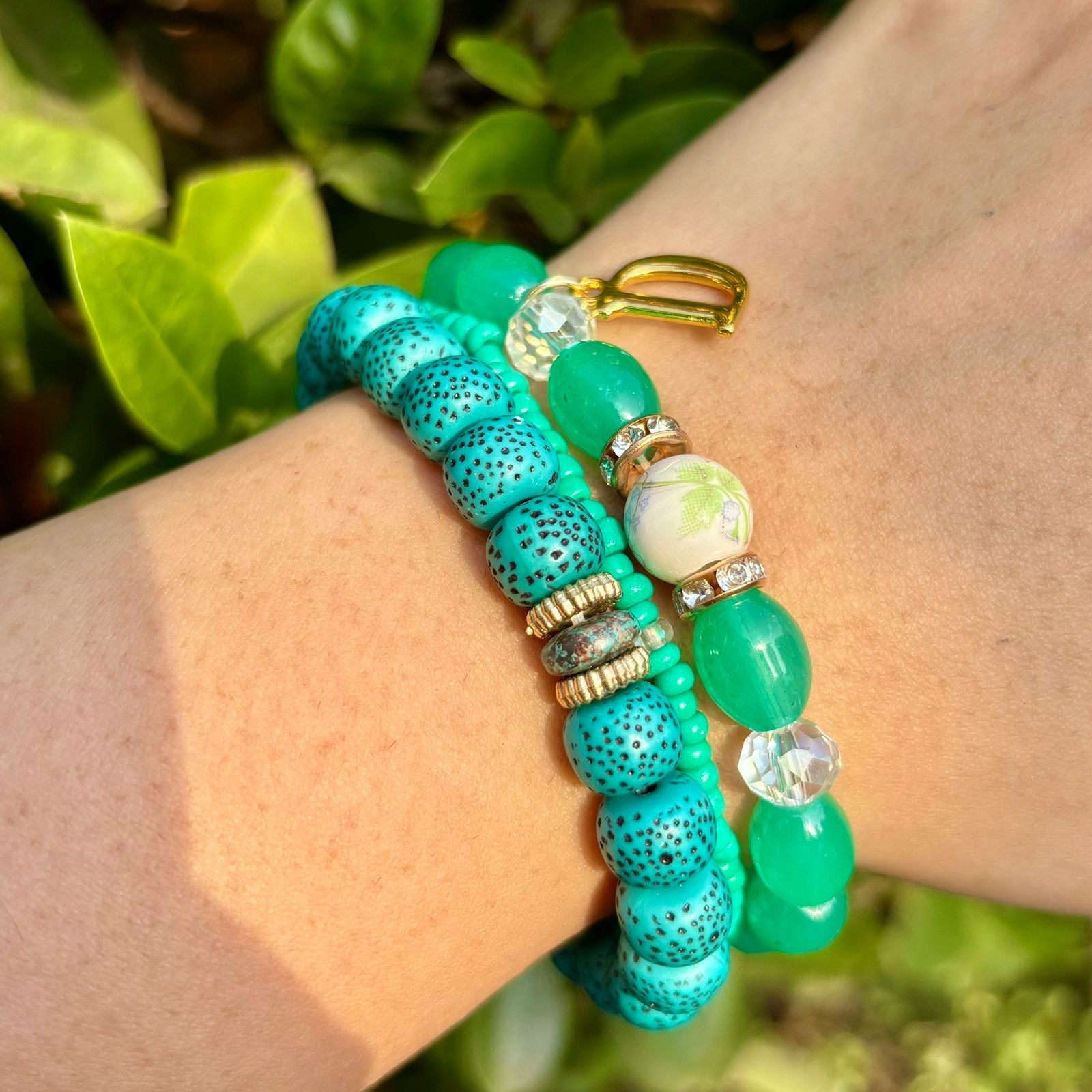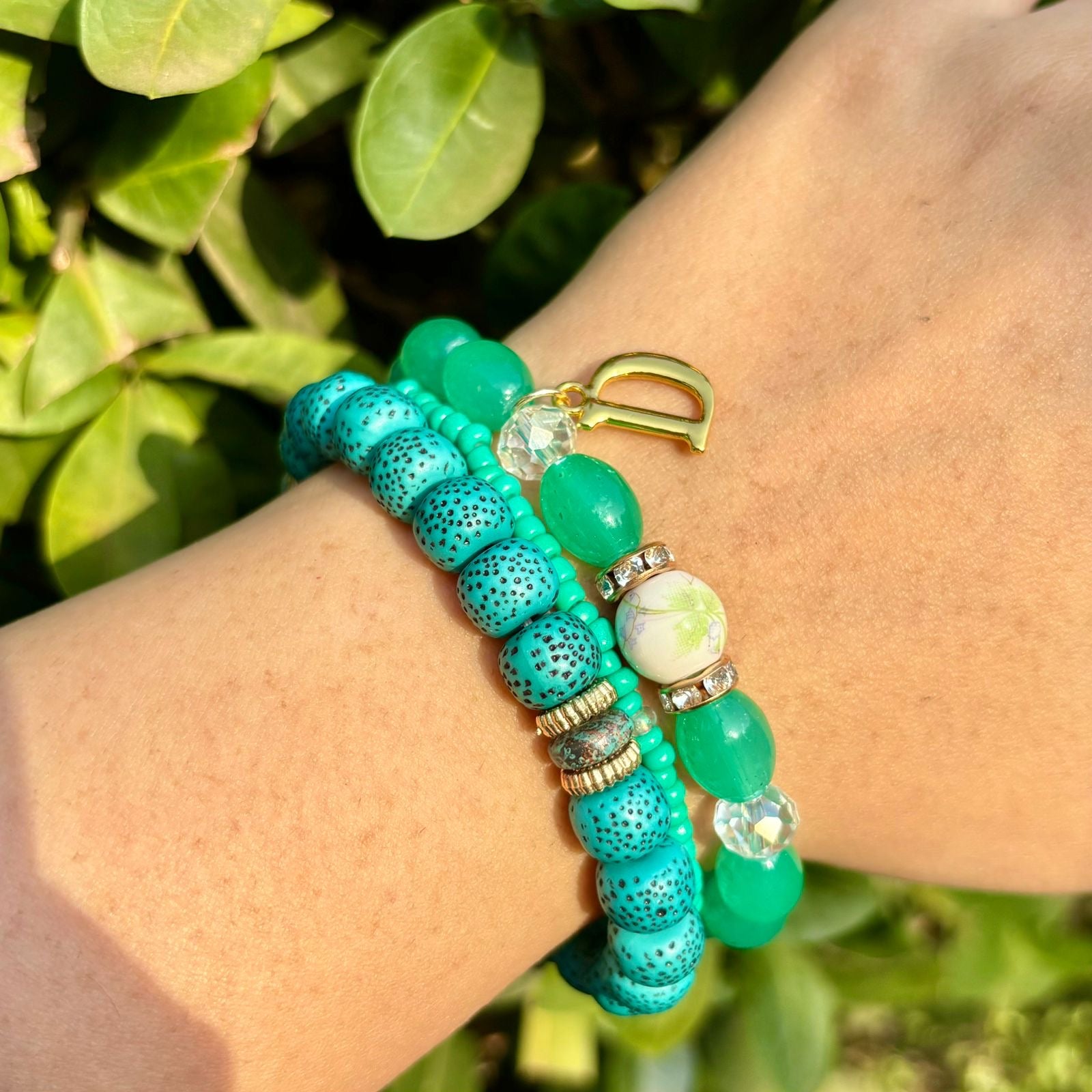 Green Ocean Stack Elastic Bracelet With Customised Initial ( Gold )