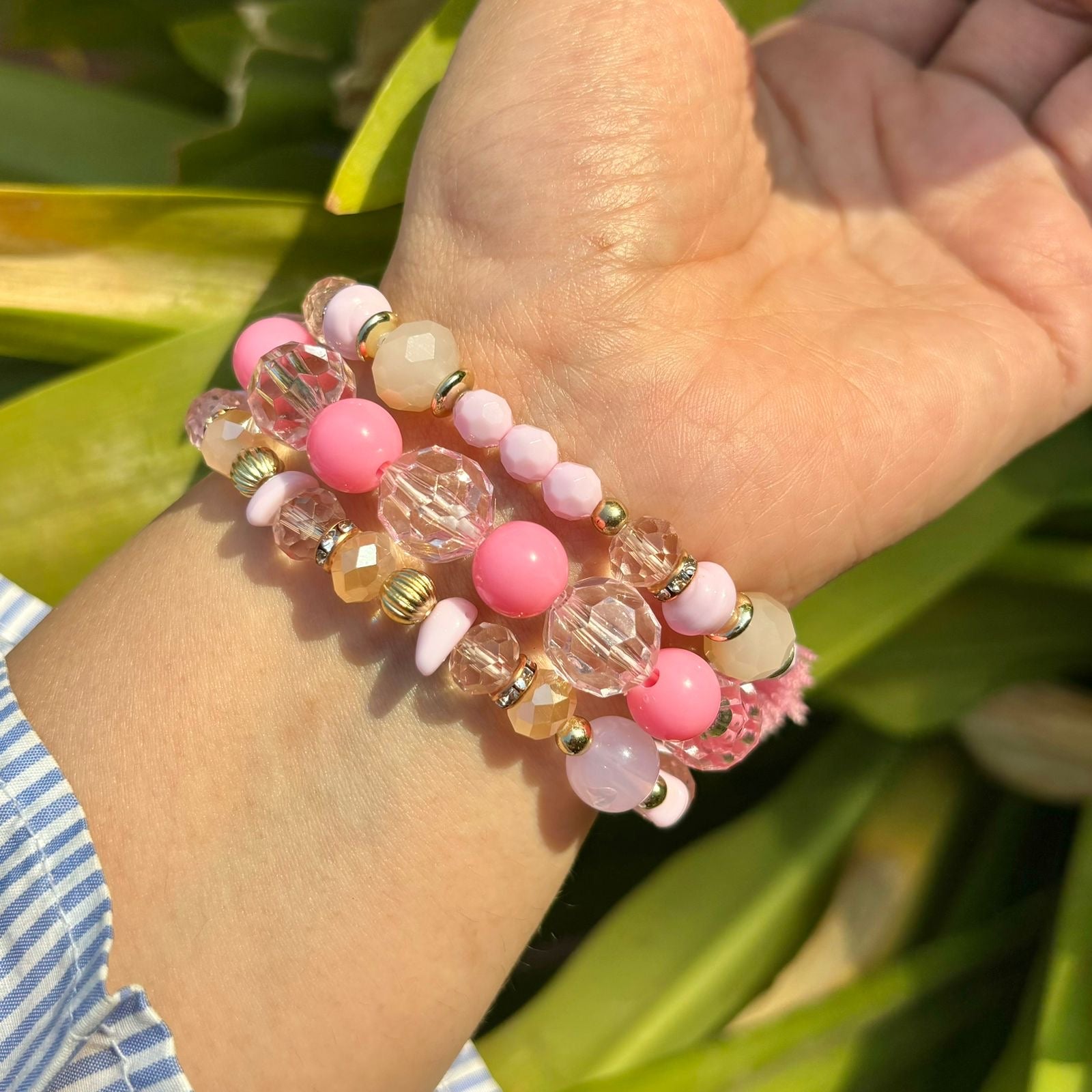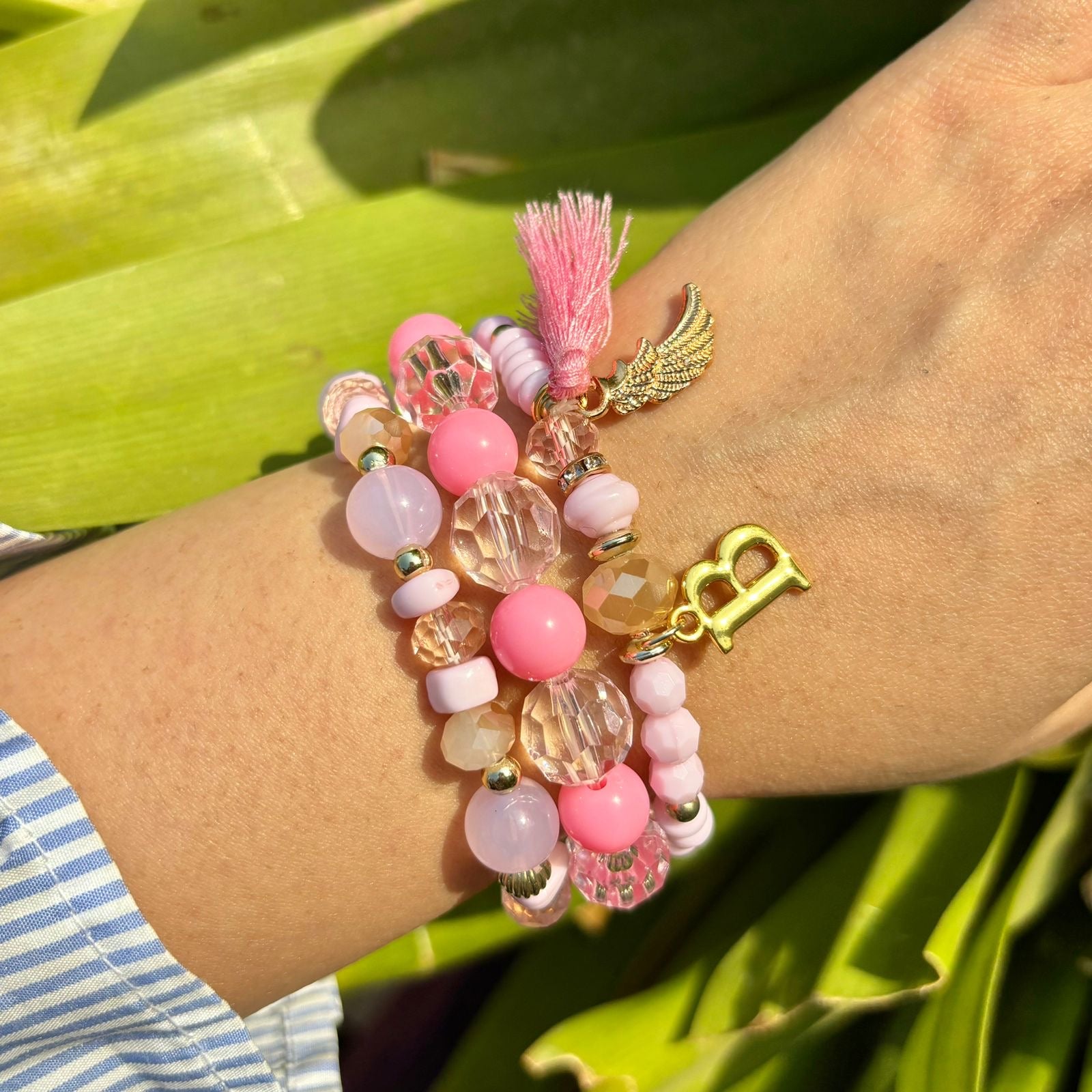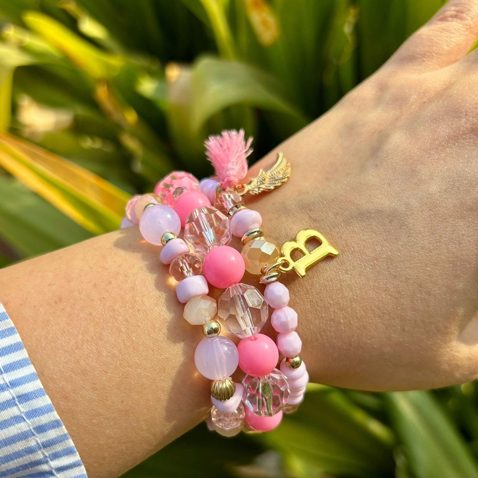 Pink Crystals Stack Elastic Bracelet With Customised Initial ( Silver )