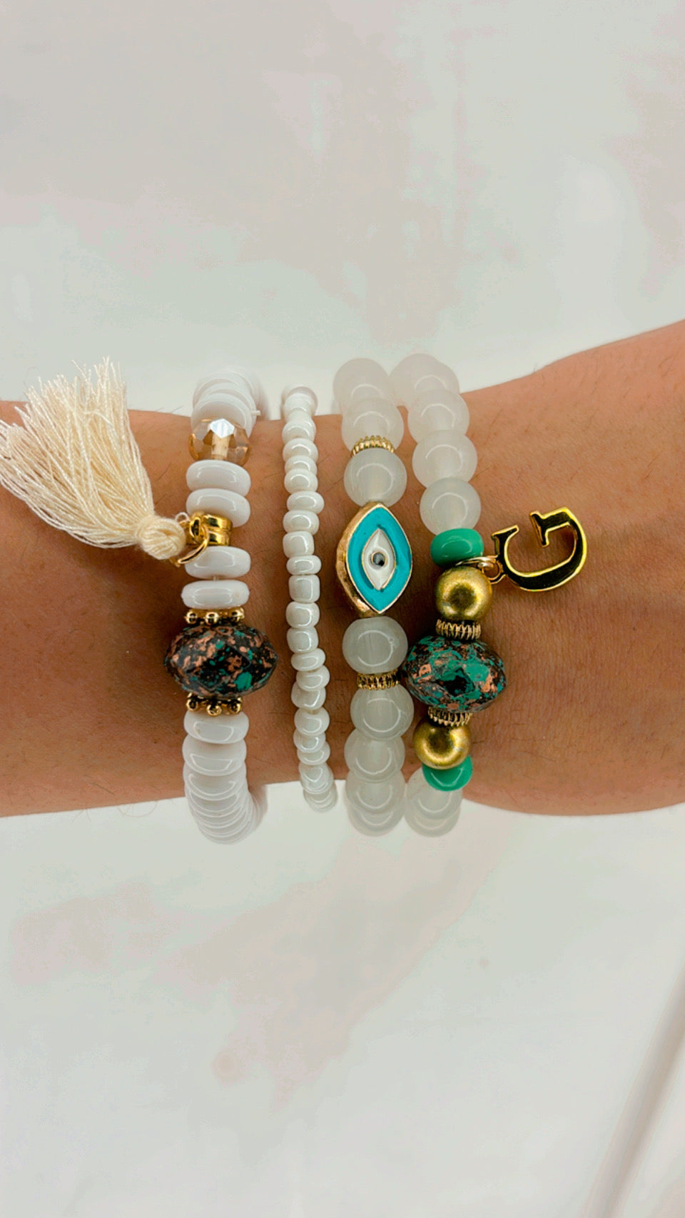 White Evil Eye Tassels Beaded Crystals Hamsa Elastic Stretchable Bracelet With Customised Initial Alphabet Unisex for Men / Women