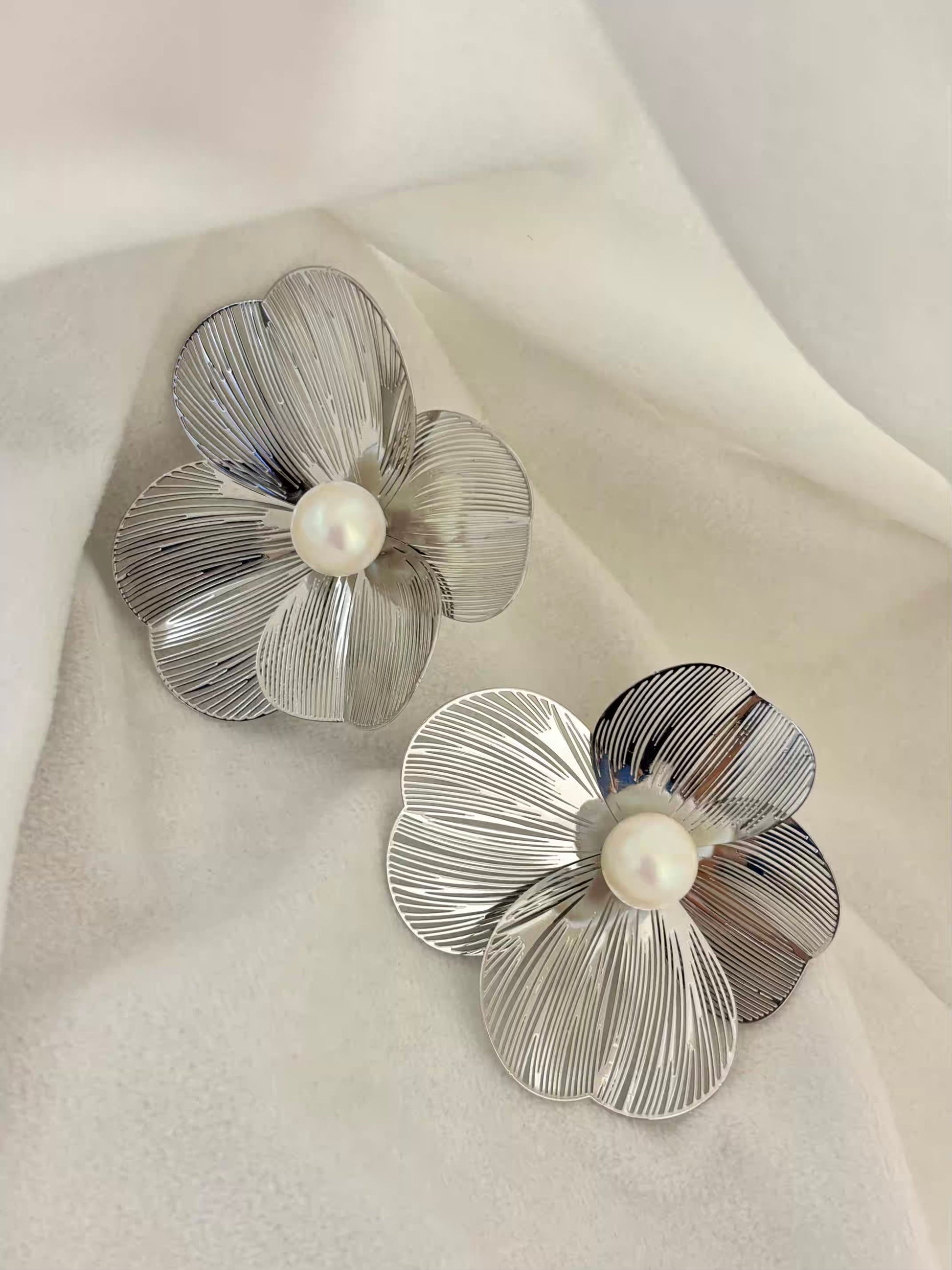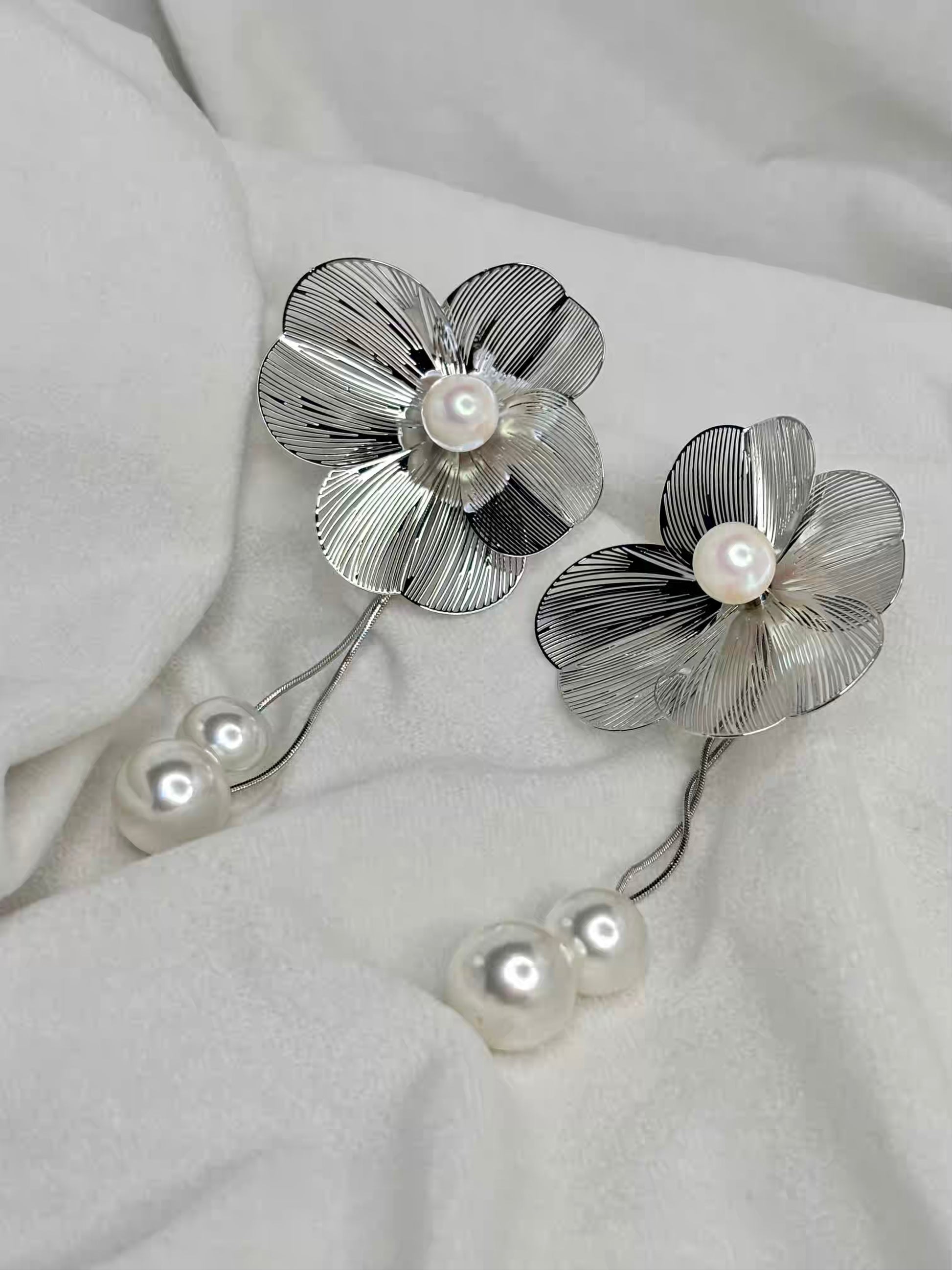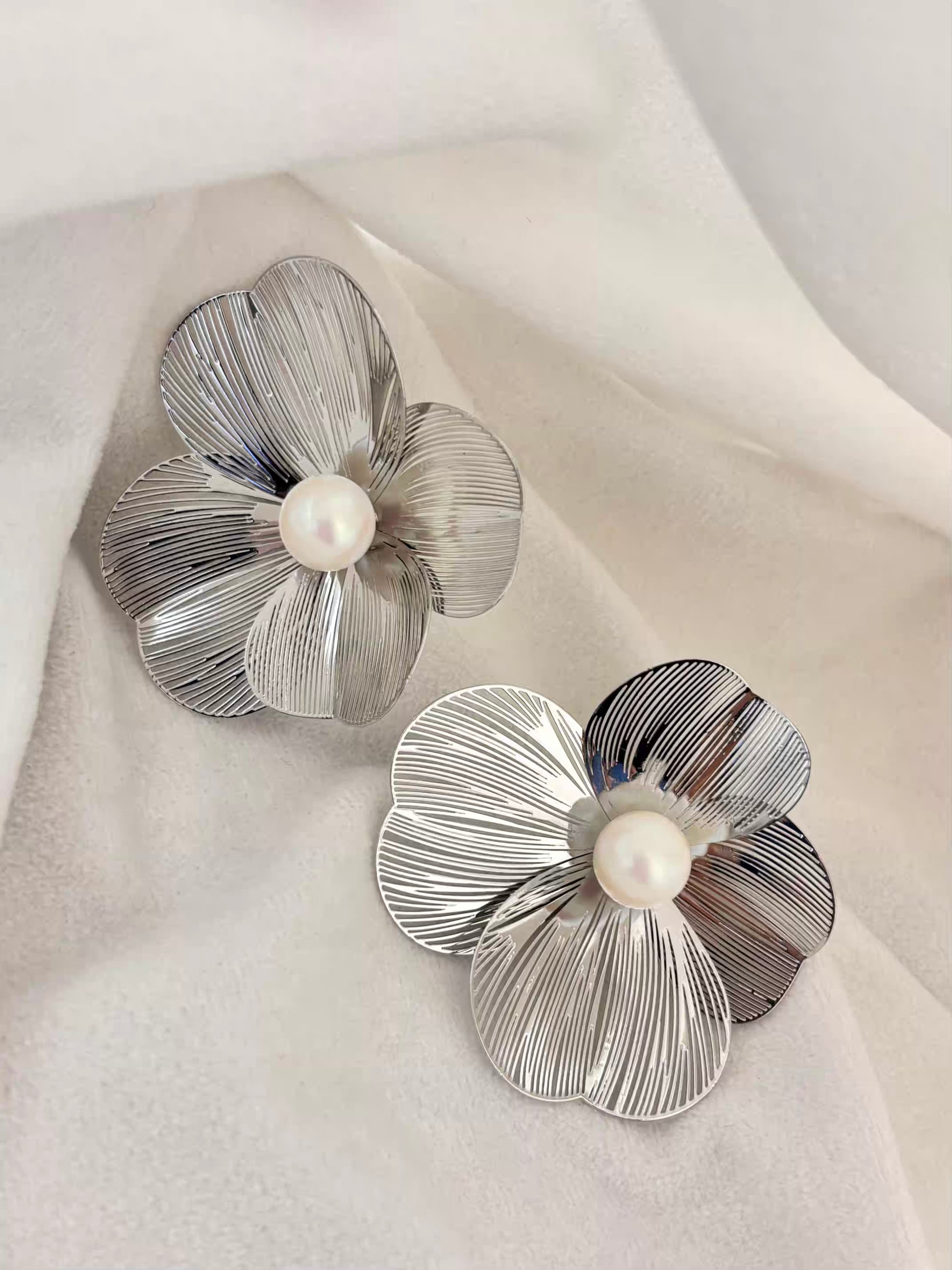 Wired Flower Fresh Pearls Earrings Studs - Silver Plated