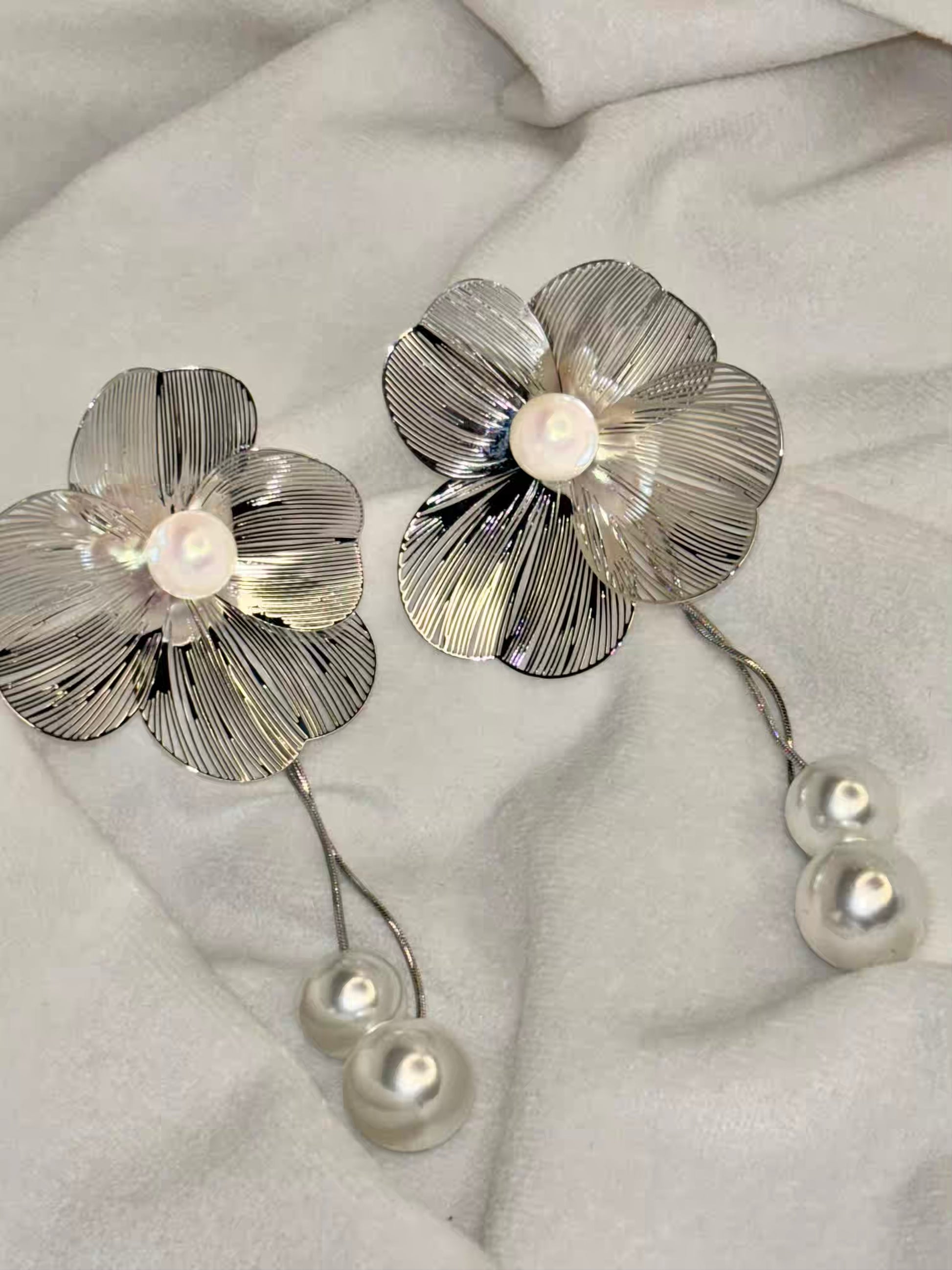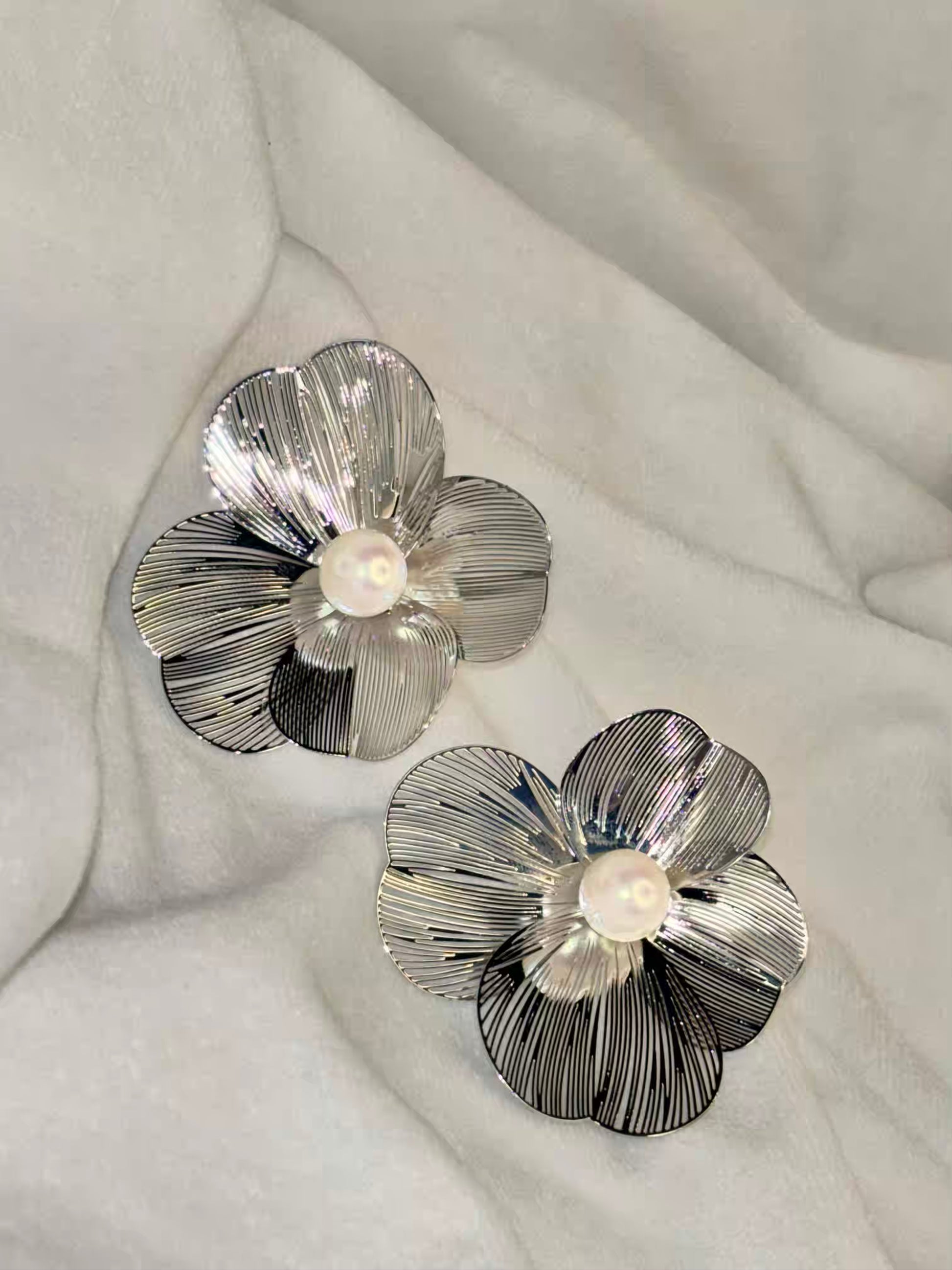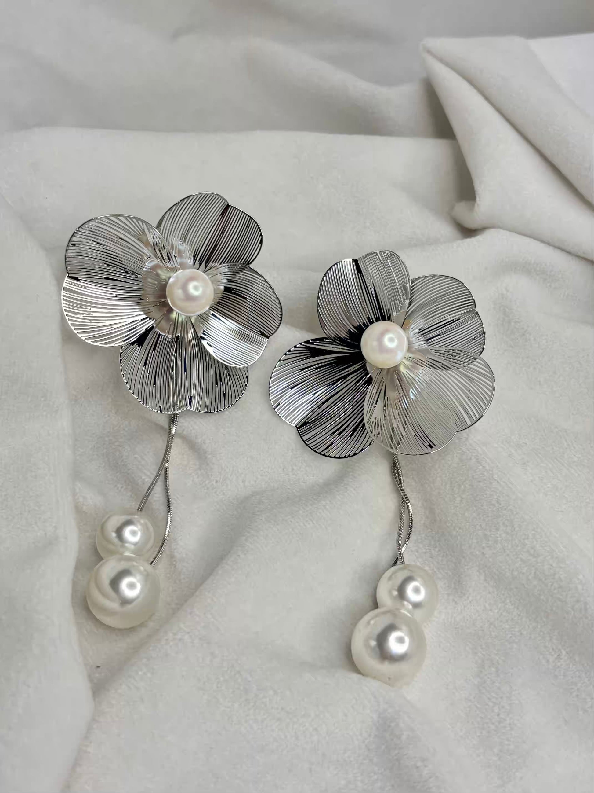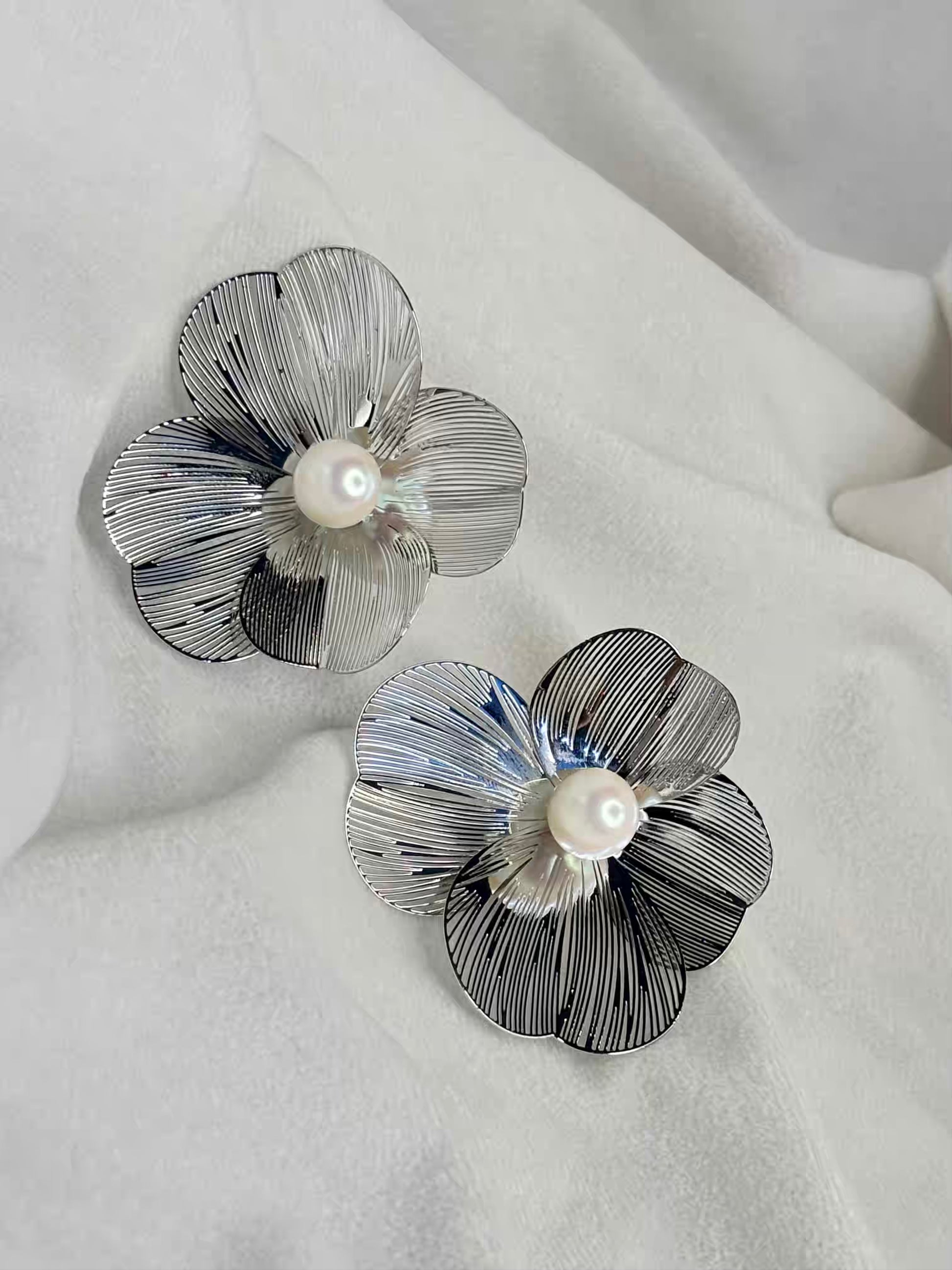 Wired Flower Fresh Pearls Earrings Studs - Silver Plated