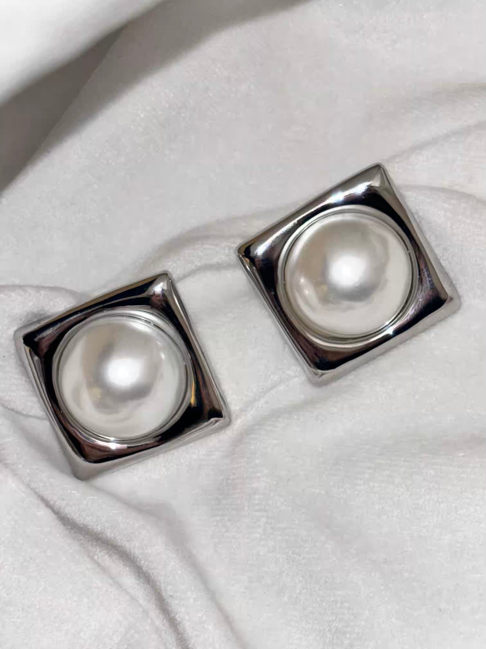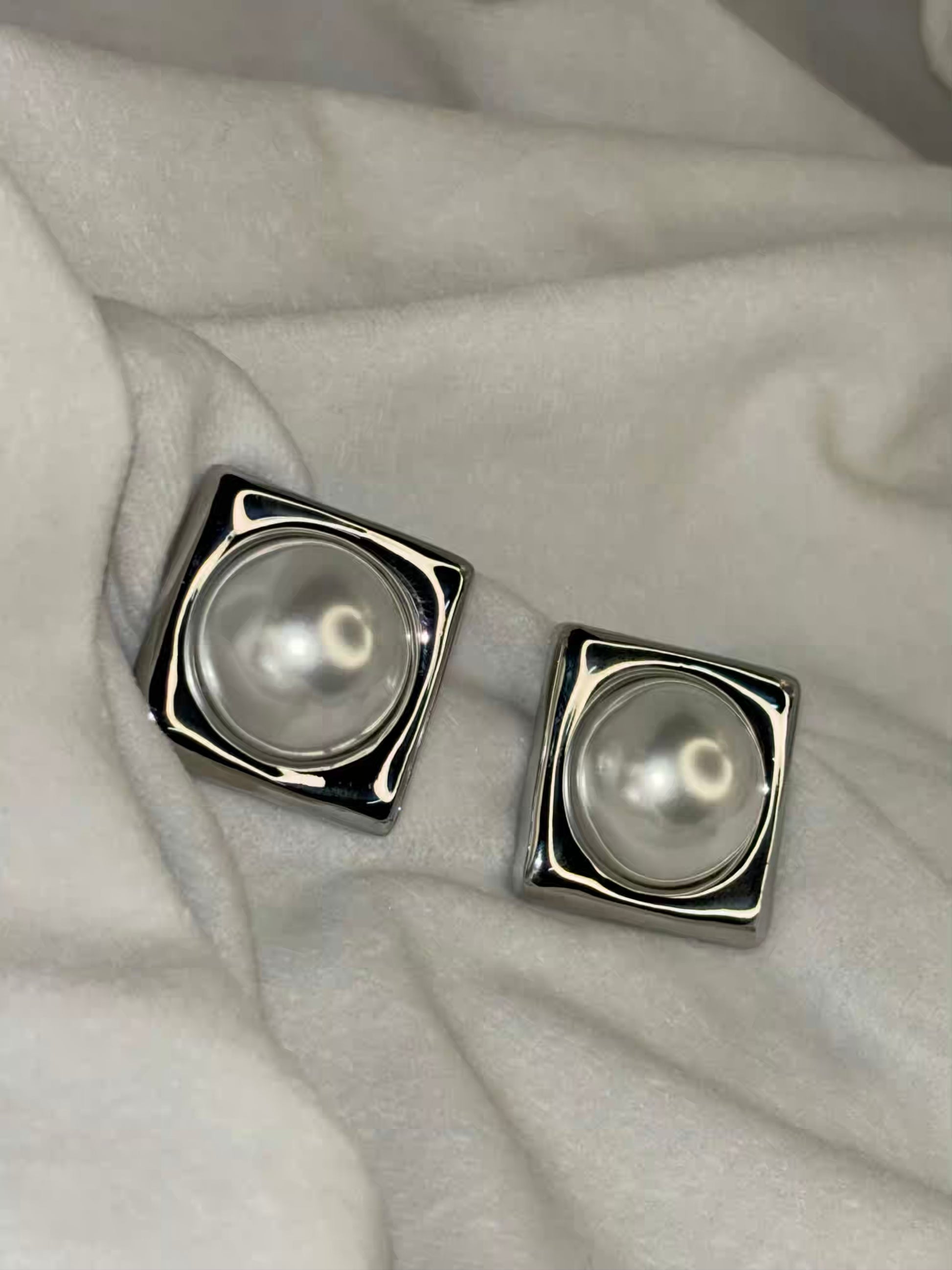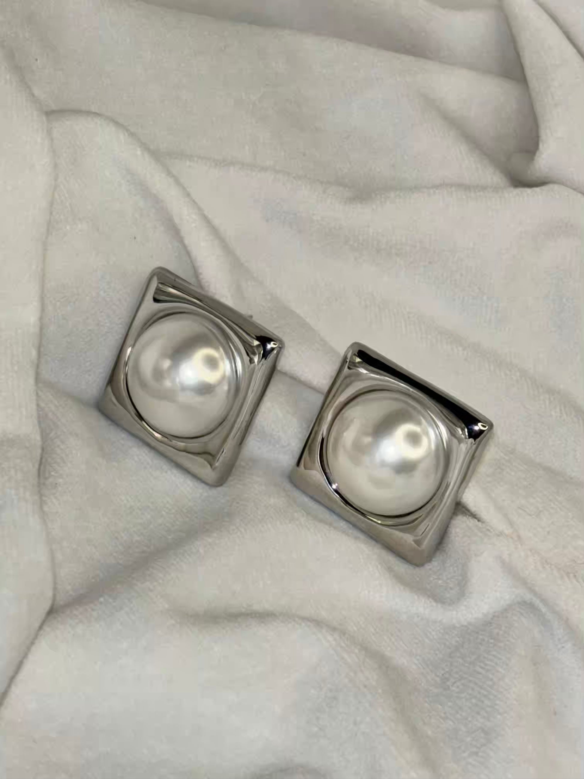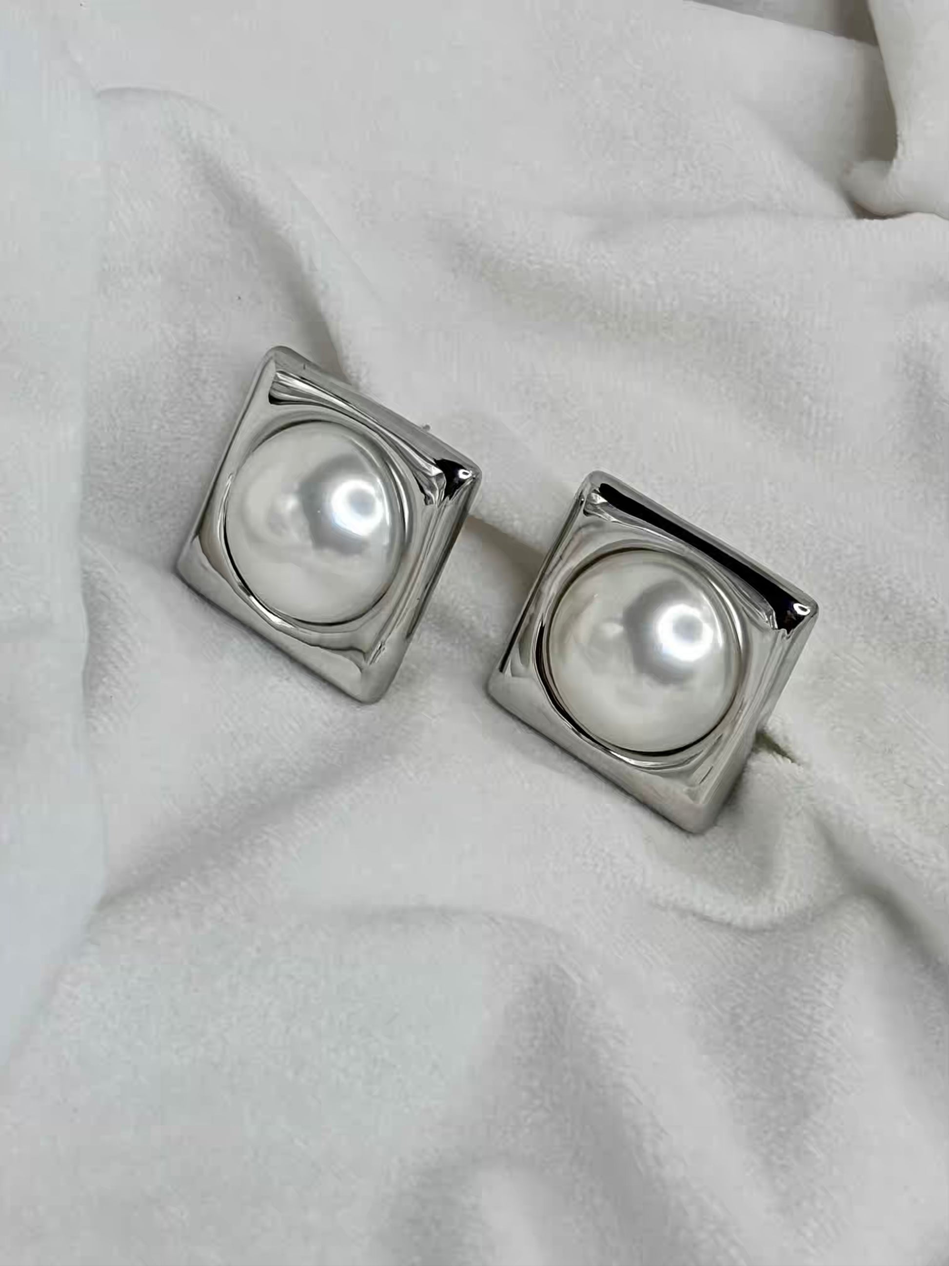Silver Box Pearl Earrings Studs - Silver Plated