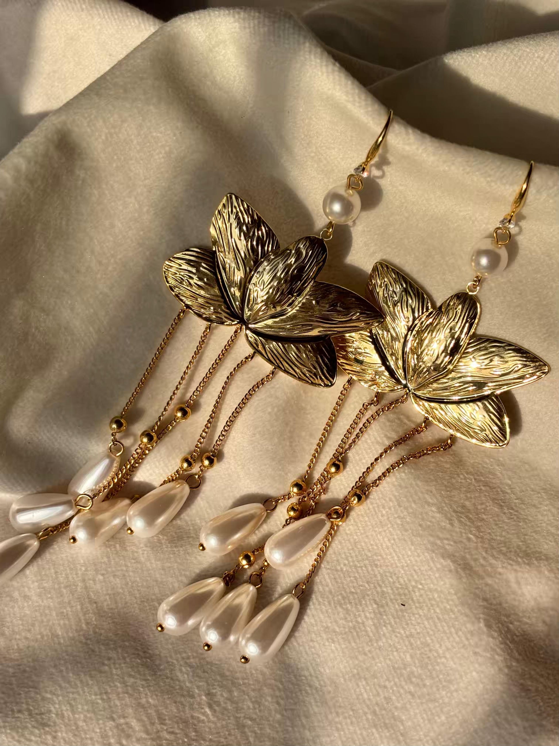 Lotus Pearl Dangles Studds Earrings 18K Gold Plated Premium Earrings