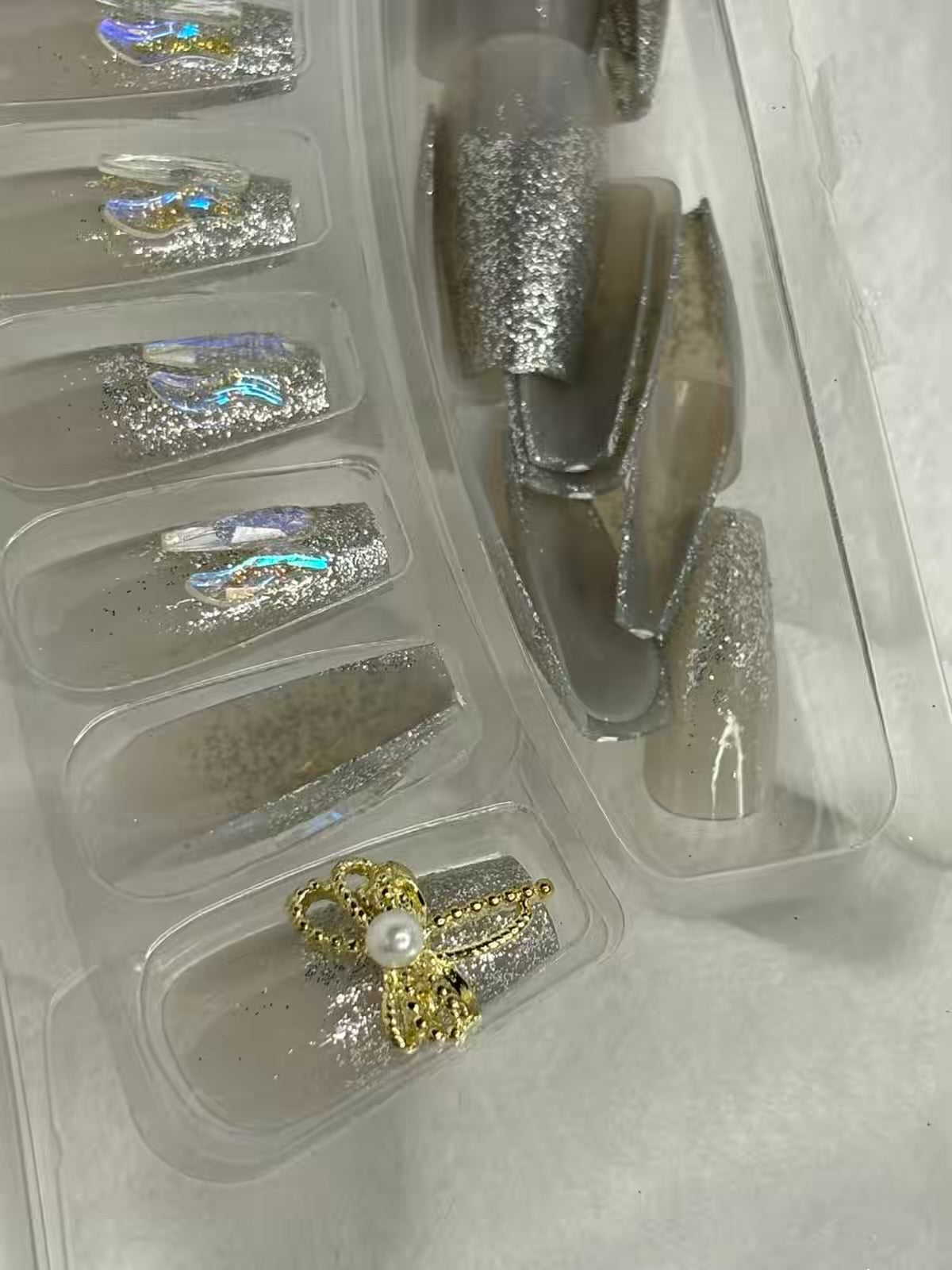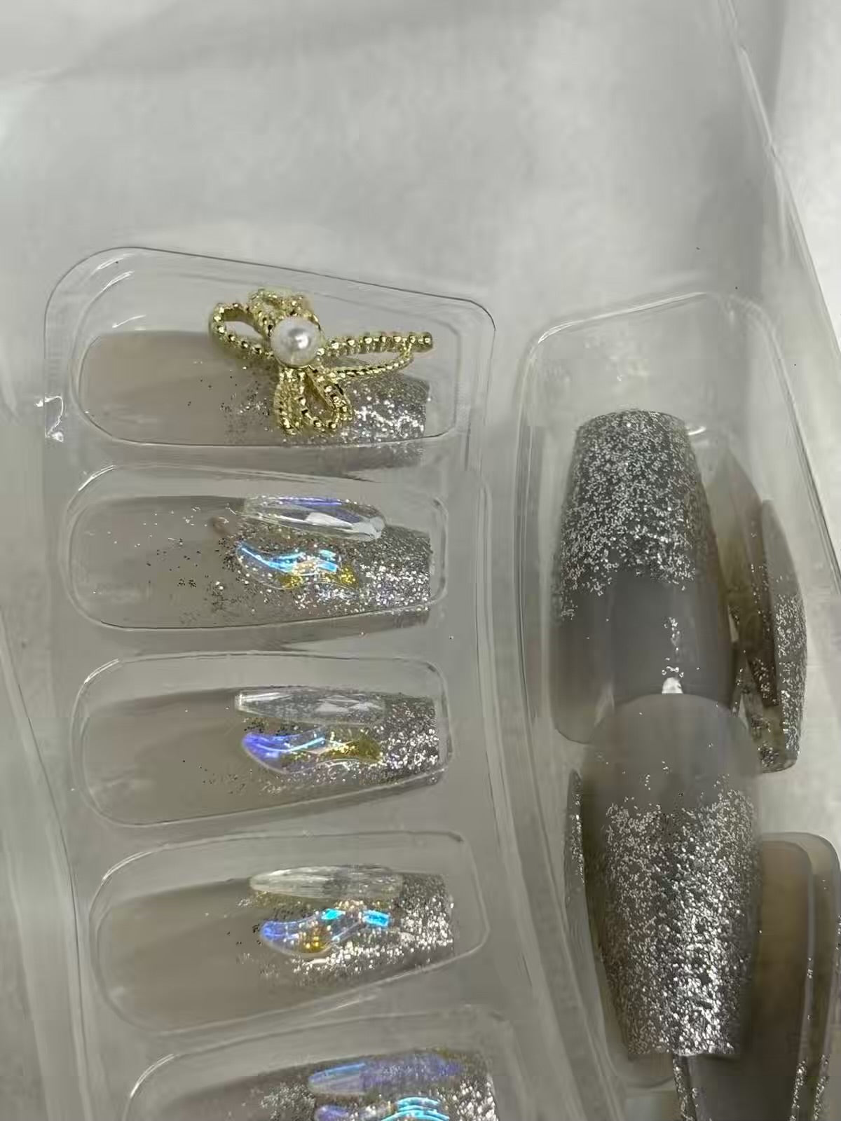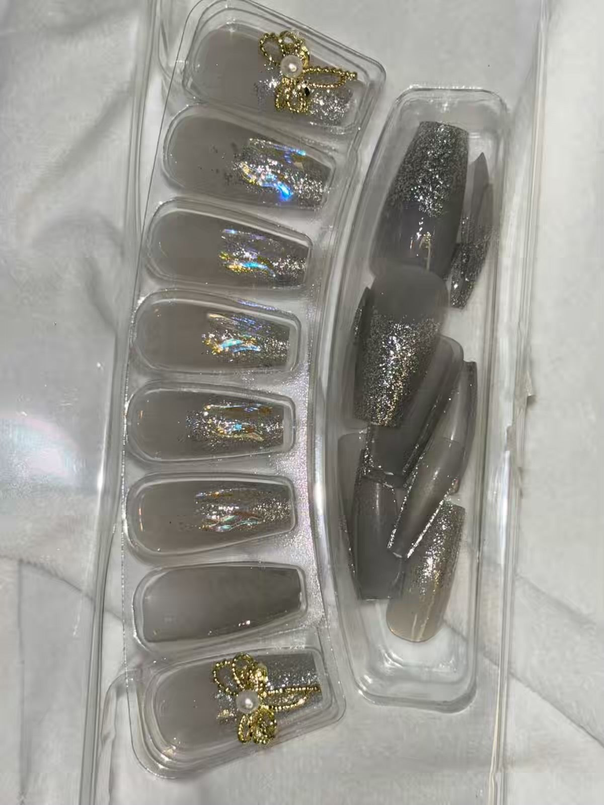 Grey Bows Shimmery Fancy Party Bridal Press On Nails ( Set of 24 )
