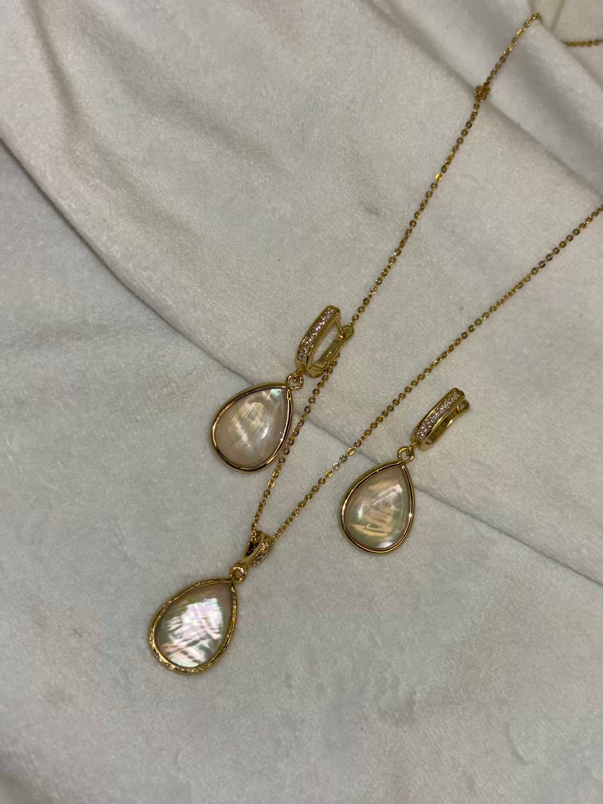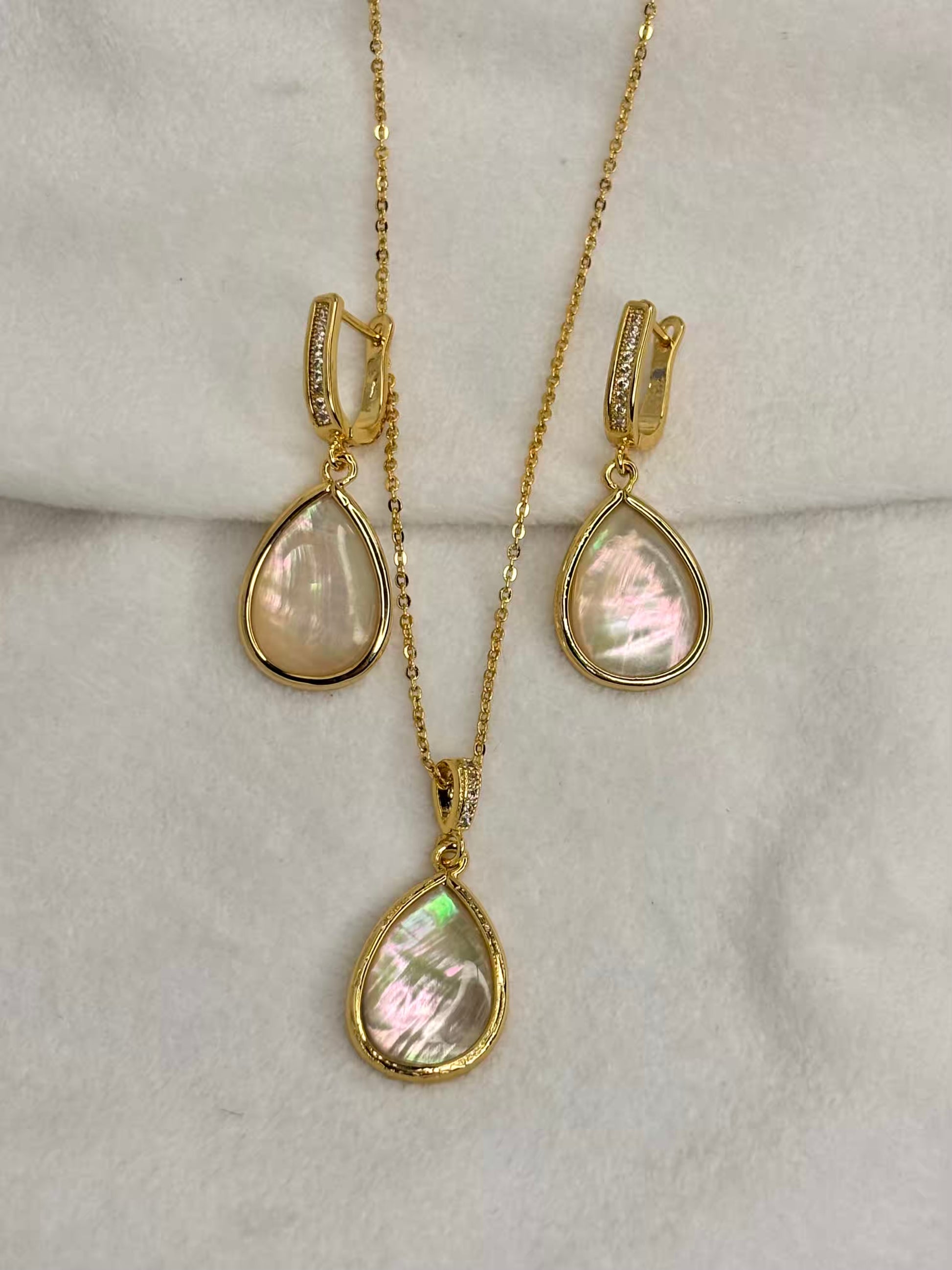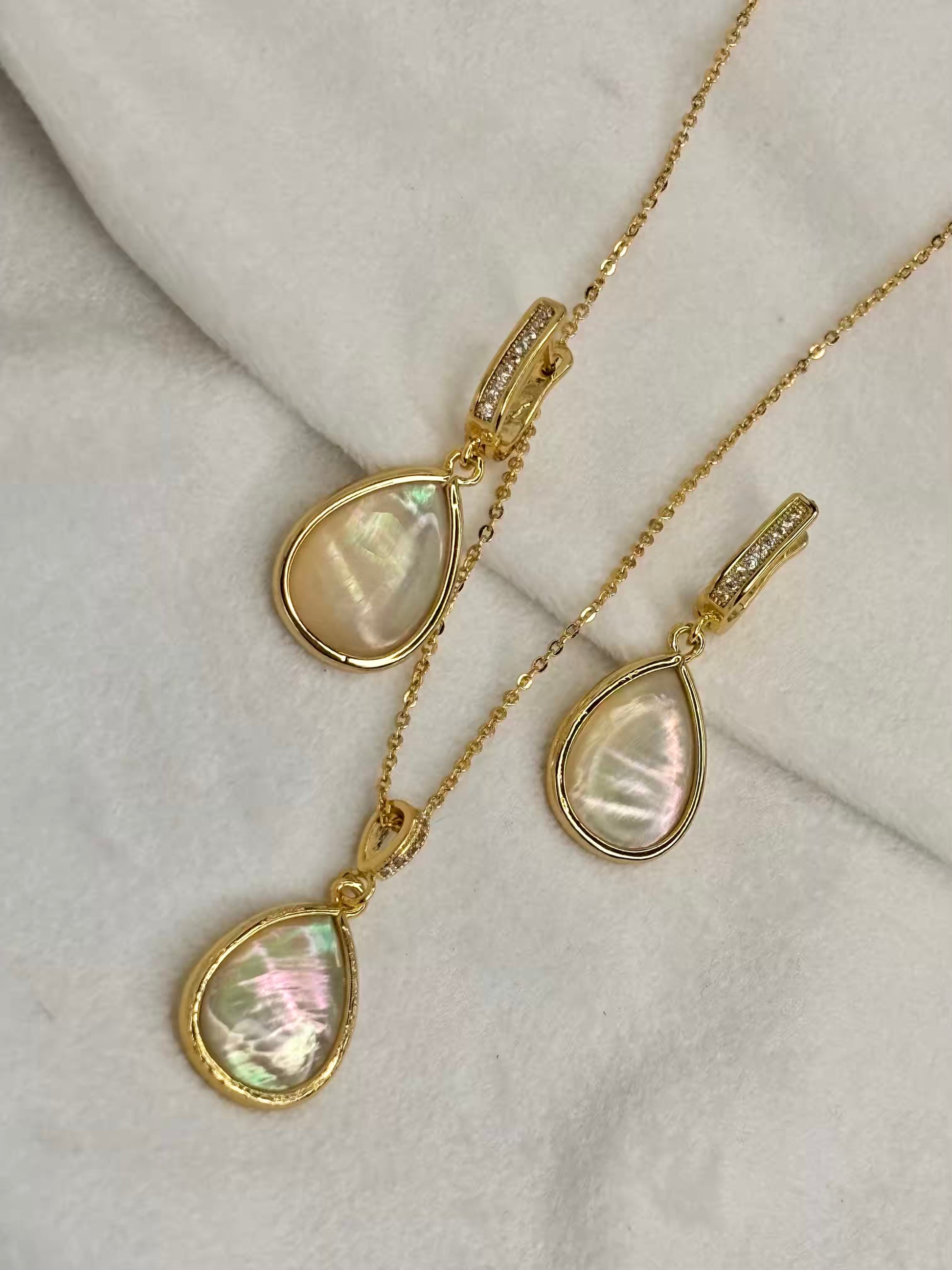 Rainbow Holographic Pearl Tear Drop Necklace with Ear Studs Gold Plated )