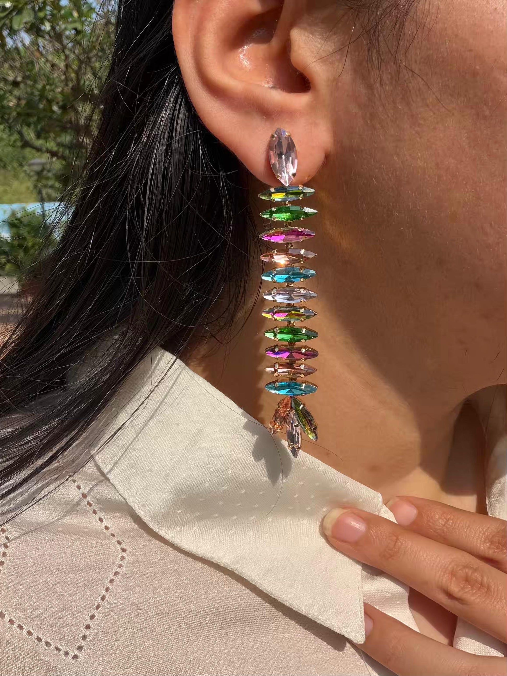 Long Stone Chain Multicolour Gold Plated Earrings