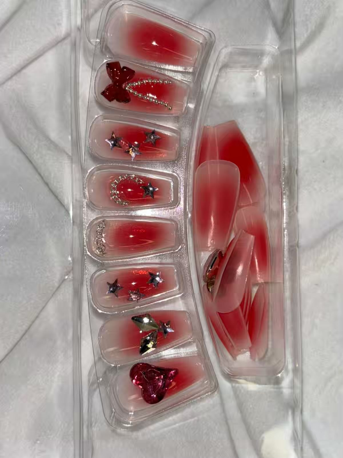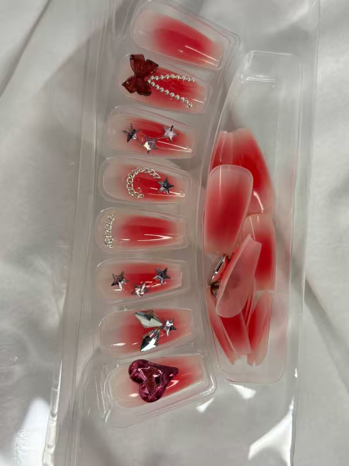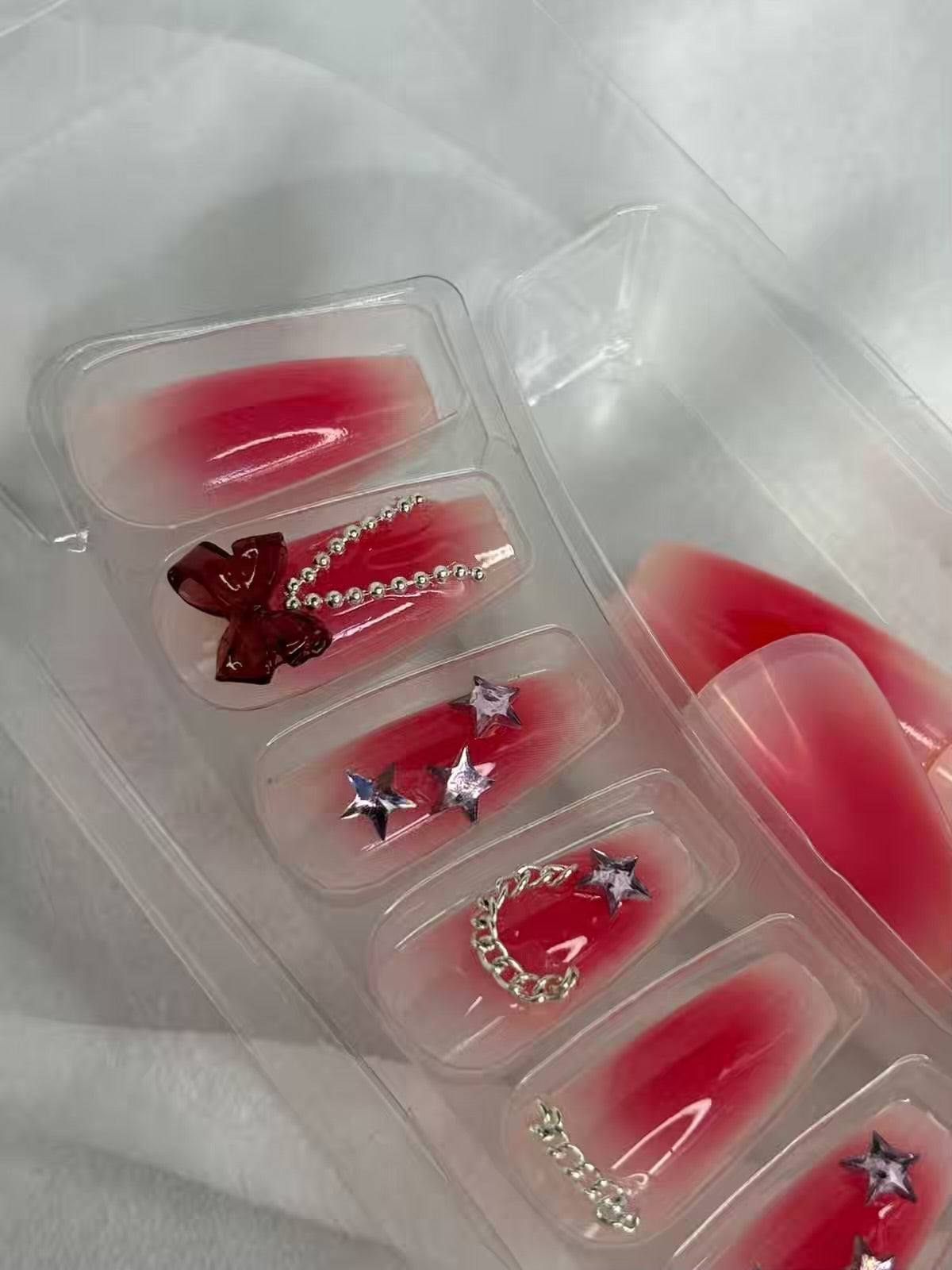 Red Chains Bows Shimmery Fancy Party Bridal Press On Nails ( Set of 24 )