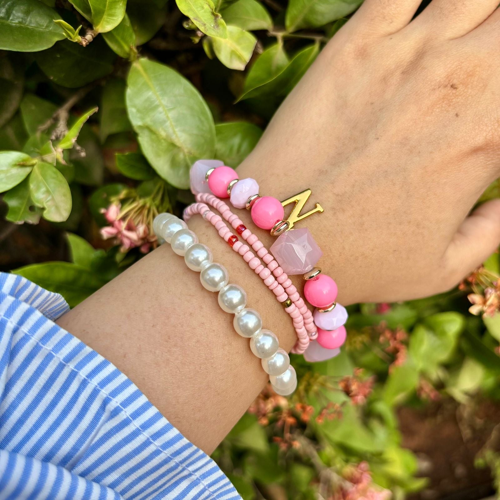 Fuscia Pink Blush Pearl Beaded Stack Elastic Bracelet With Customised Initial ( Gold )