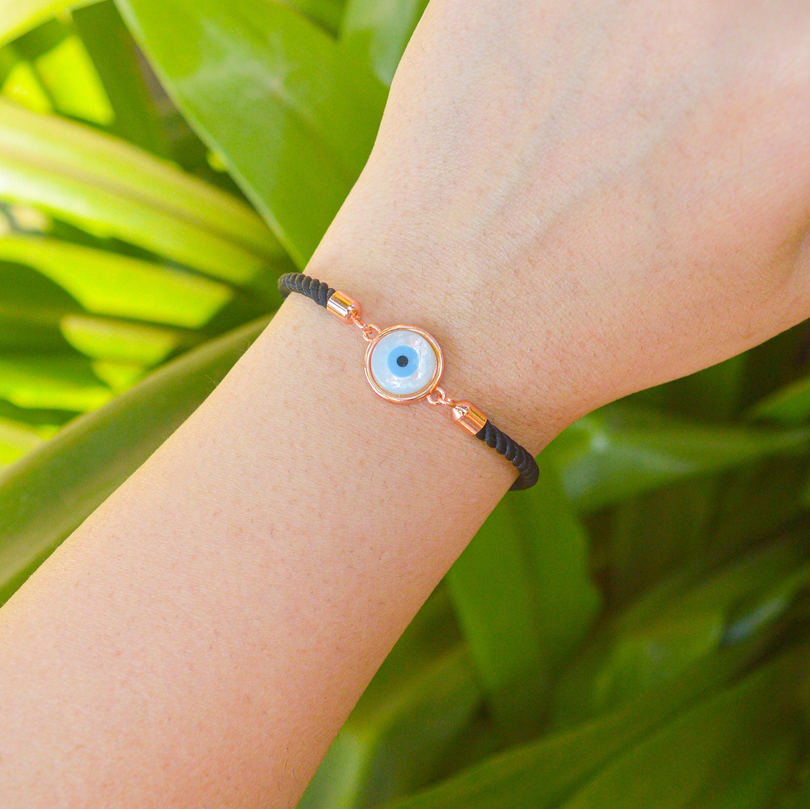 Pearl Evil Eye Black Band Bracelet (Rose Gold)