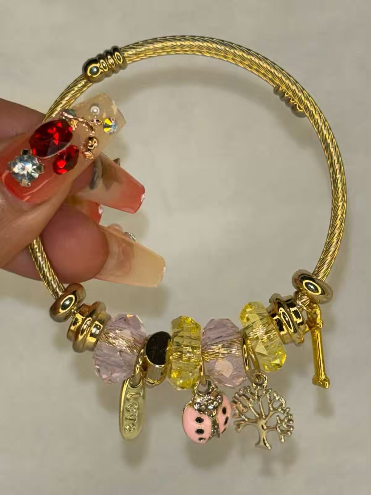 Pandora Charms Pink Bug Tree Bracelet With Customised Initial ( Gold )