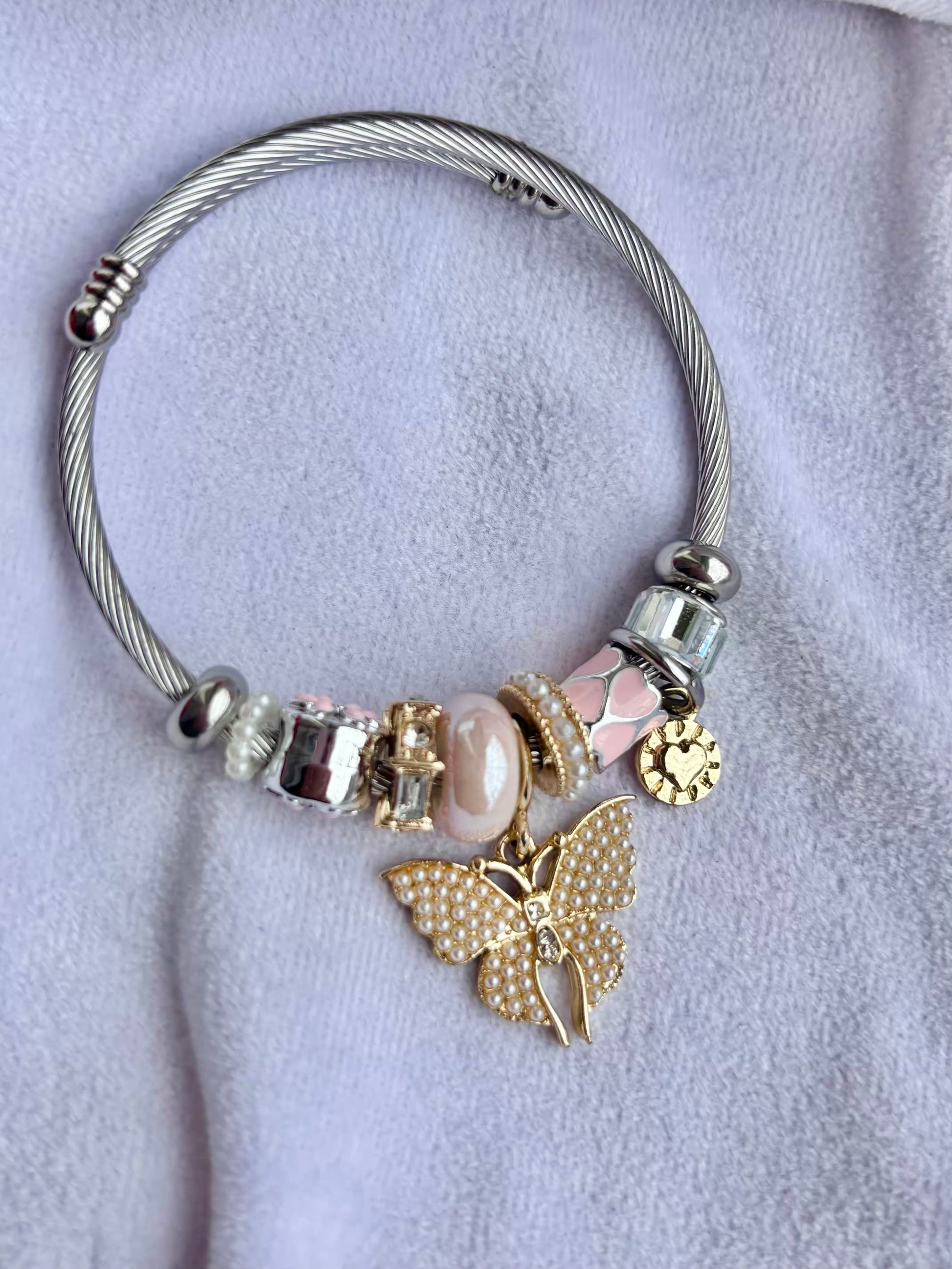 Pandora Charms Pink Butterfly Bracelet With Customised Initial ( Silver )