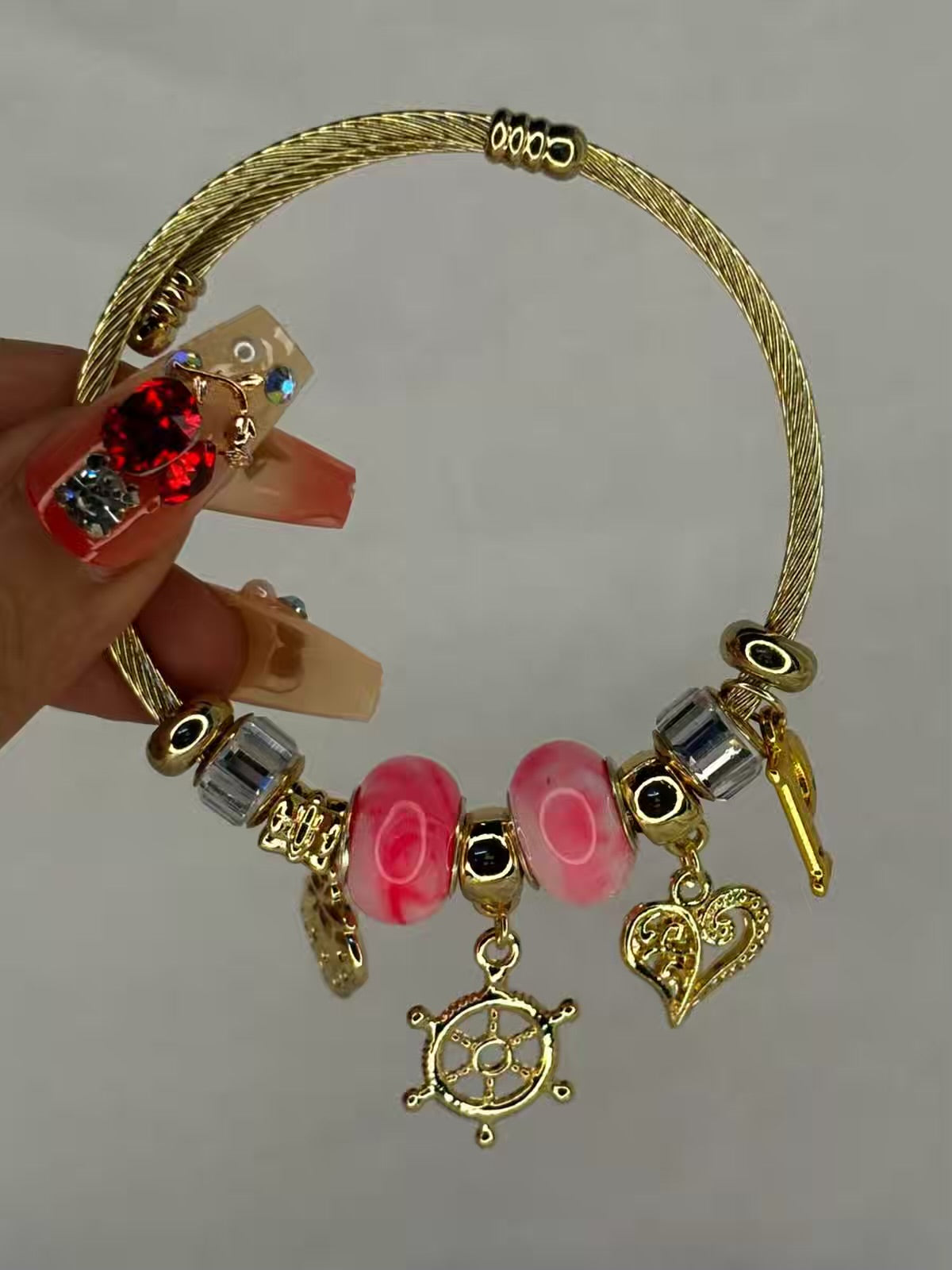 Pandora Charms Pink Anchor Bracelet With Customised Initial ( Gold )