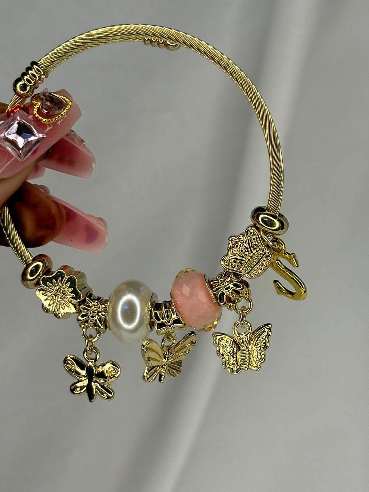 Pandora Style Peach Butterfly Charms Bracelet With Customised Initial ( Gold )