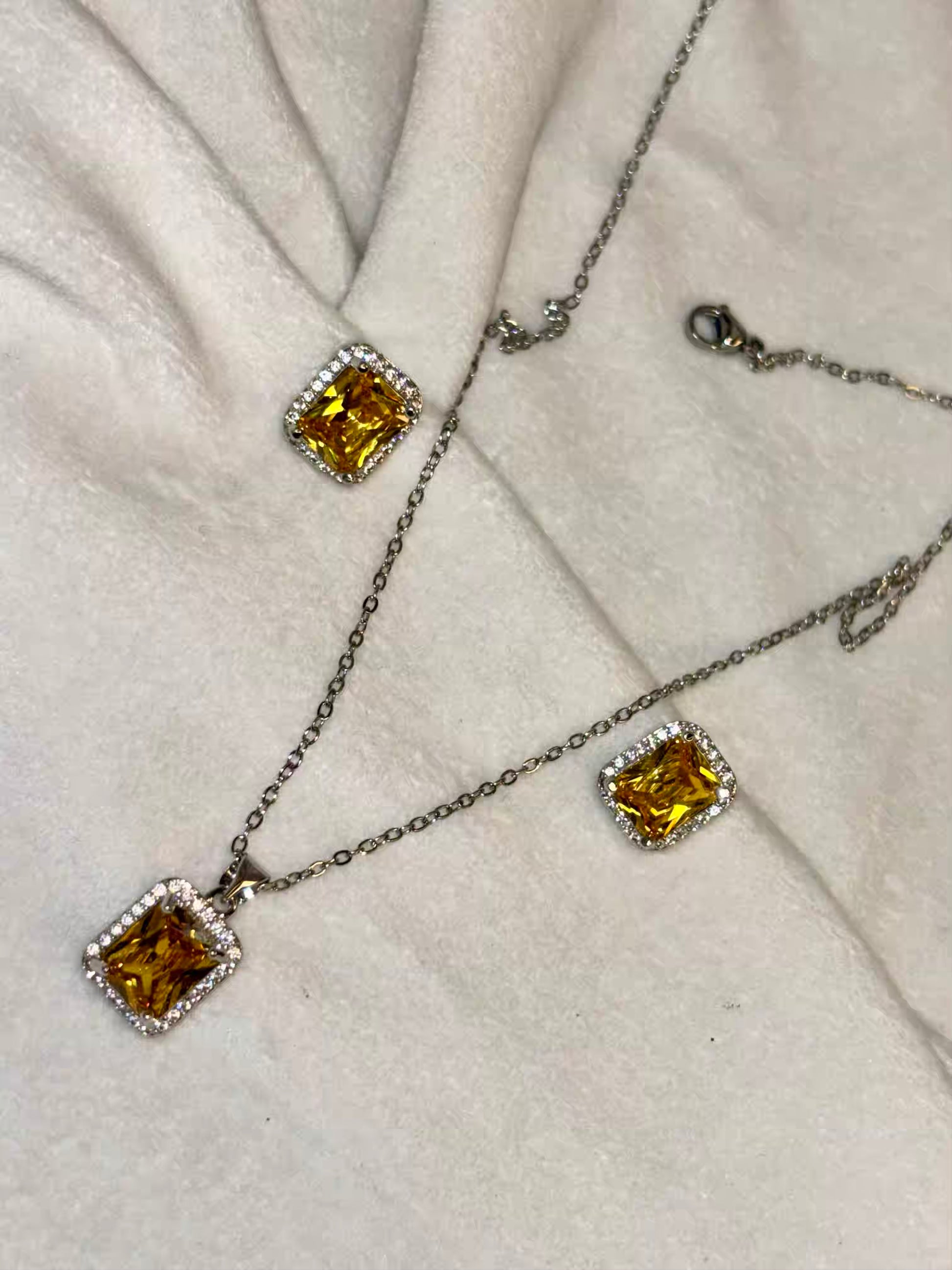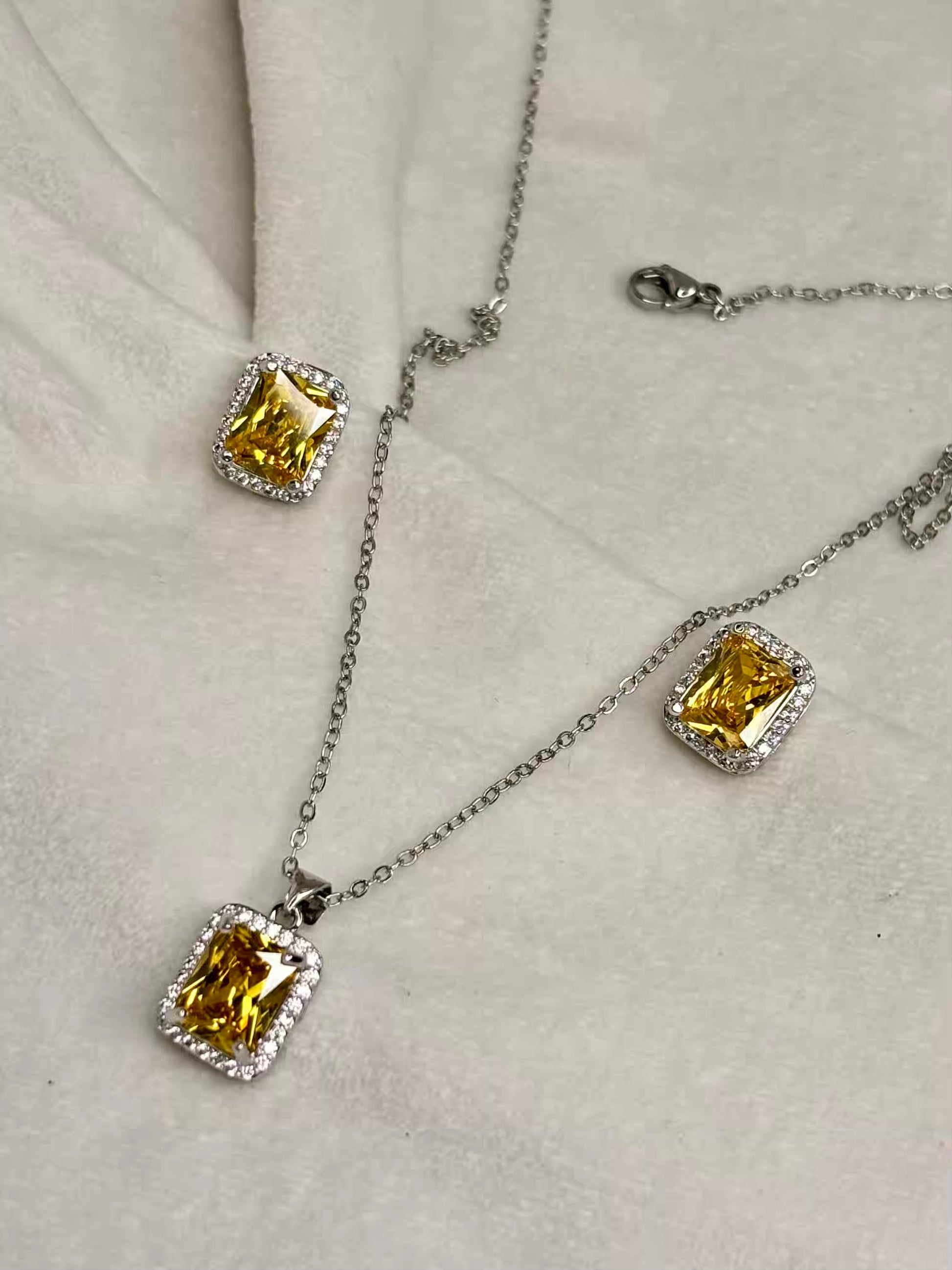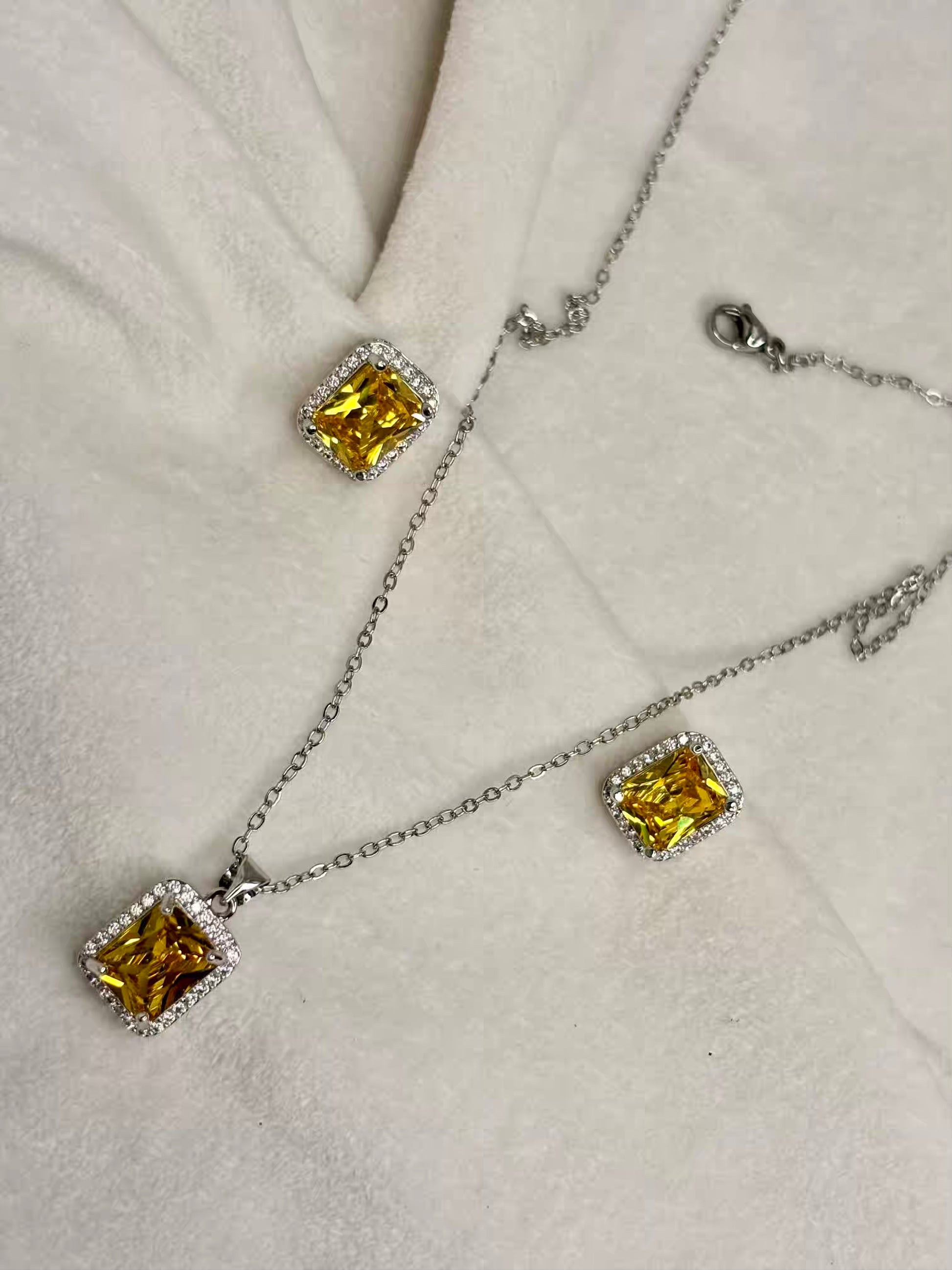 Citrine Yellow Diamond Necklace Ear Studs Set - Silver Plated