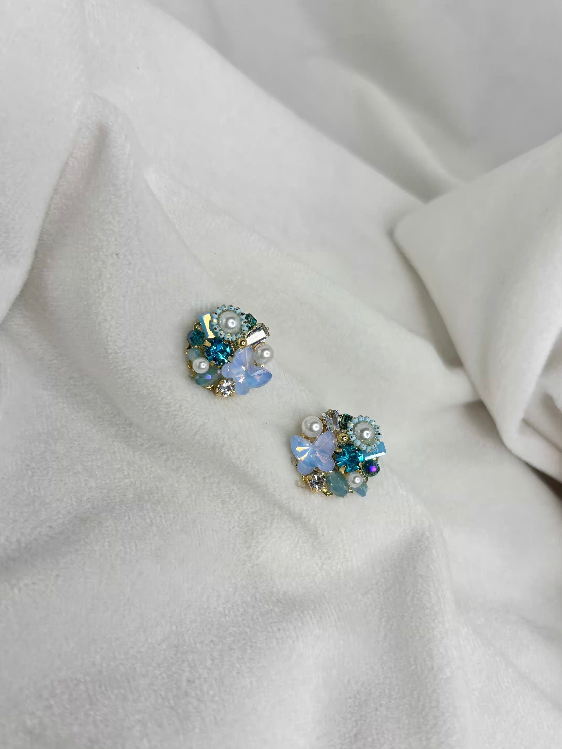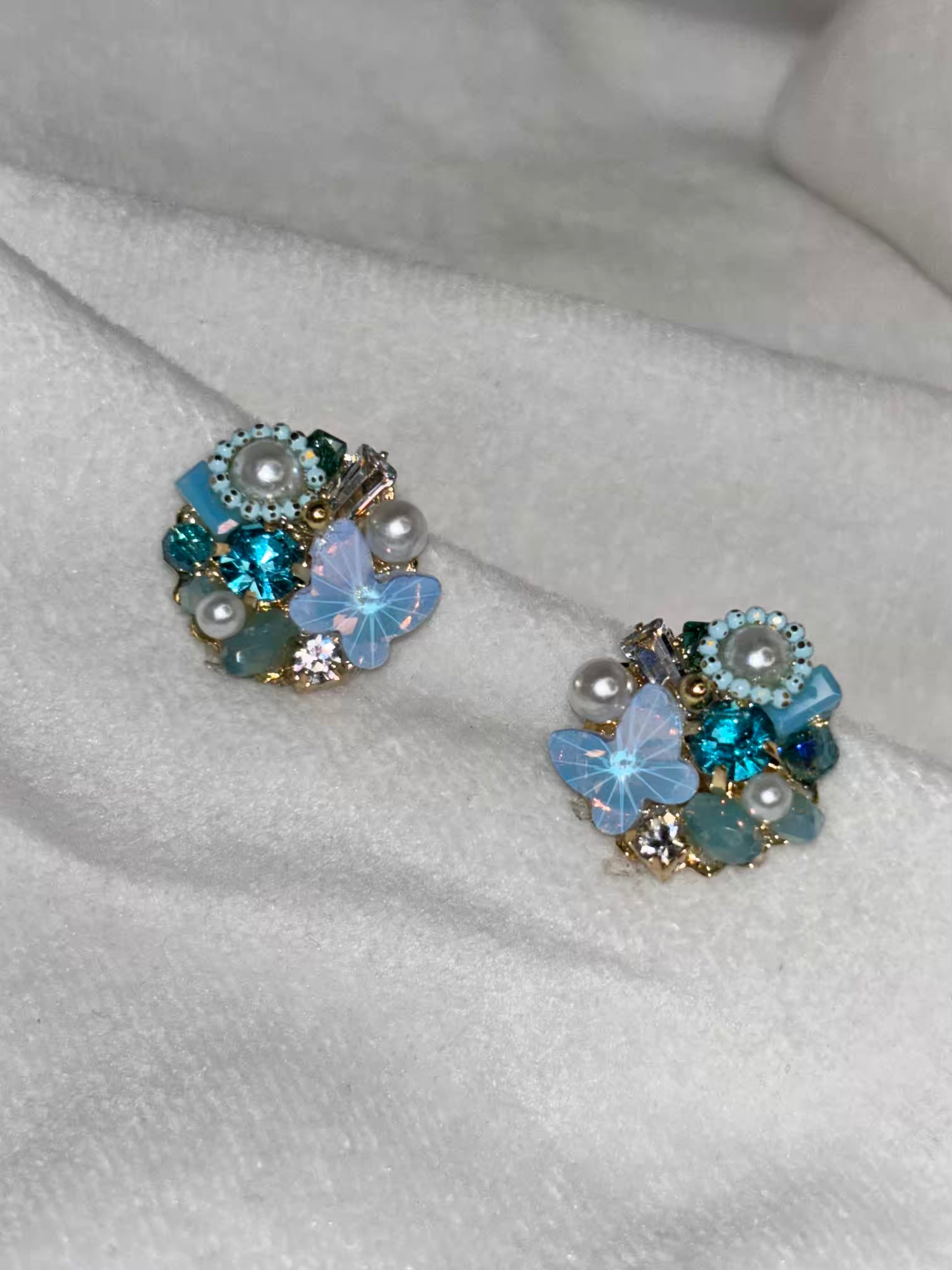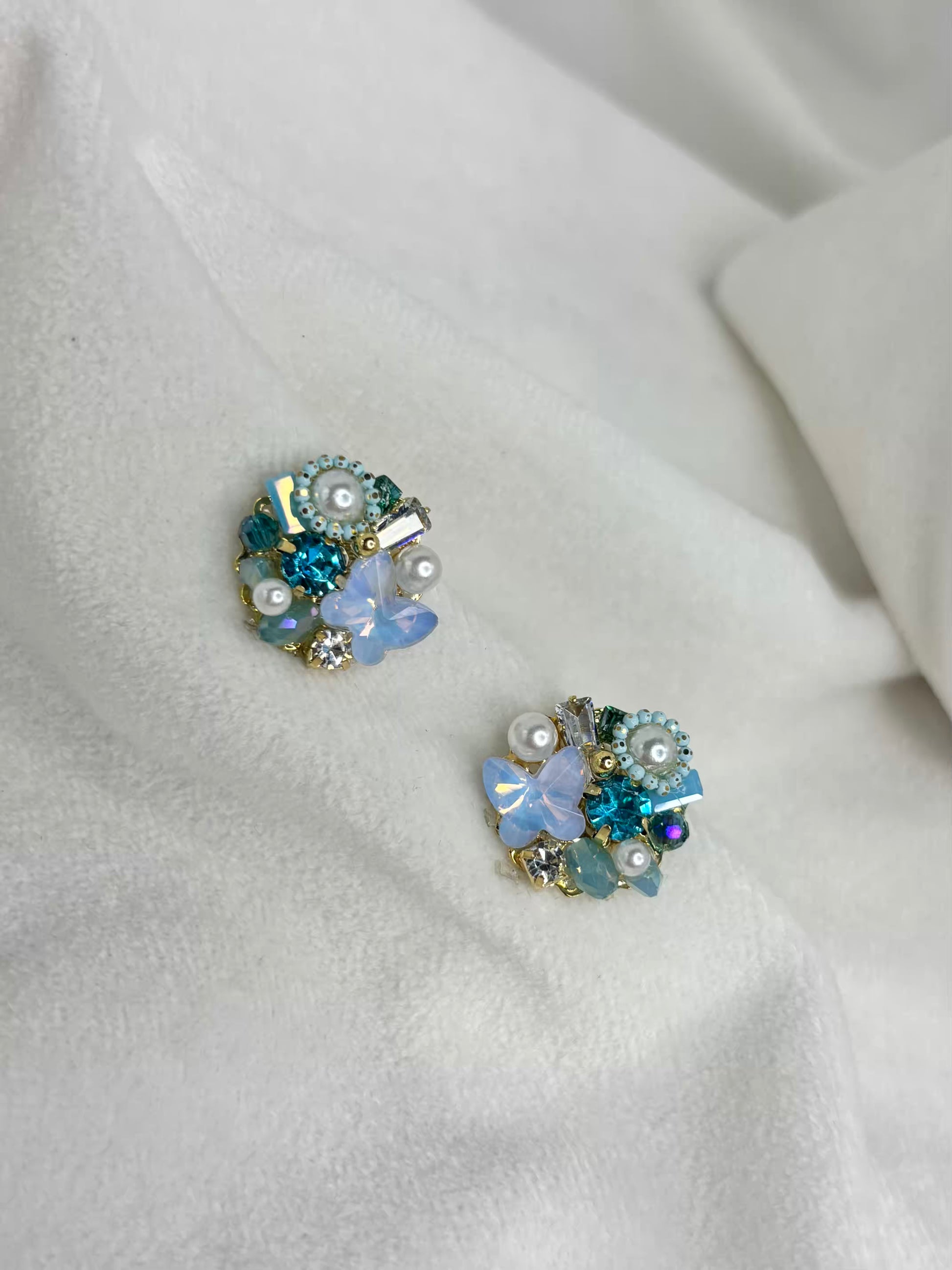 Blue Butterfly Small Pearly Earrings Studs - Gold Plated