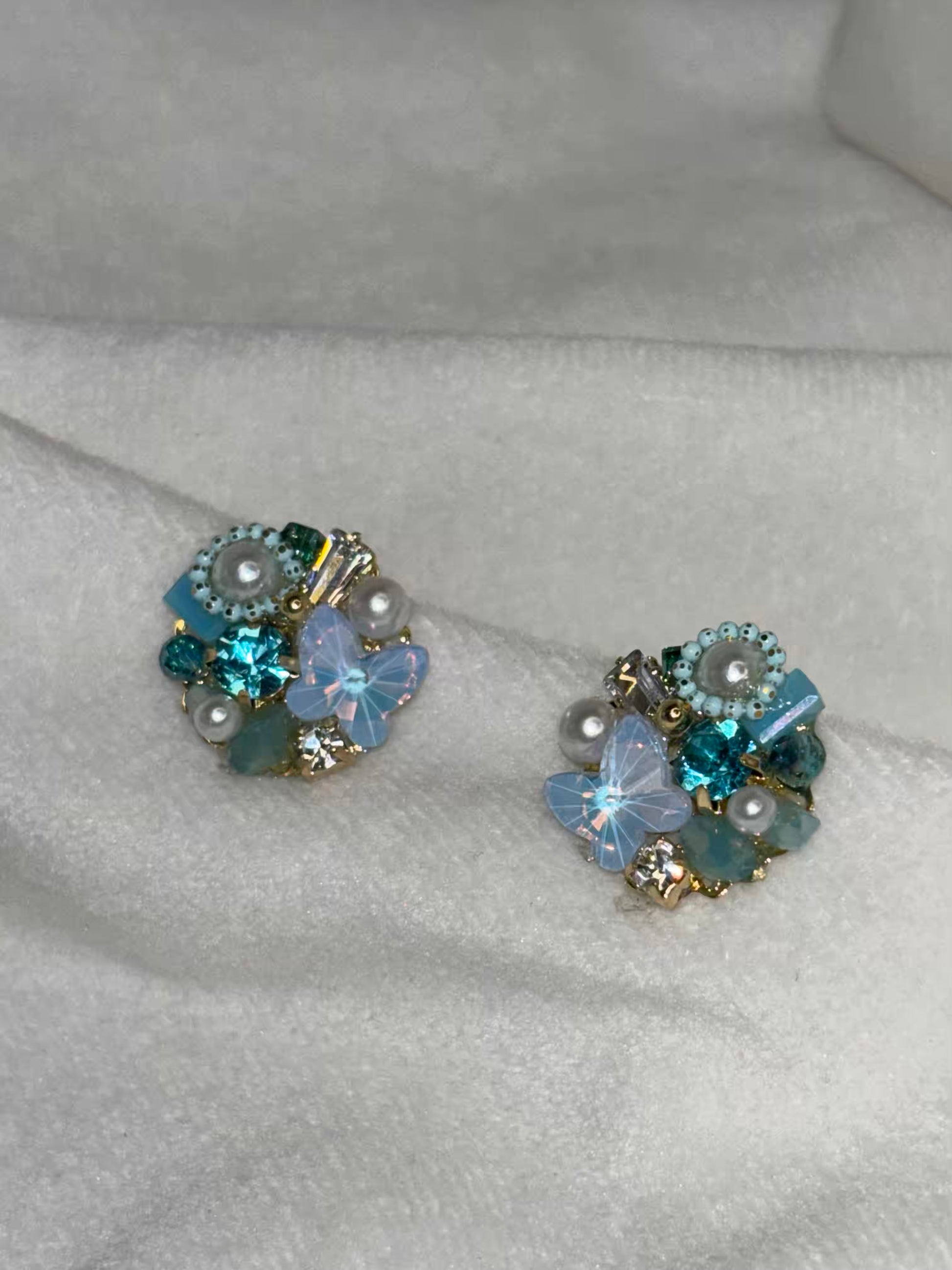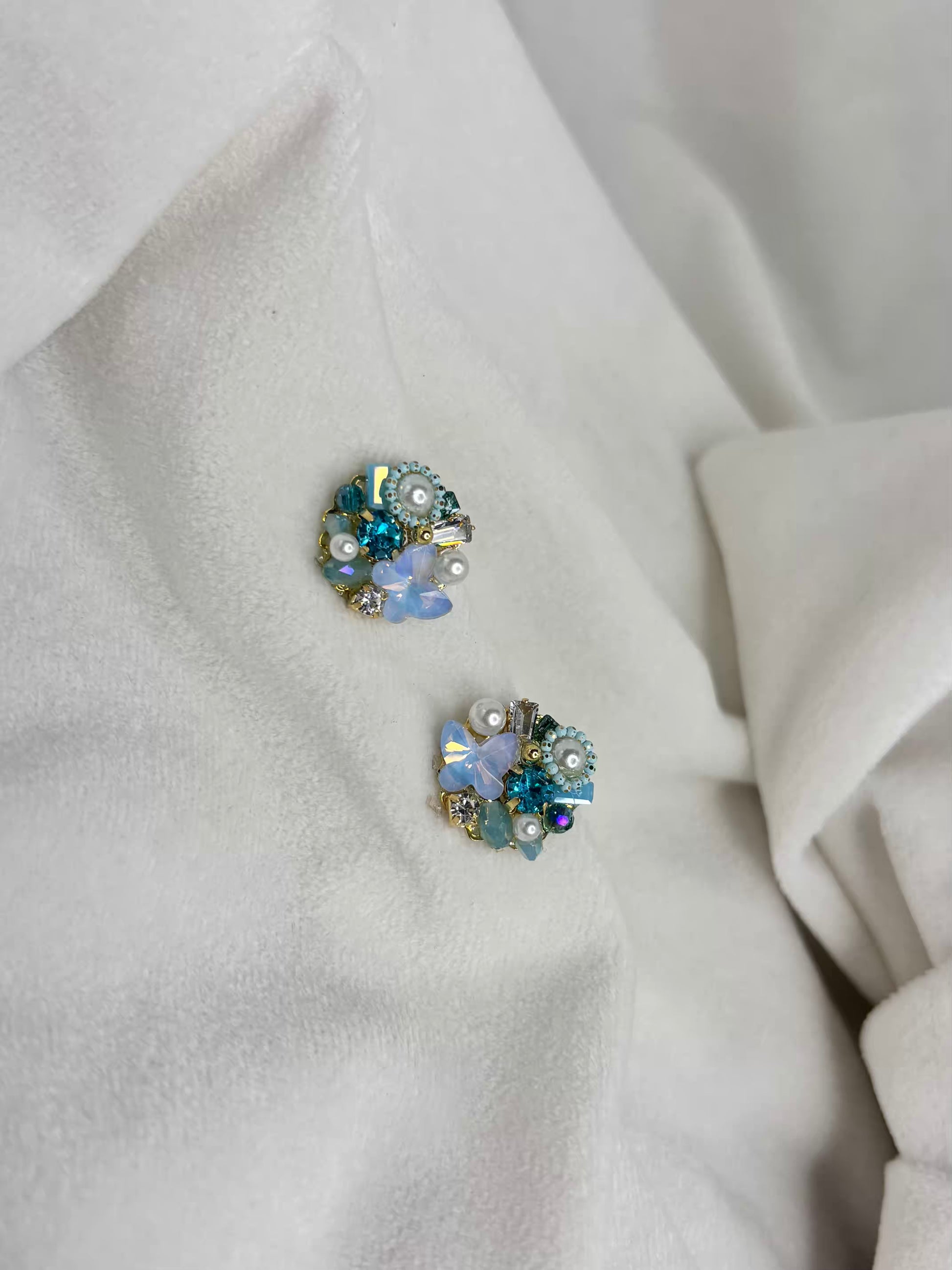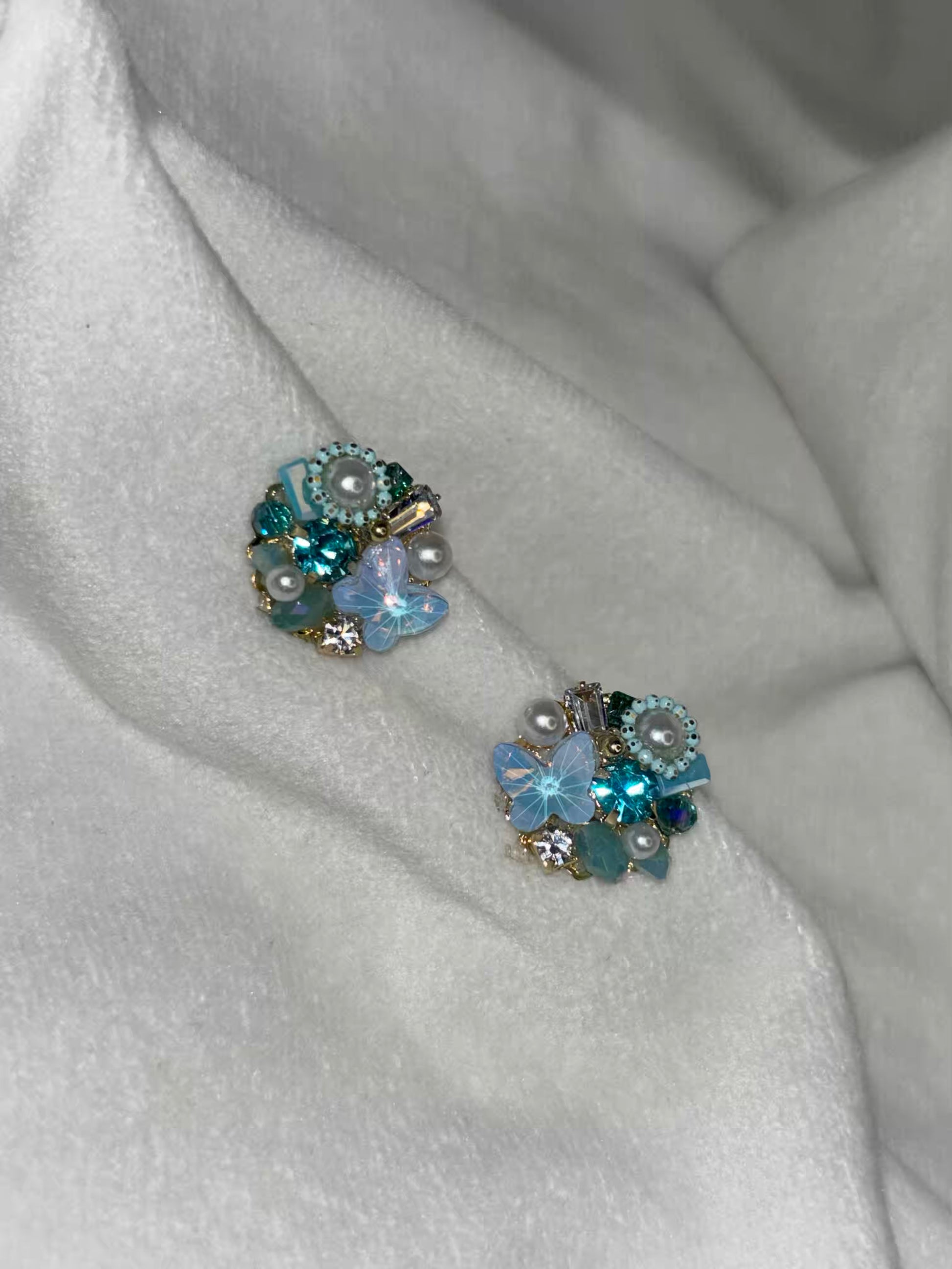 Blue Butterfly Small Pearly Earrings Studs - Gold Plated