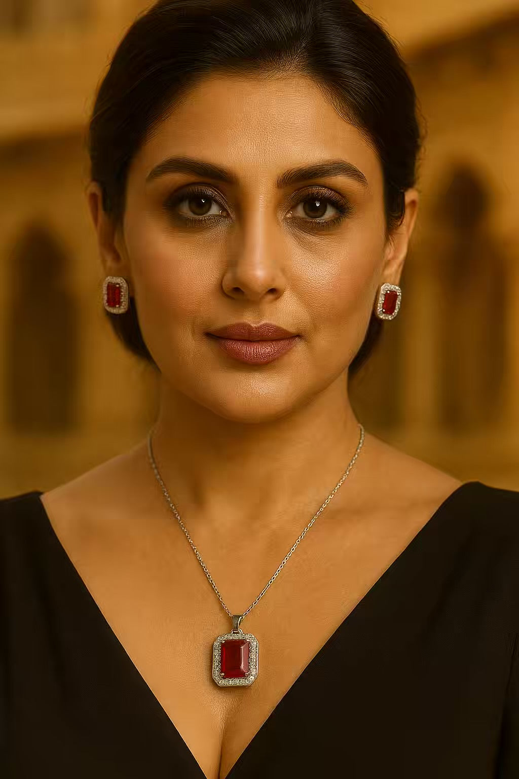 Red Pink Ruby Diamond Necklace Ear Studs Set - Silver Plated