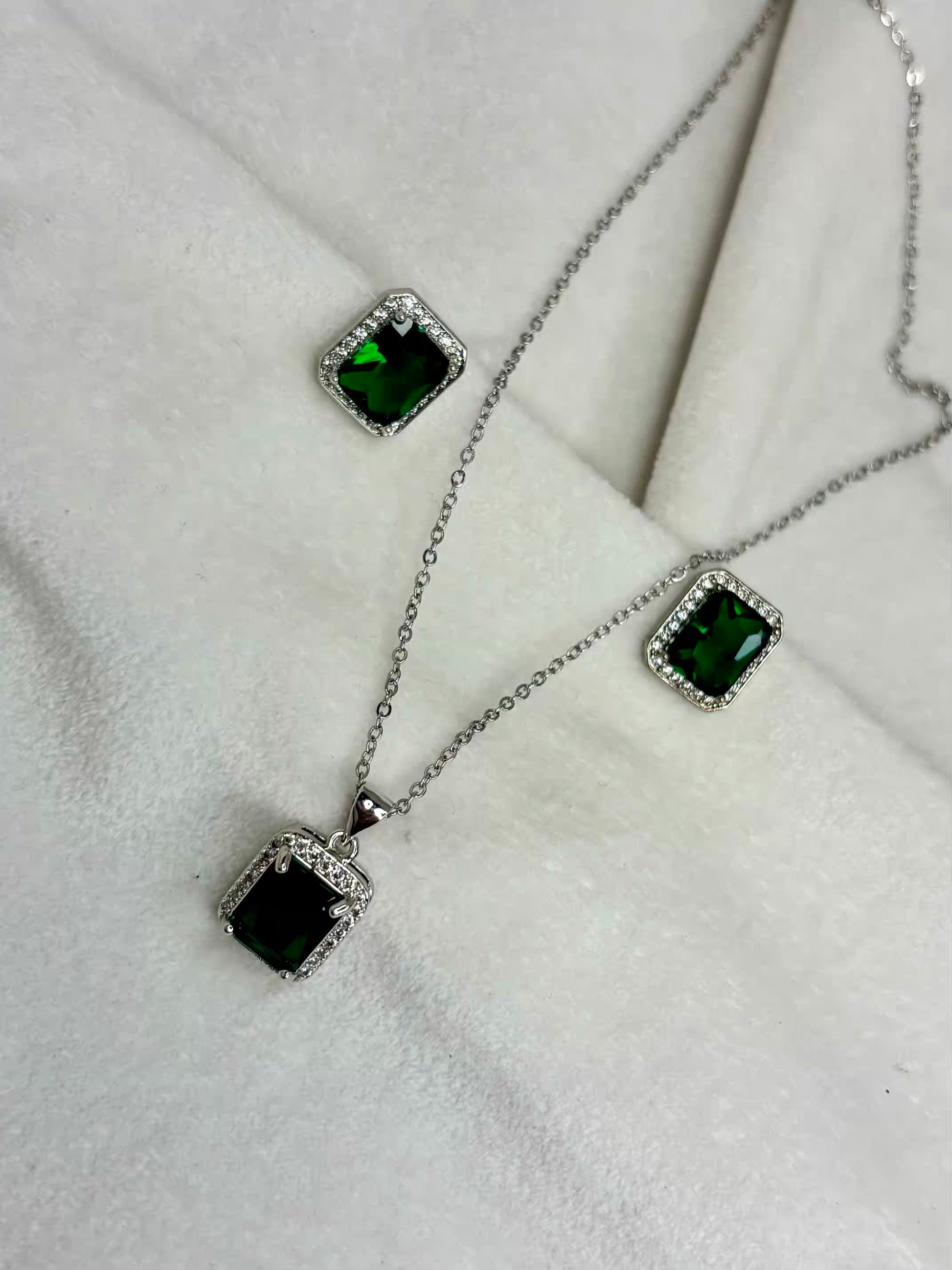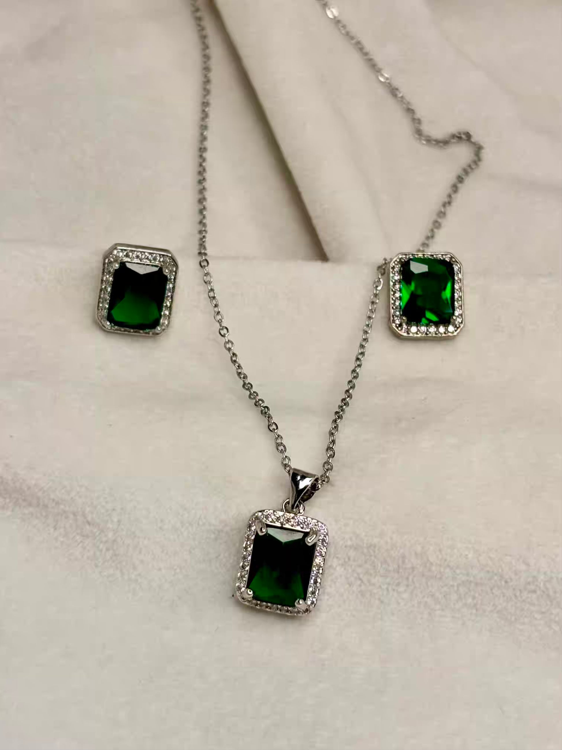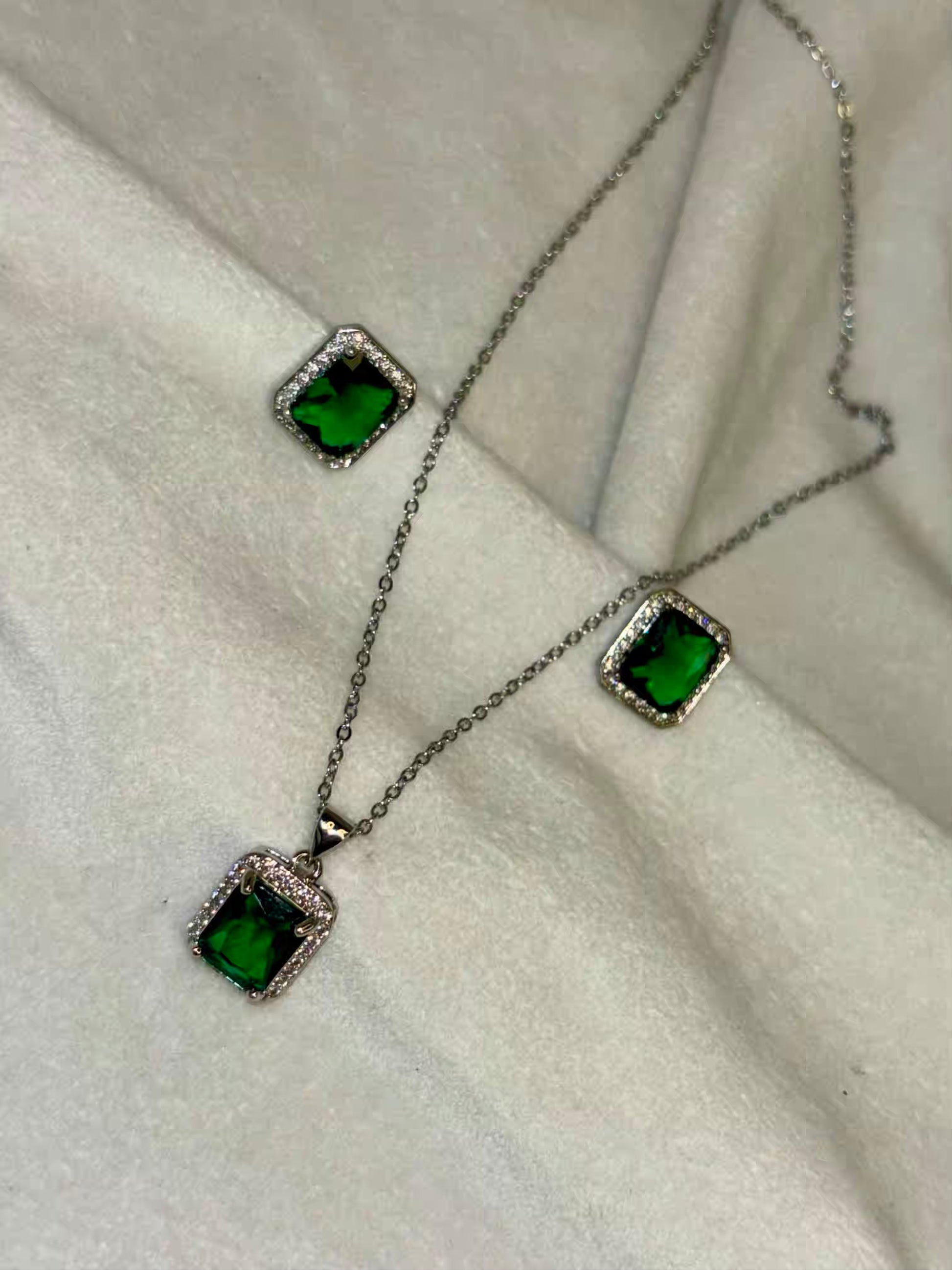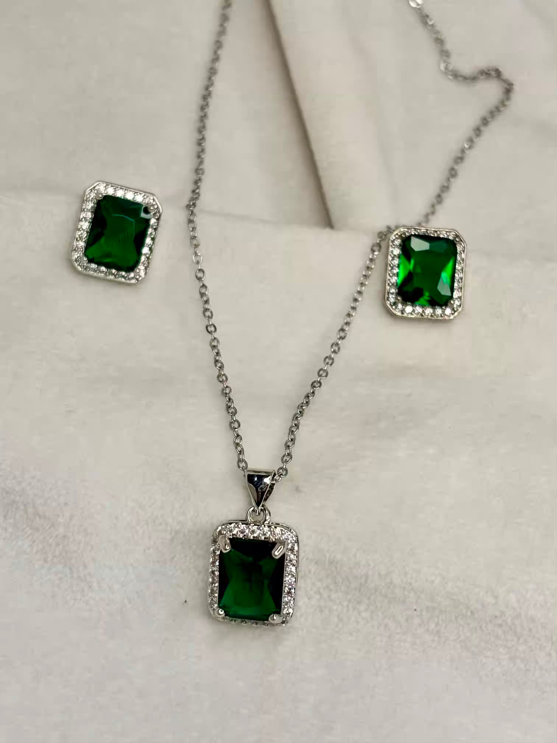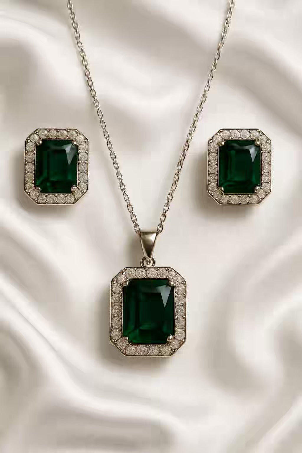 Emerald Green Diamond Necklace Ear Studs Set - Silver Plated