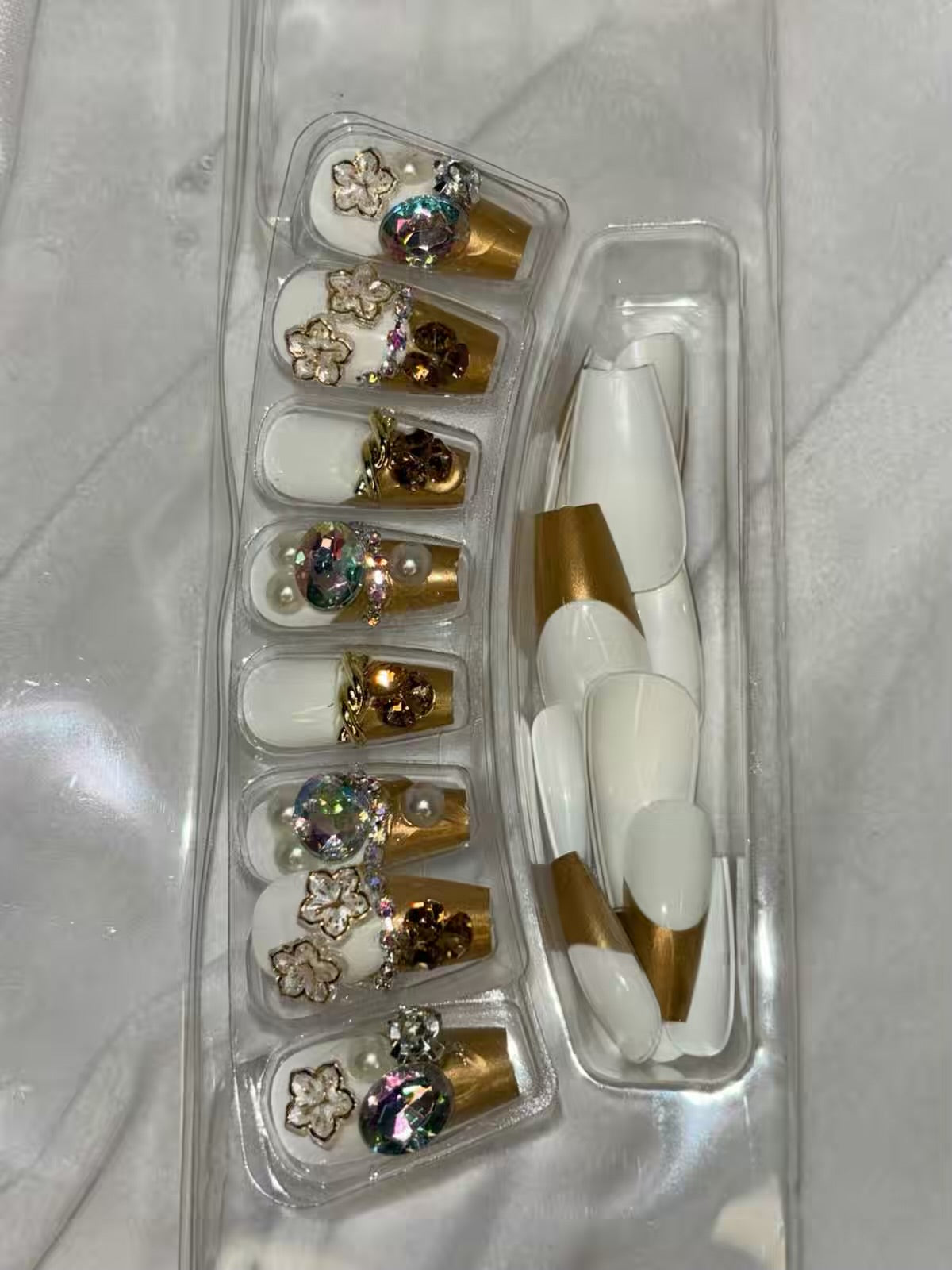 White Gold Flowers French Fancy Party Press On Nails ( Set of 24 )