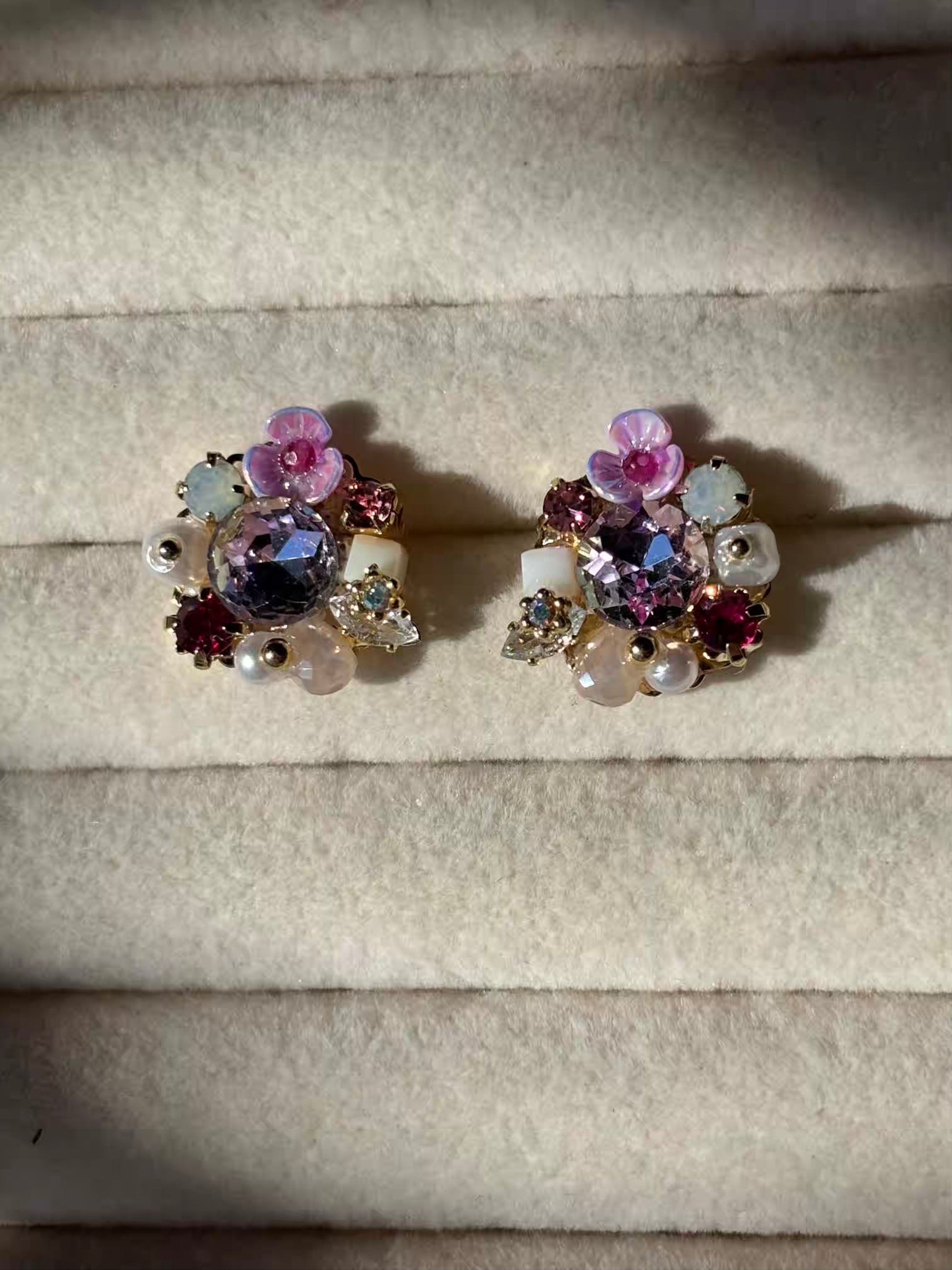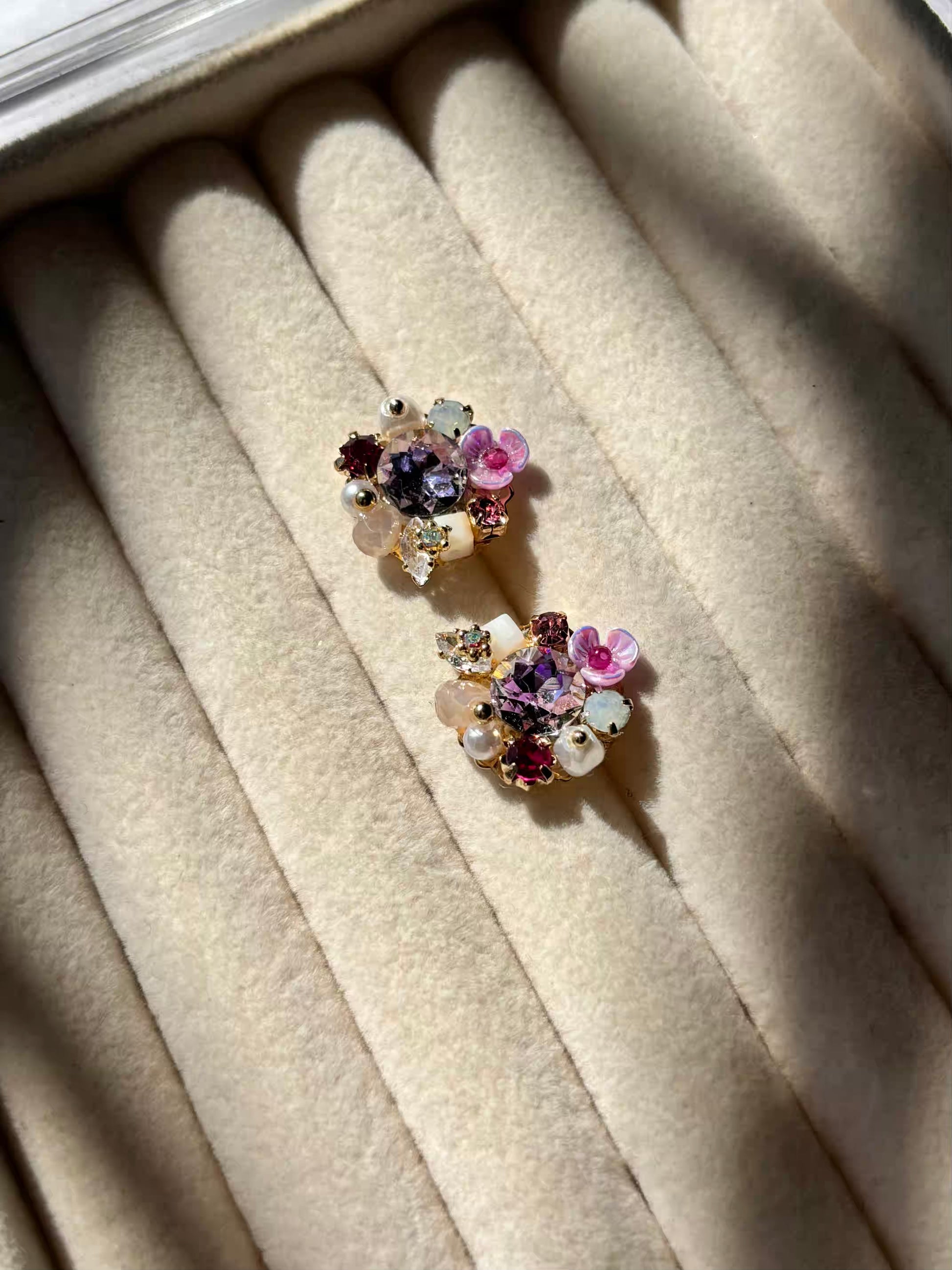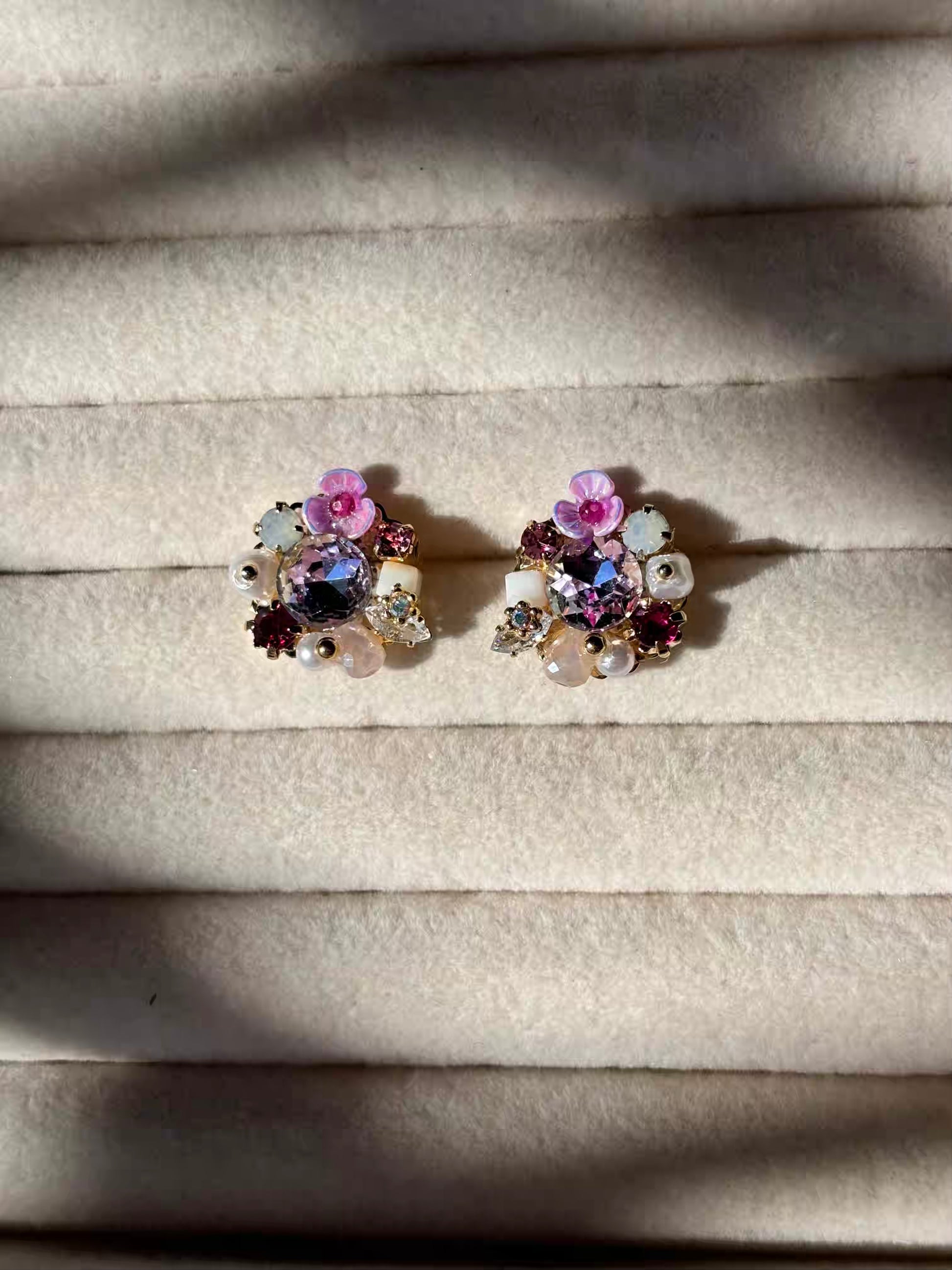 Purple Flower Pearly Earrings Studs - Gold Plated