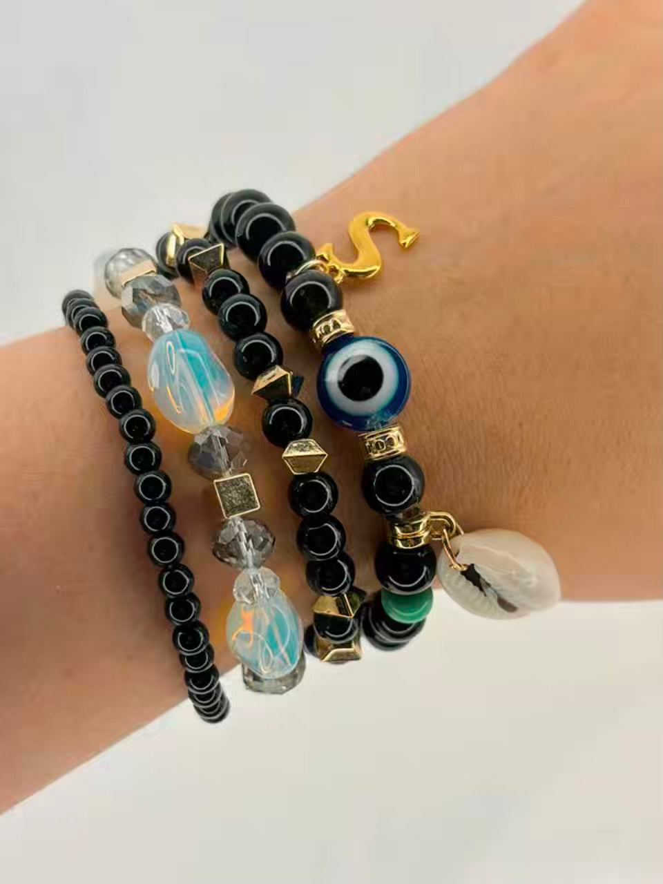 Black Beaded Crystals Hamsa Elastic Stretchable Bracelet With Customised Initial Alphabet Unisex for Men / Women
