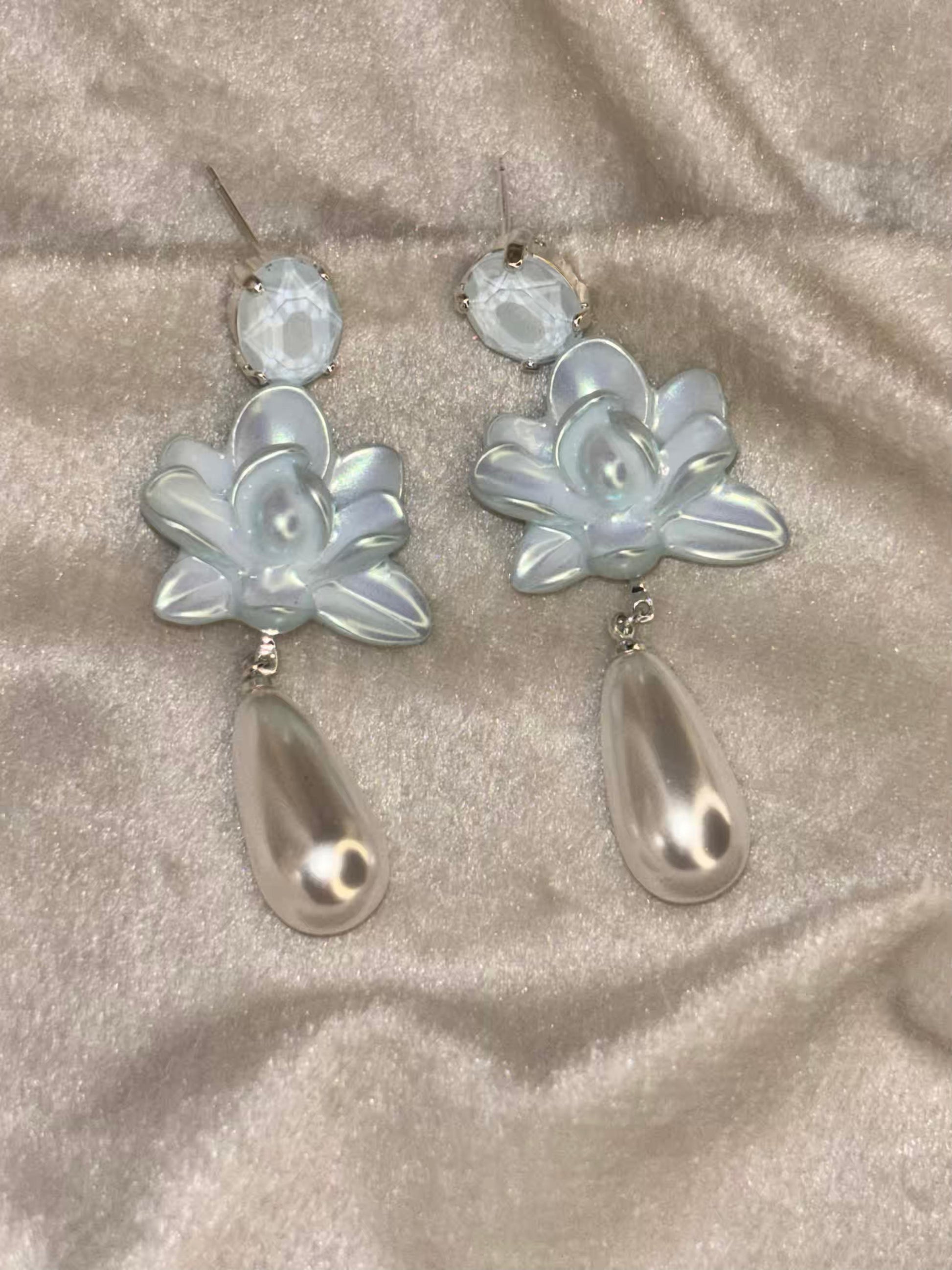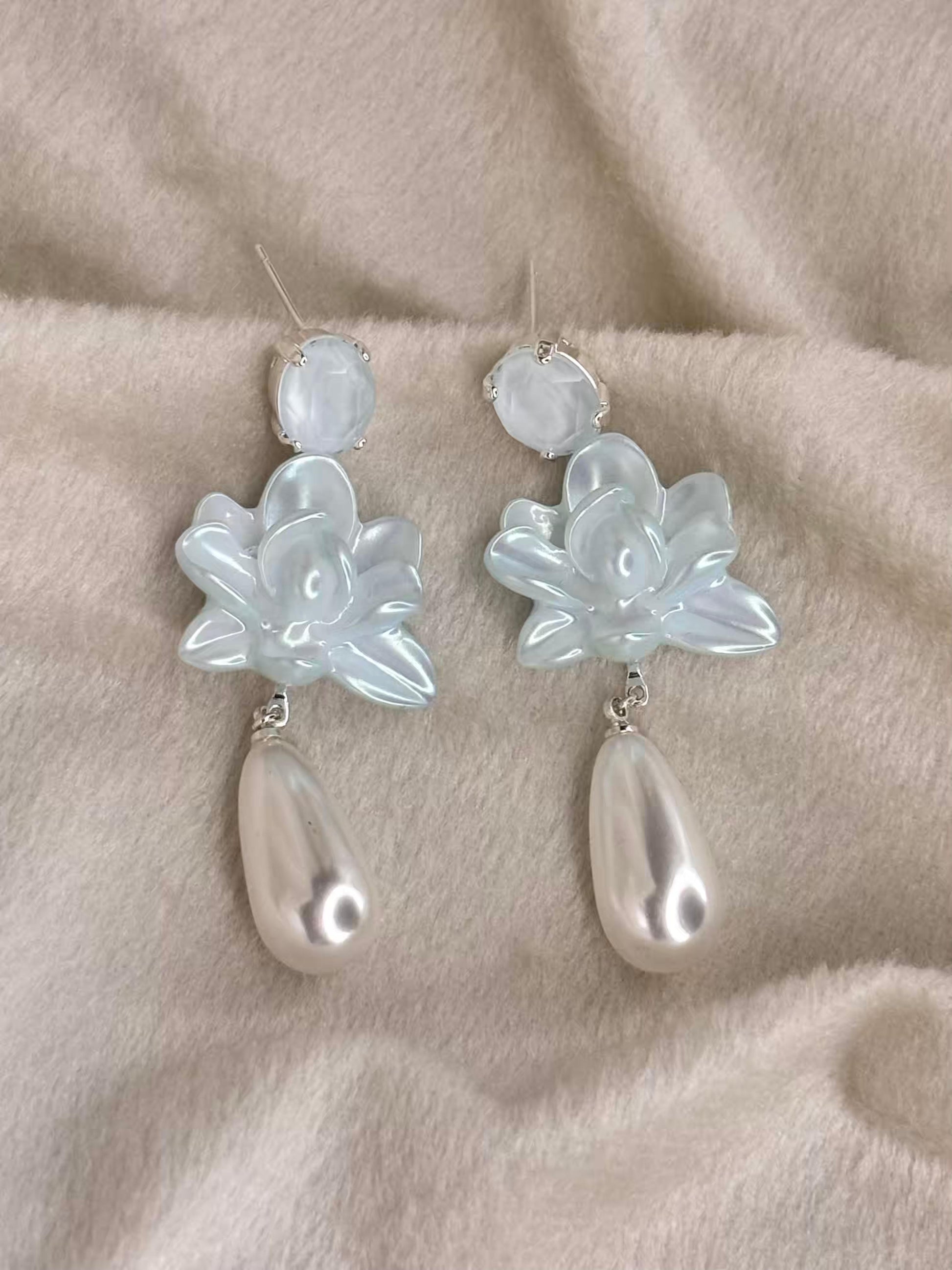 Floral Blue Pearl Dangle Earrings Silver Plated Earrings Premium Earrings