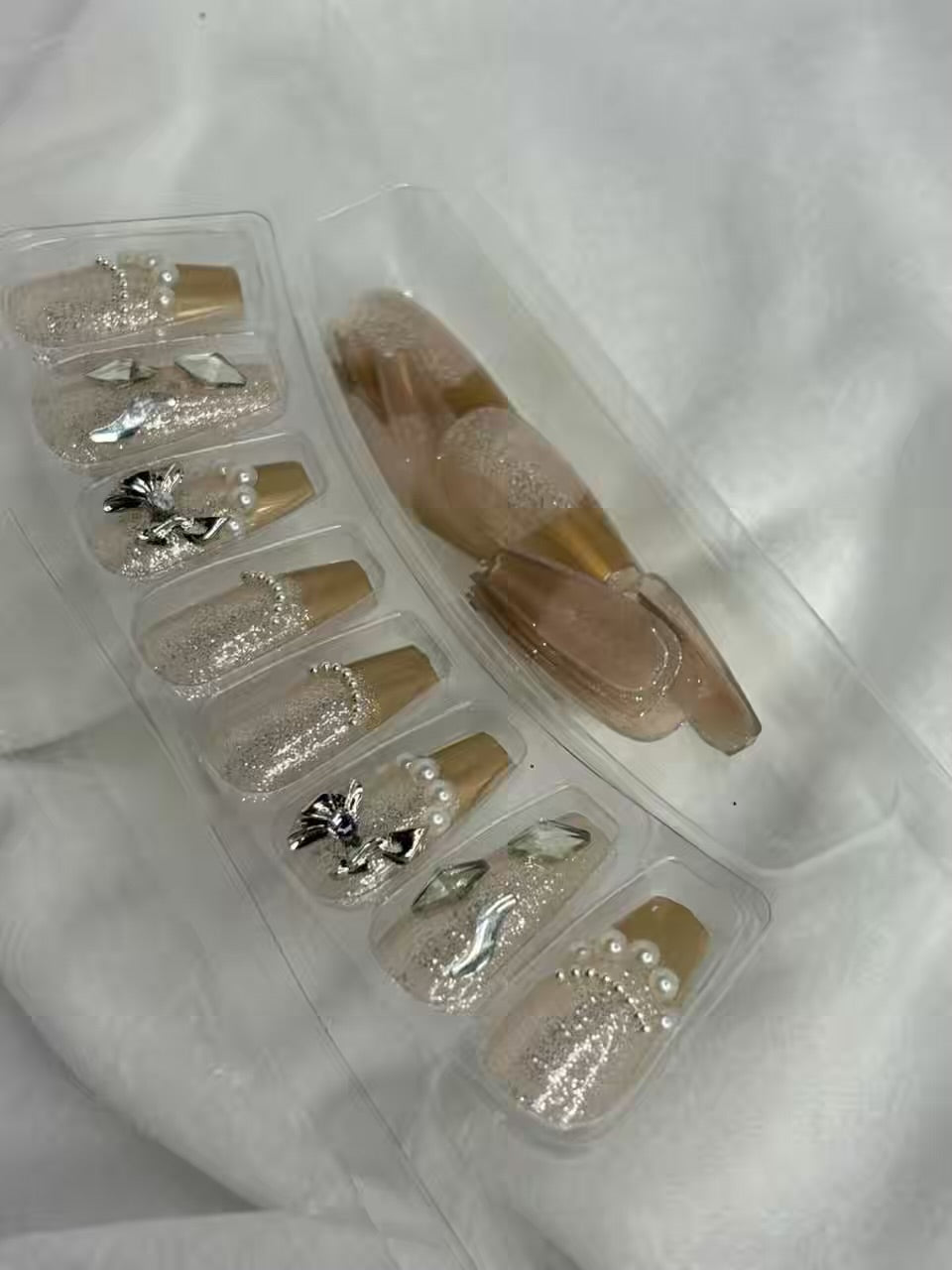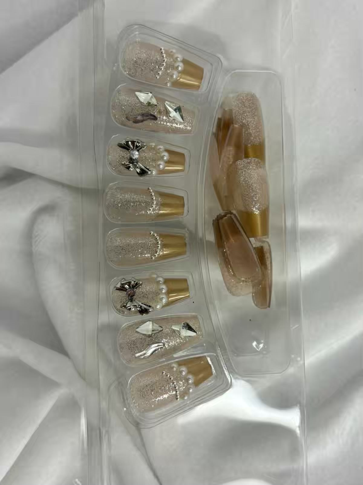 Gold Transparent French Shimmery Fancy Party Bridal Press On Nails ( Set of 24 )