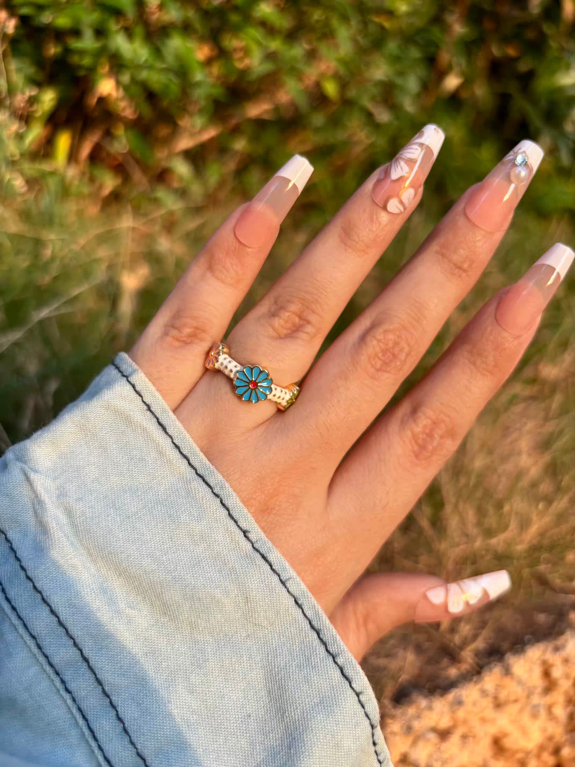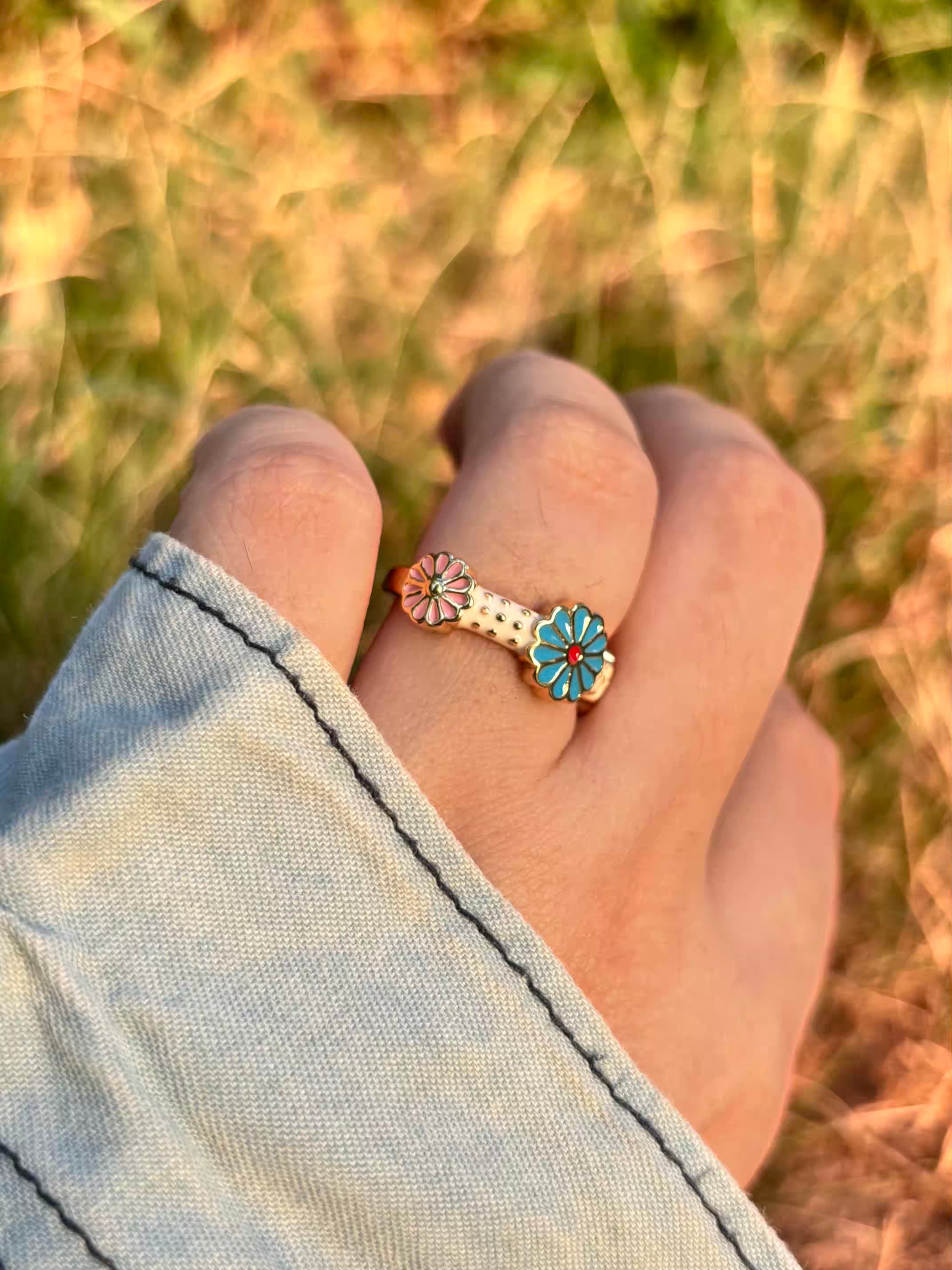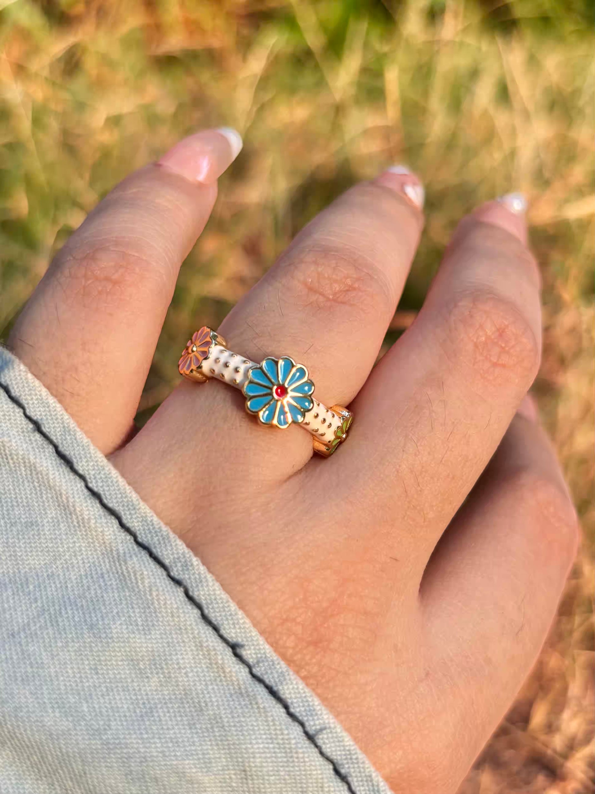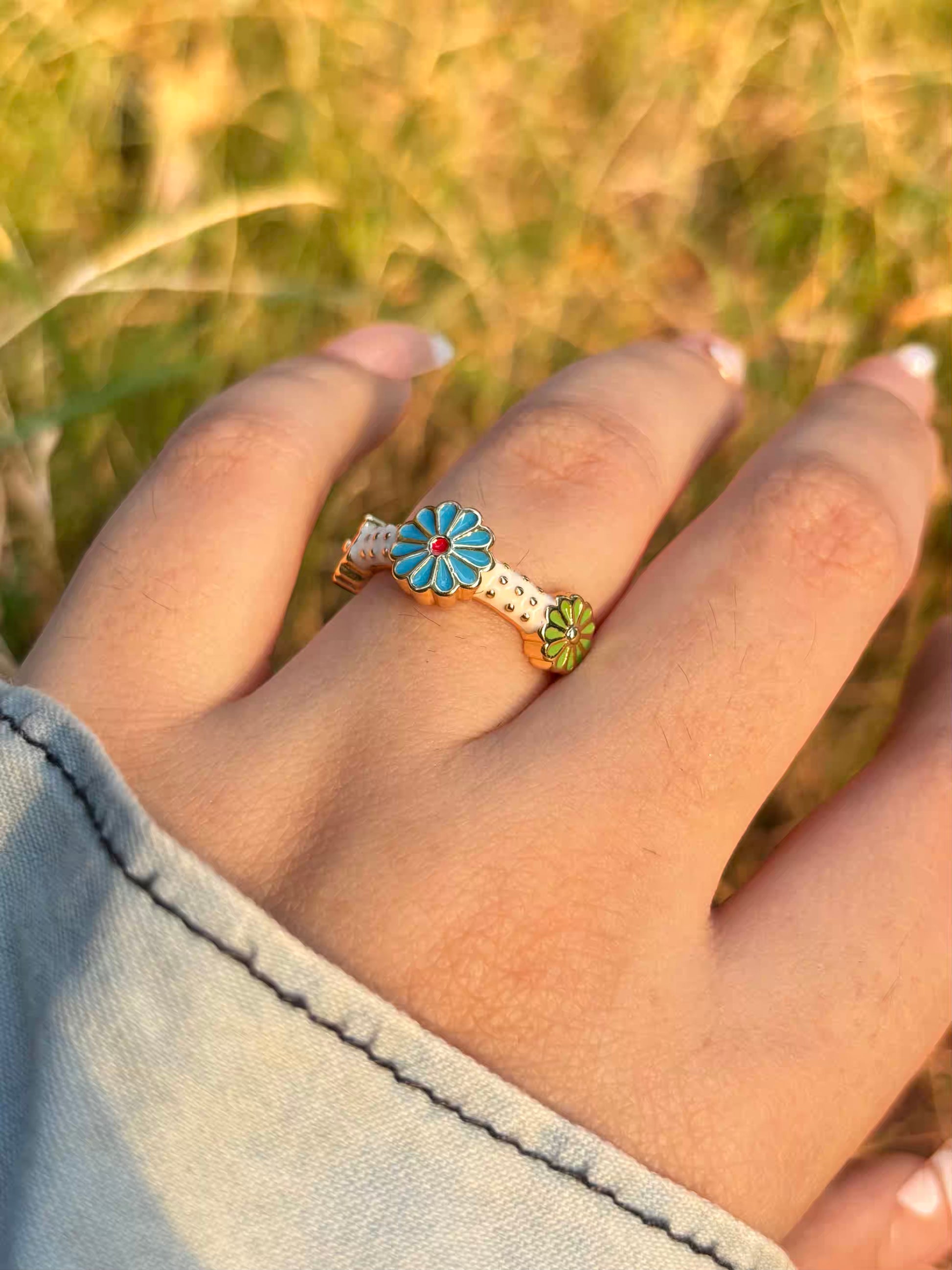 Blue Sunflower Band Ring - Adjustable