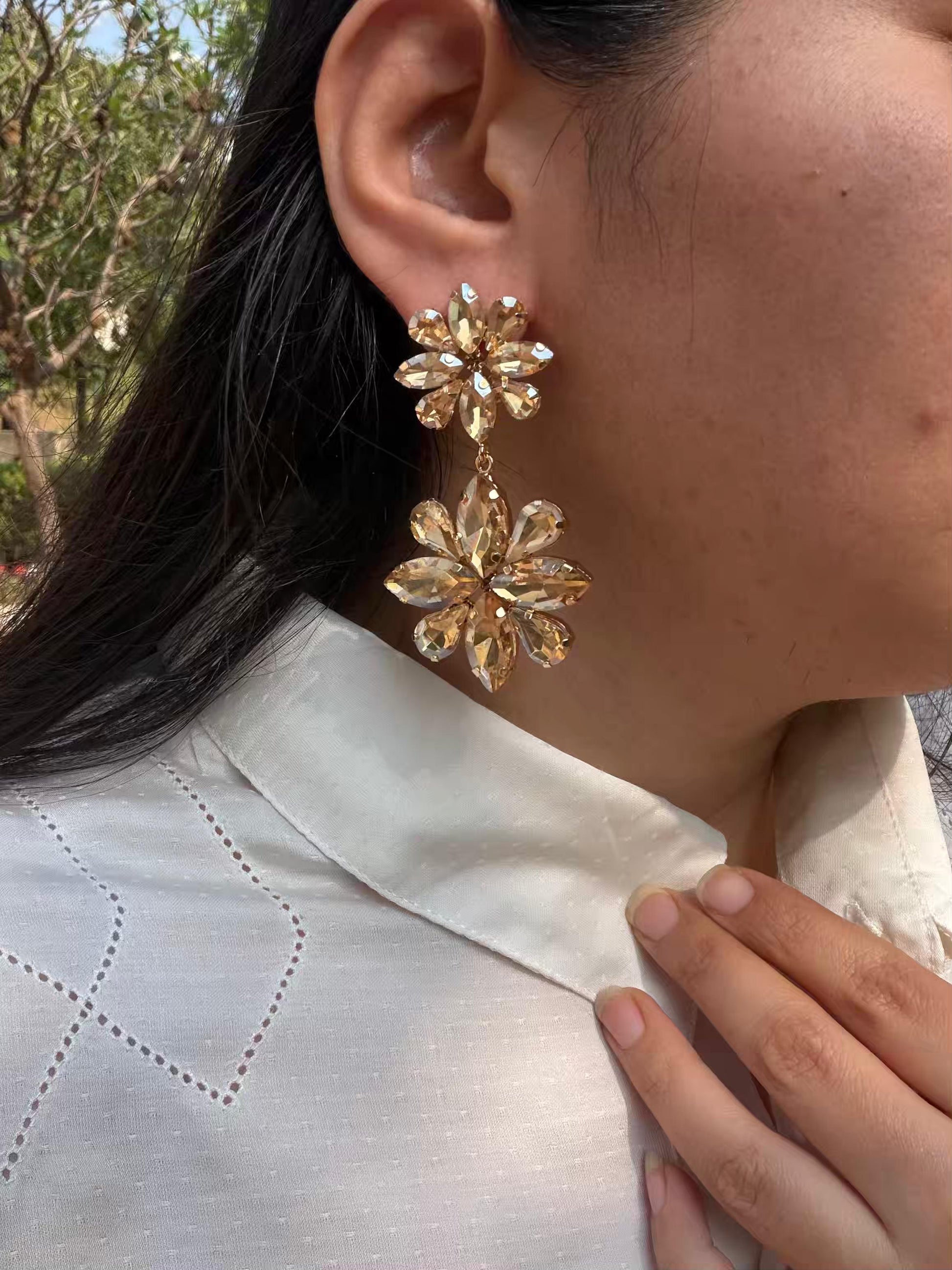 Double Flower Colour Long Gold Plated Earrings