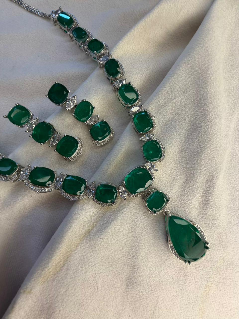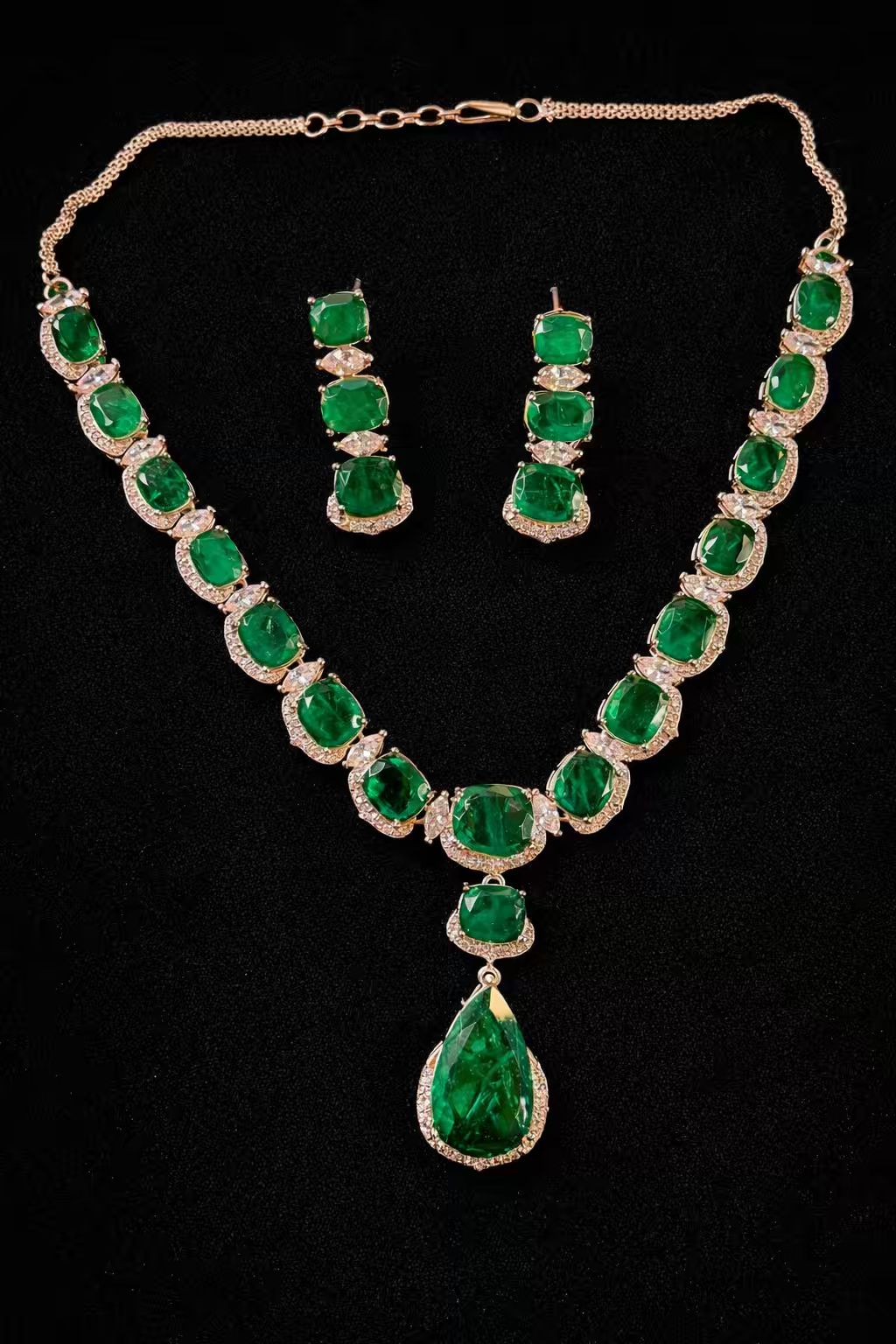 Emerald Green Luxury Studded Necklace and Studs Sets in Rhodium Gold Plating