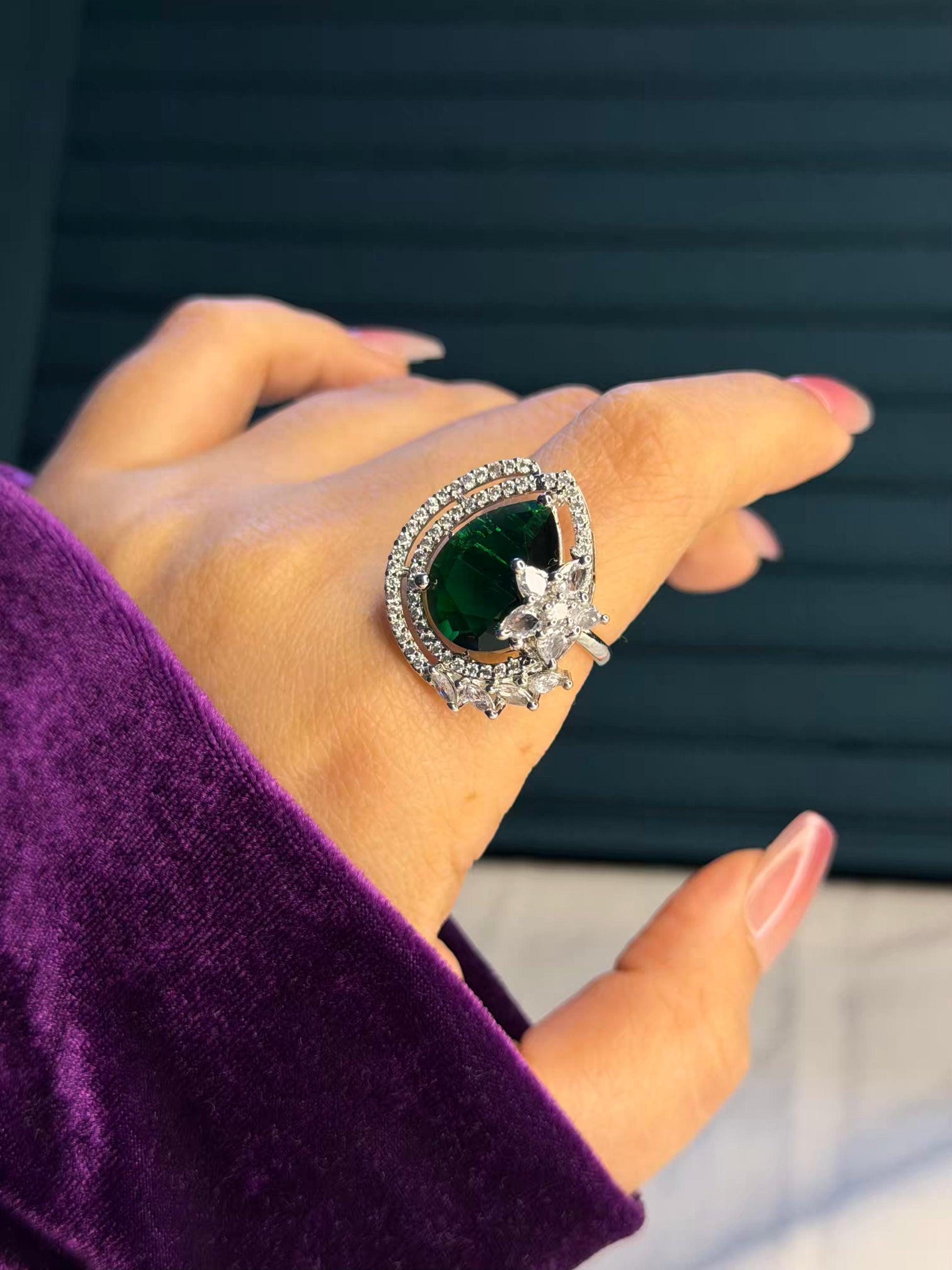 Emerald Green Royale Aura Silver Plated Premium Ring (Adjustable)
