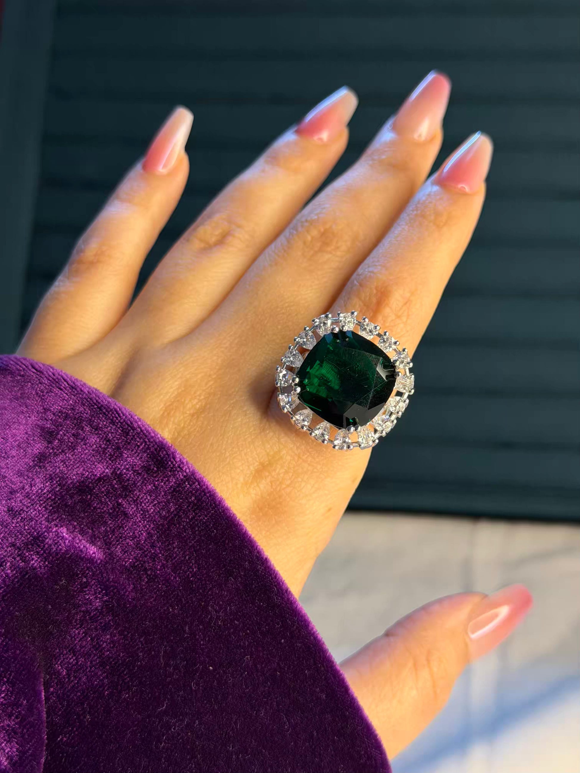Emerald Statement Big Silver Plated Premium Ring (Adjustable)