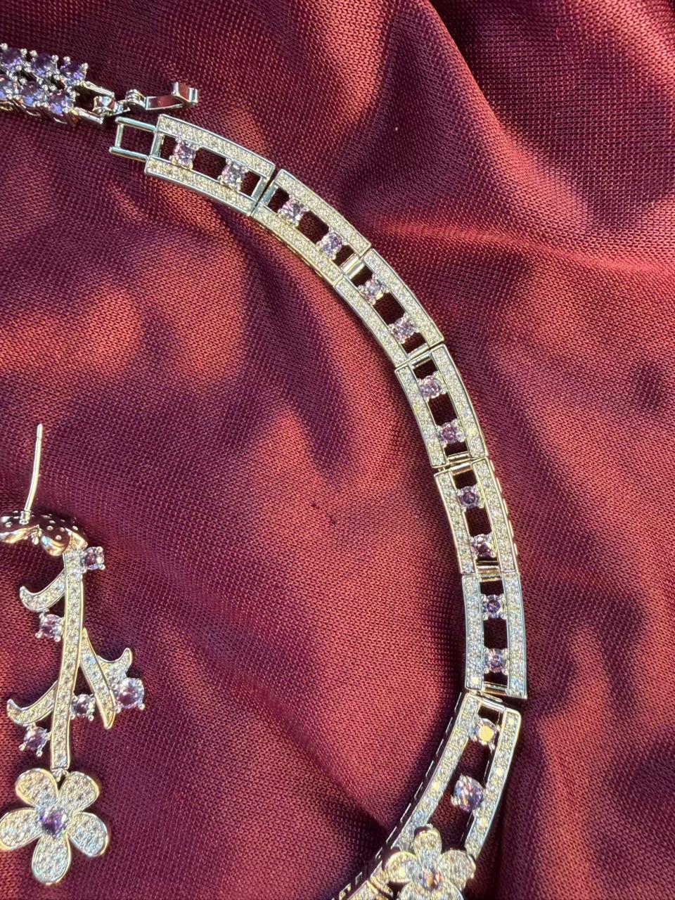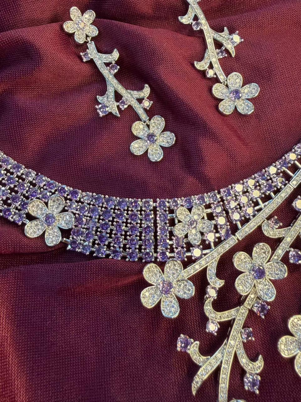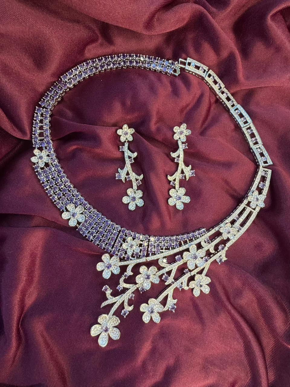 Floral Vine Design Rhodium-Plated Silver Necklace Set with Lavender and Clear Stones