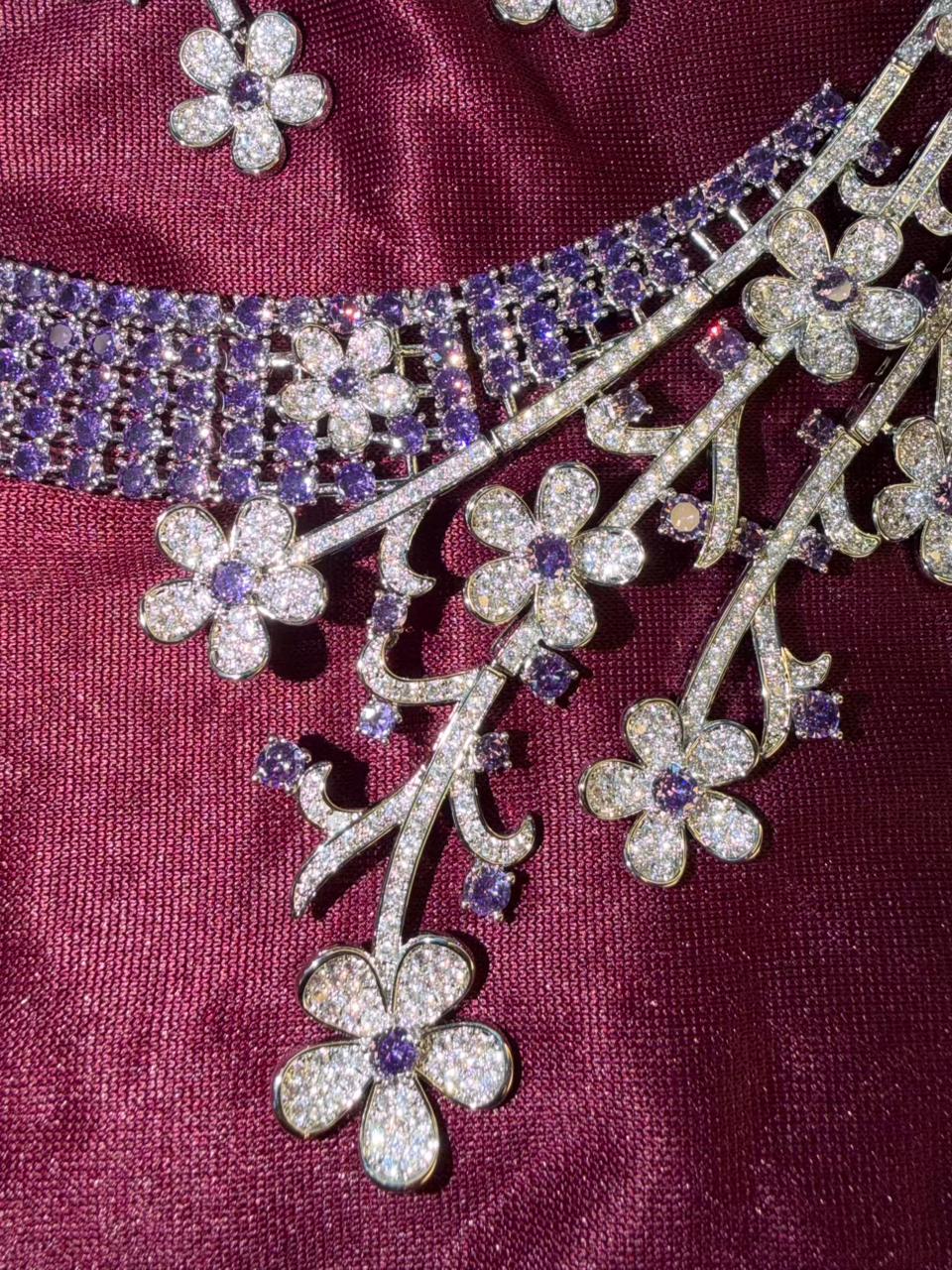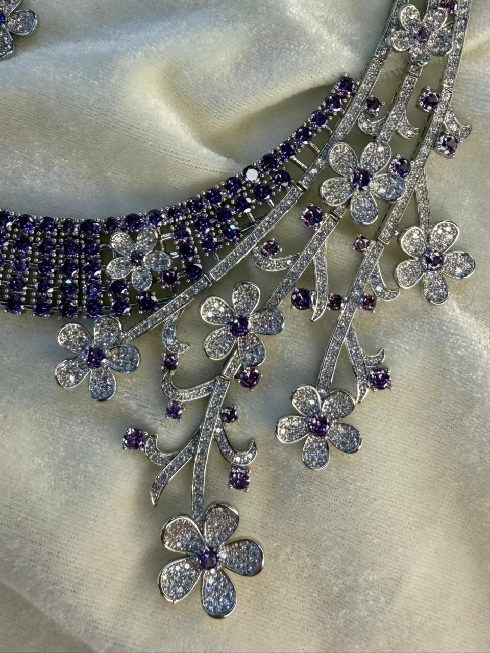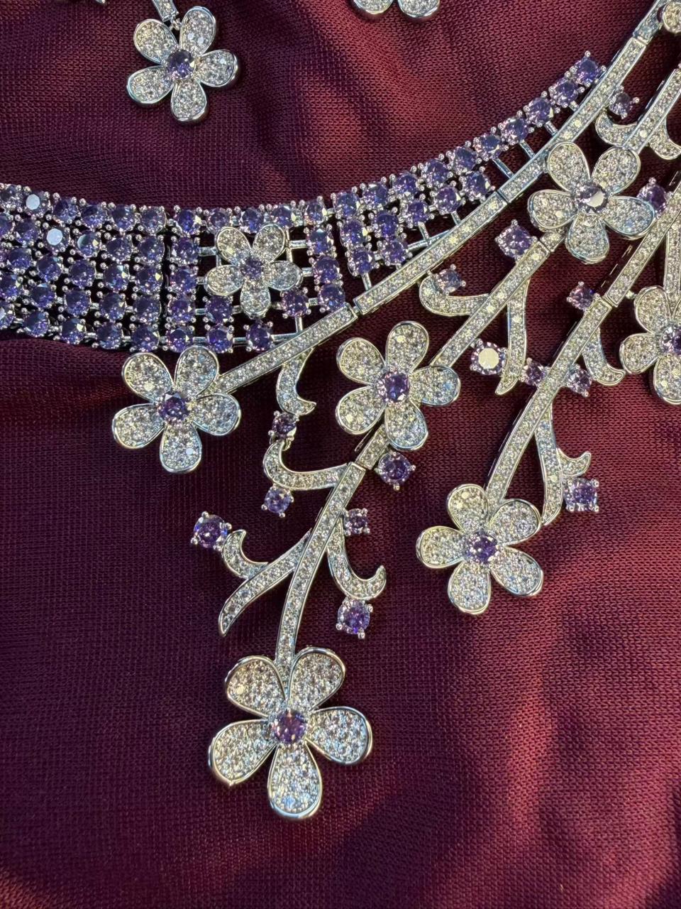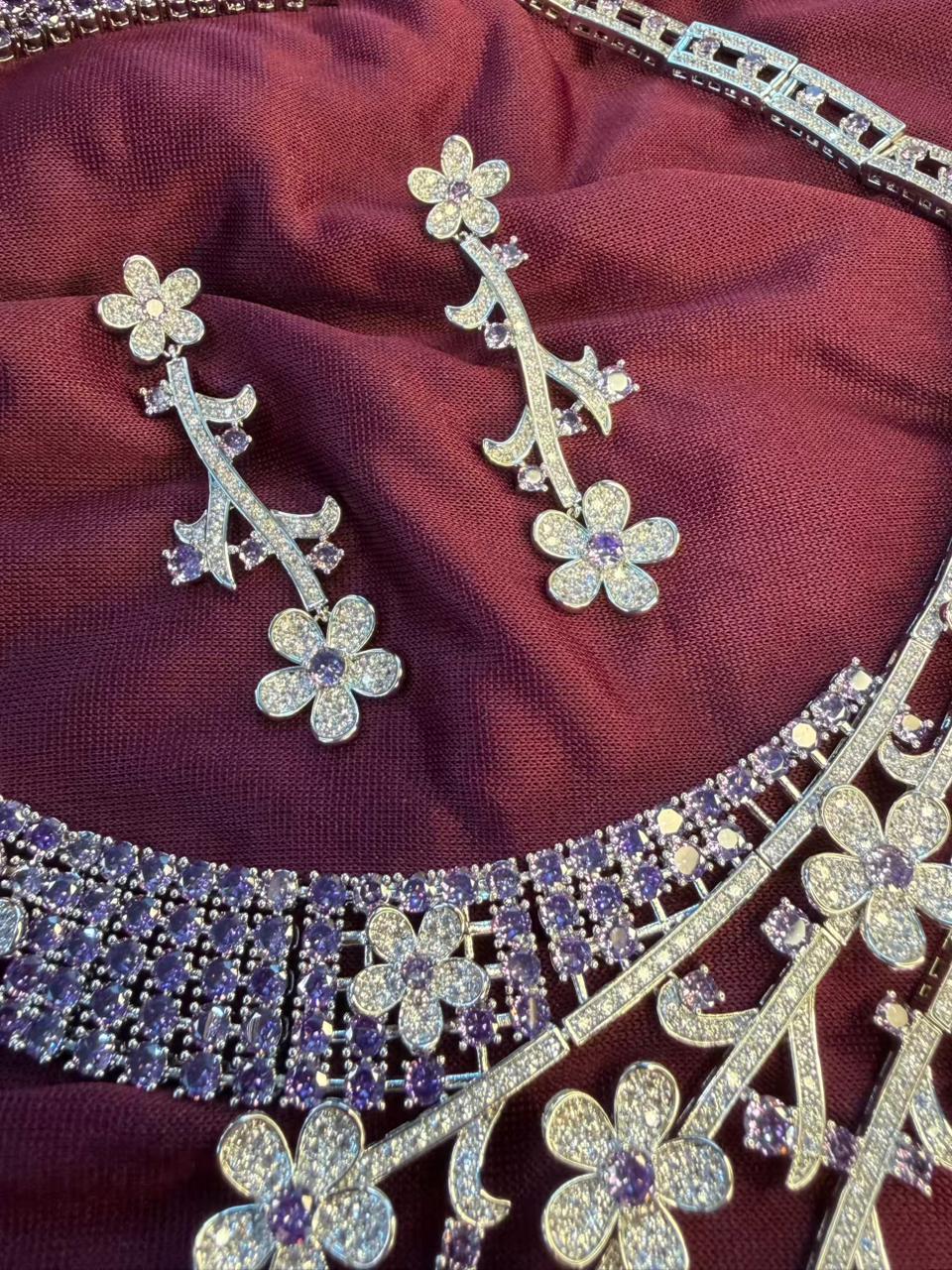 Floral Vine Design Rhodium-Plated Silver Necklace Set with Lavender and Clear Stones