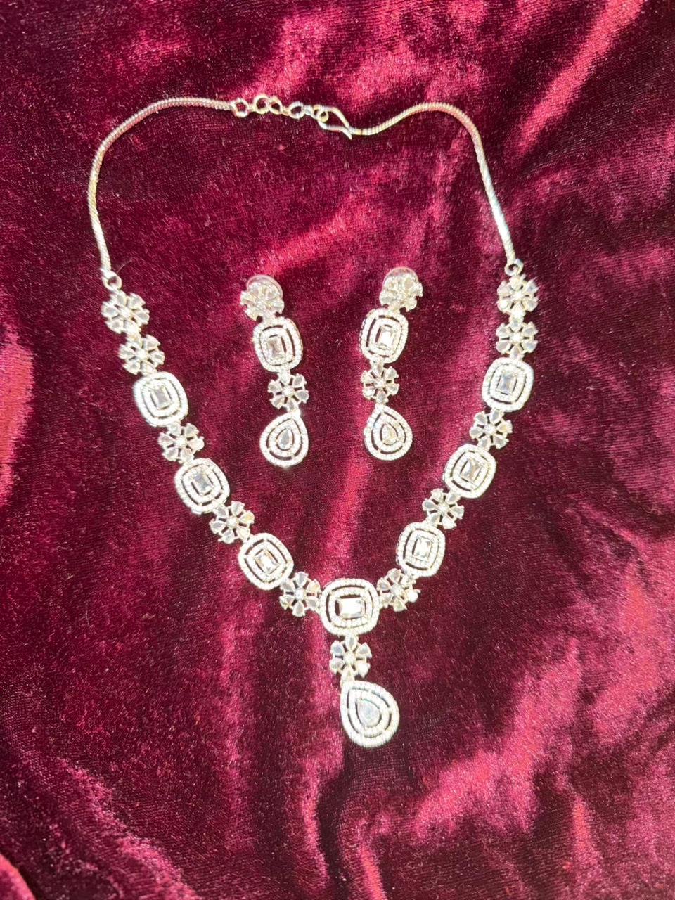 Geometric Floral Design Rhodium-Plated Necklace Set with Clear Stones
