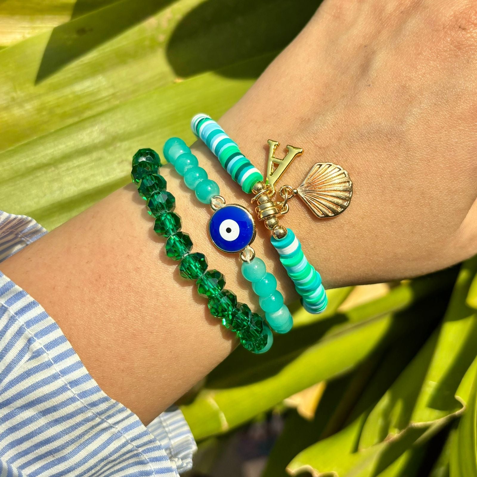 Shining Ocean Green Crystals Stack Elastic Bracelet With Customised Initial ( Gold )