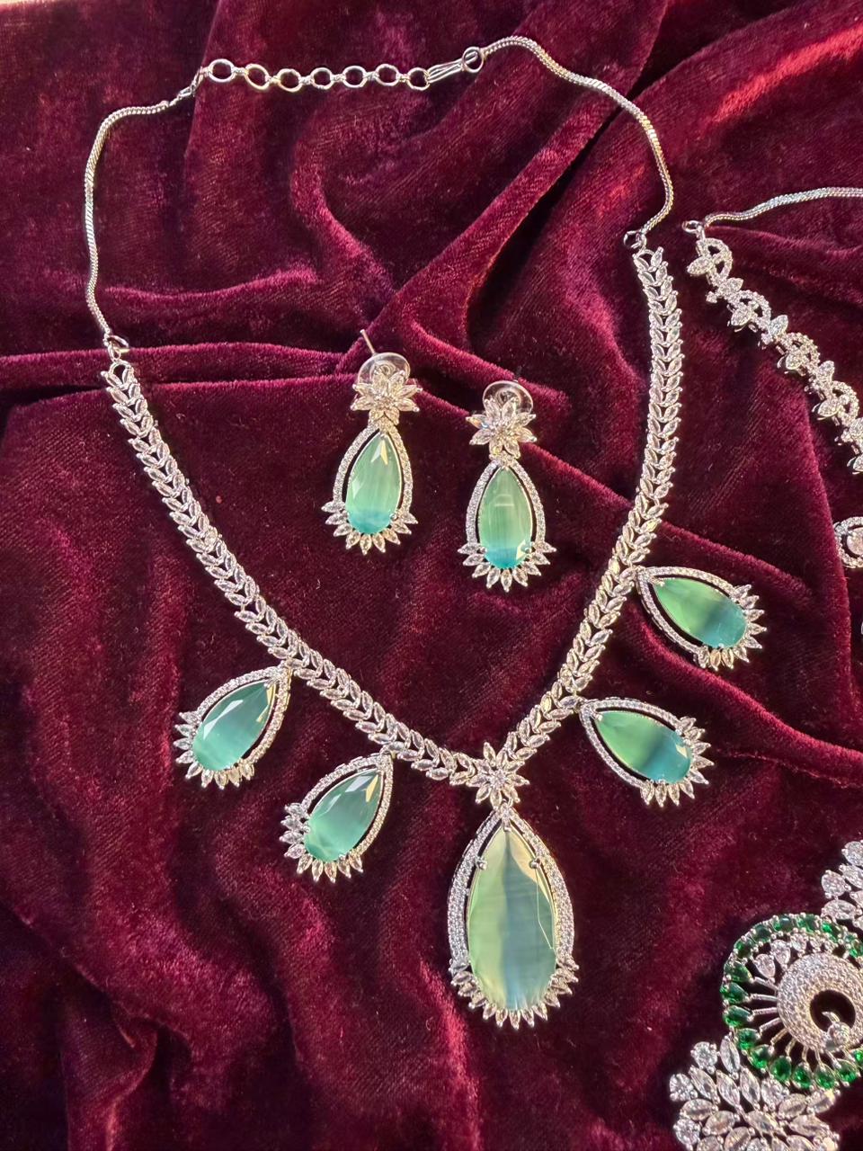 Pear-Cut Motif Rhodium-Plated Necklace Set in Sea Green
