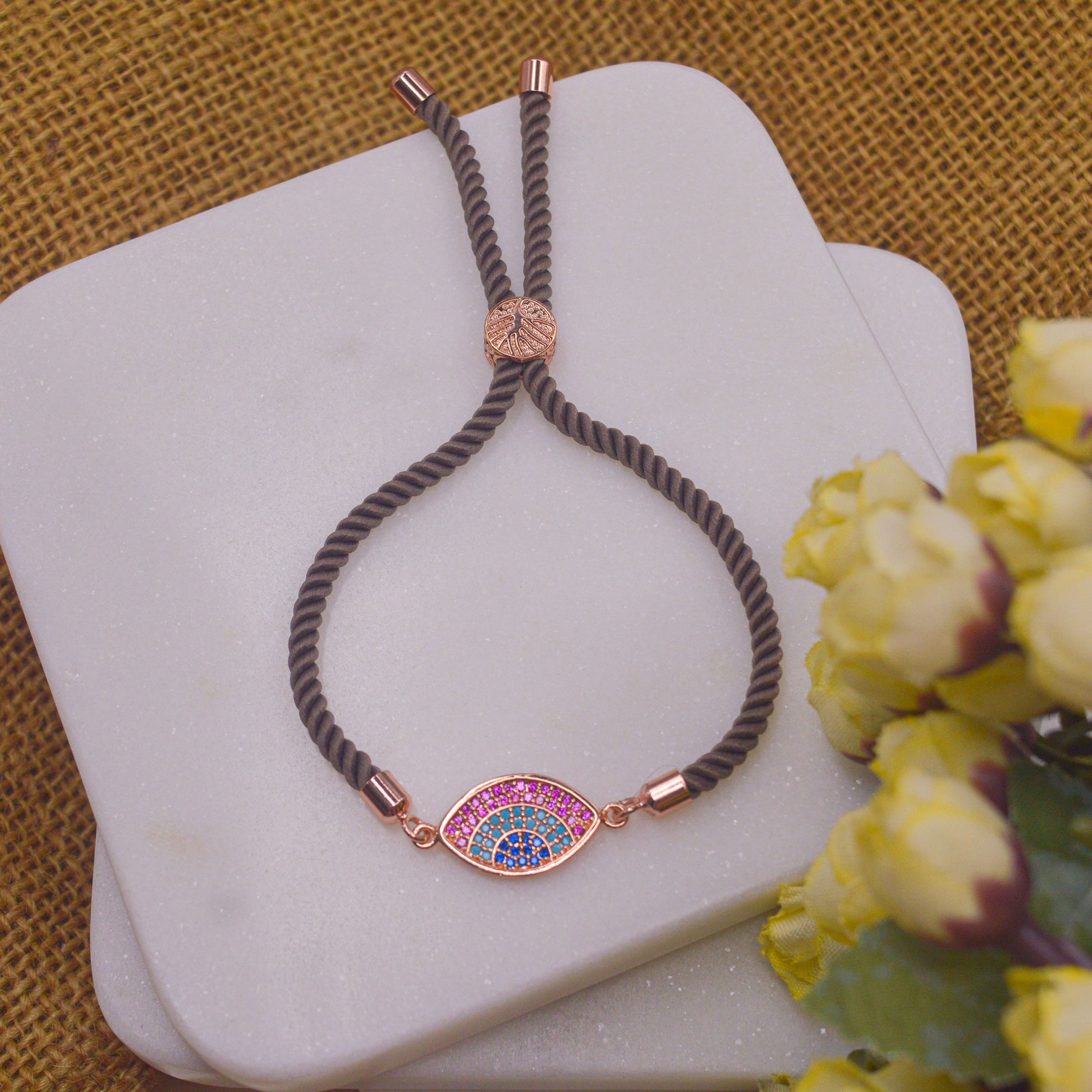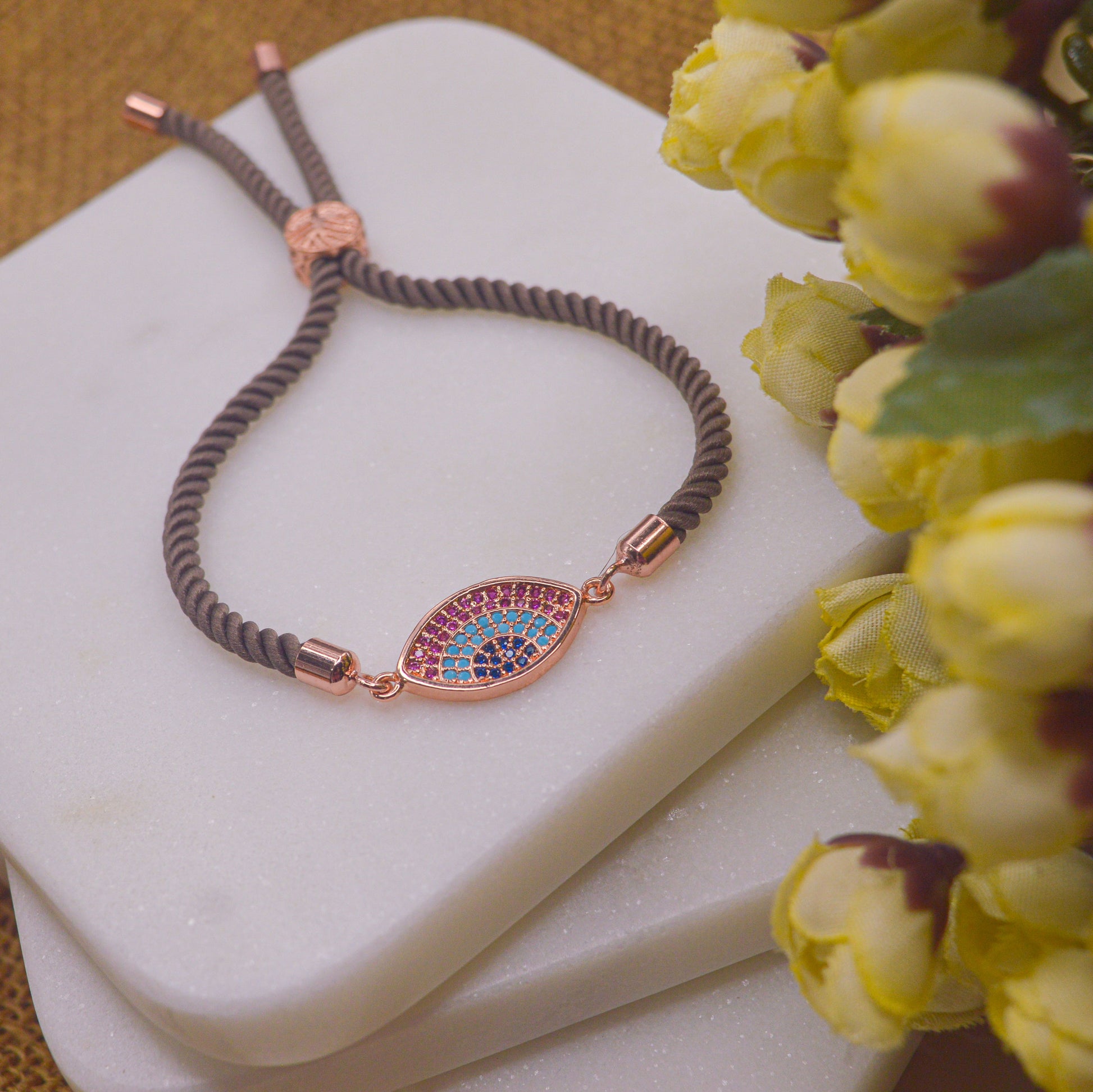 Pink Blue Evil Eye Bracelet Brown Band - Rose Gold