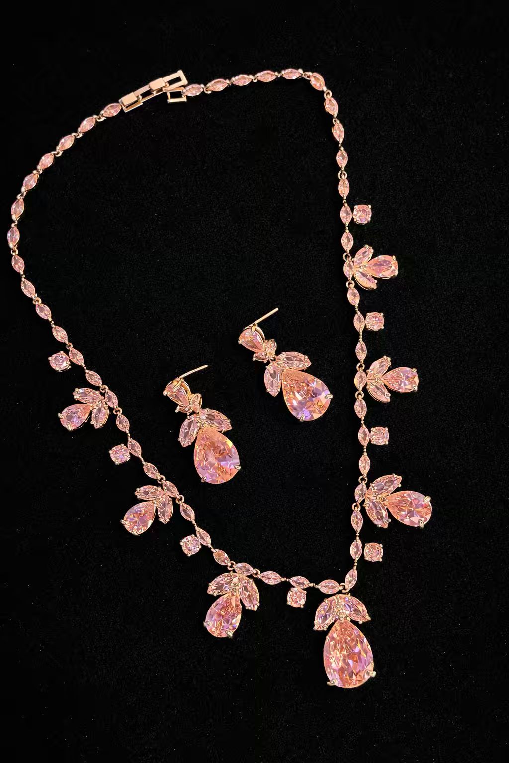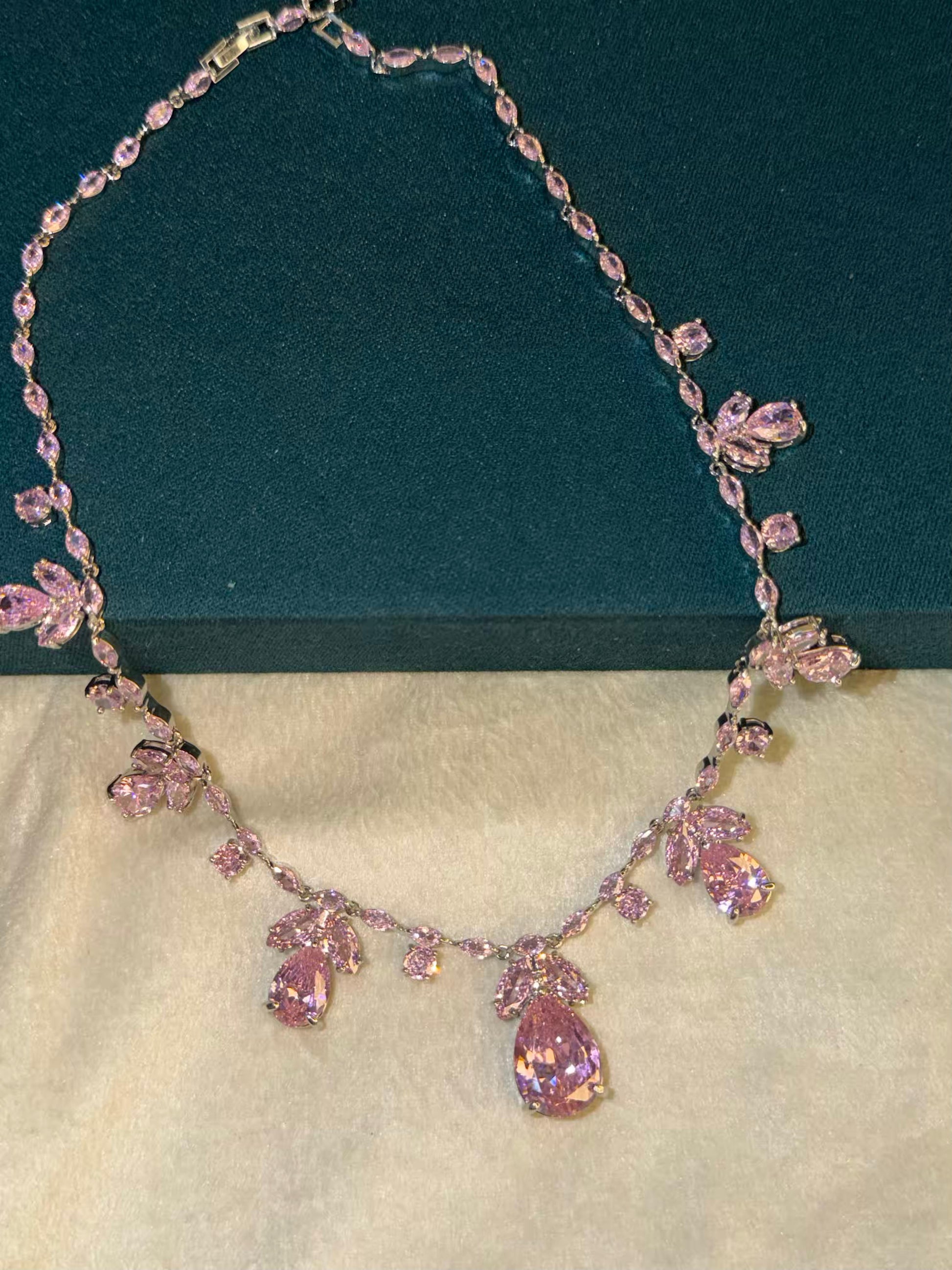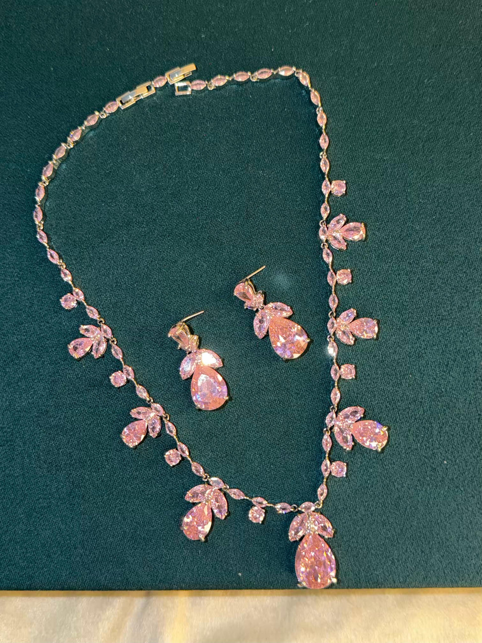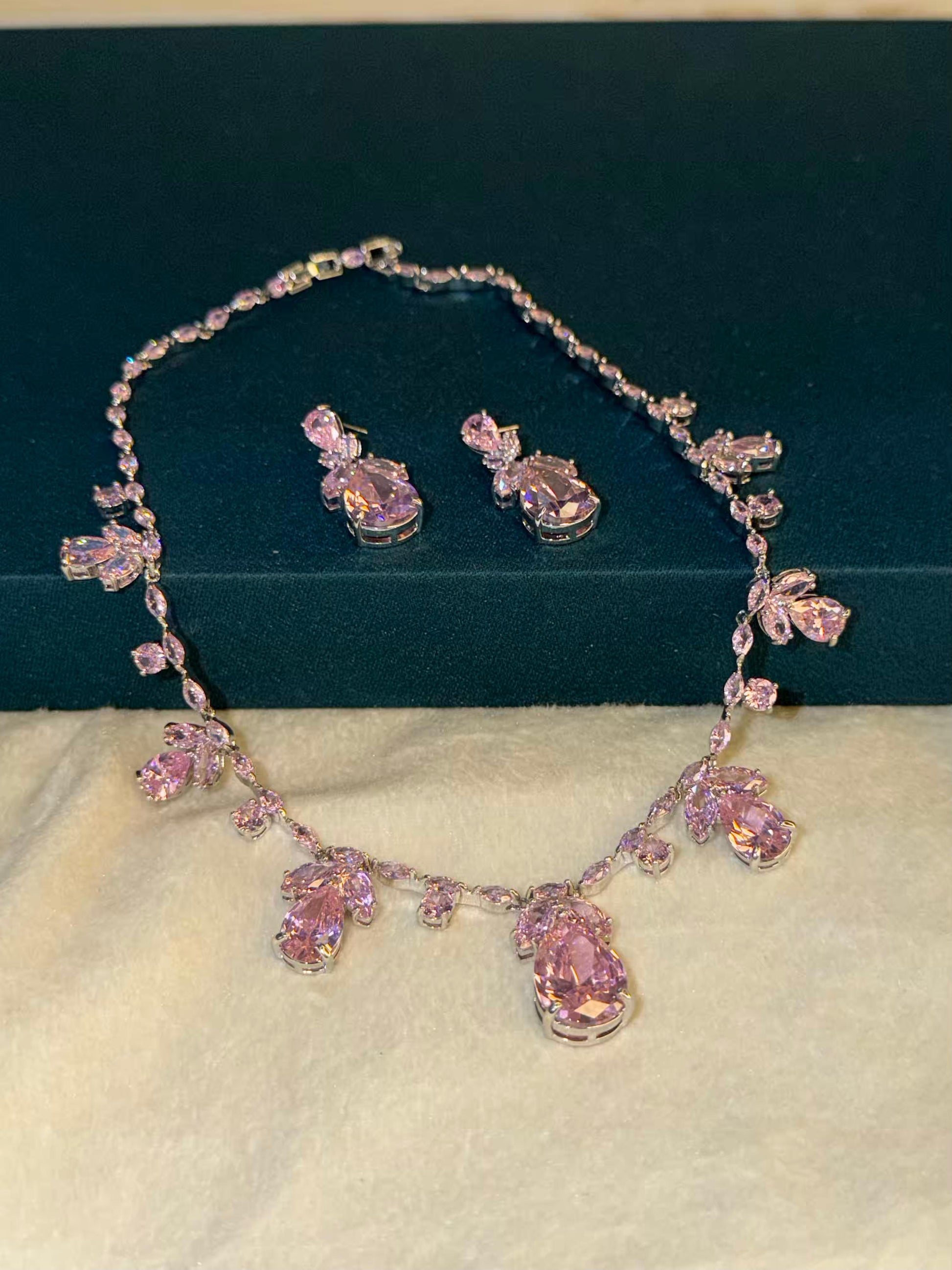 Pink Floral Rhodium Plated Necklace Set with Earrings
