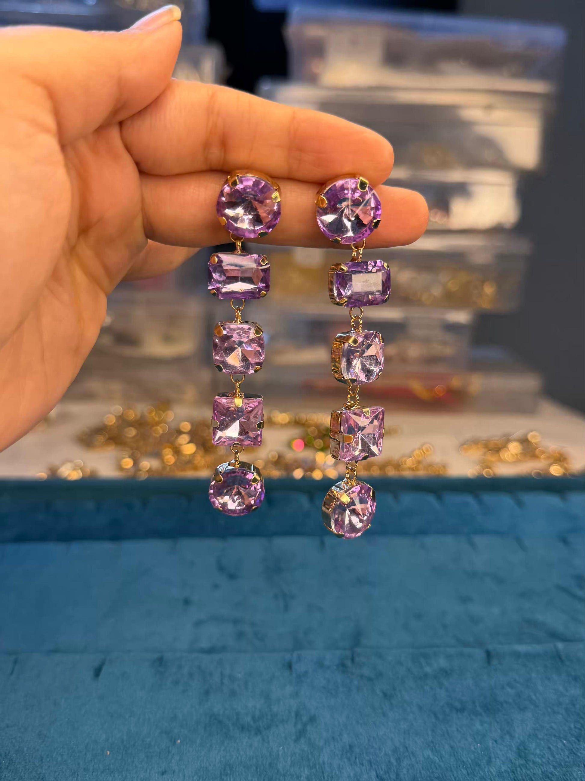 Purple Colour Diamond Long Gold Plated Earrings