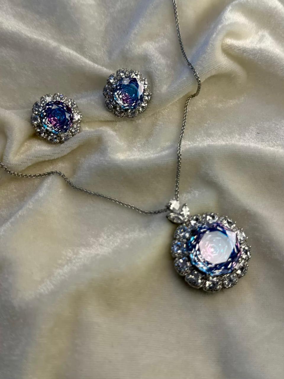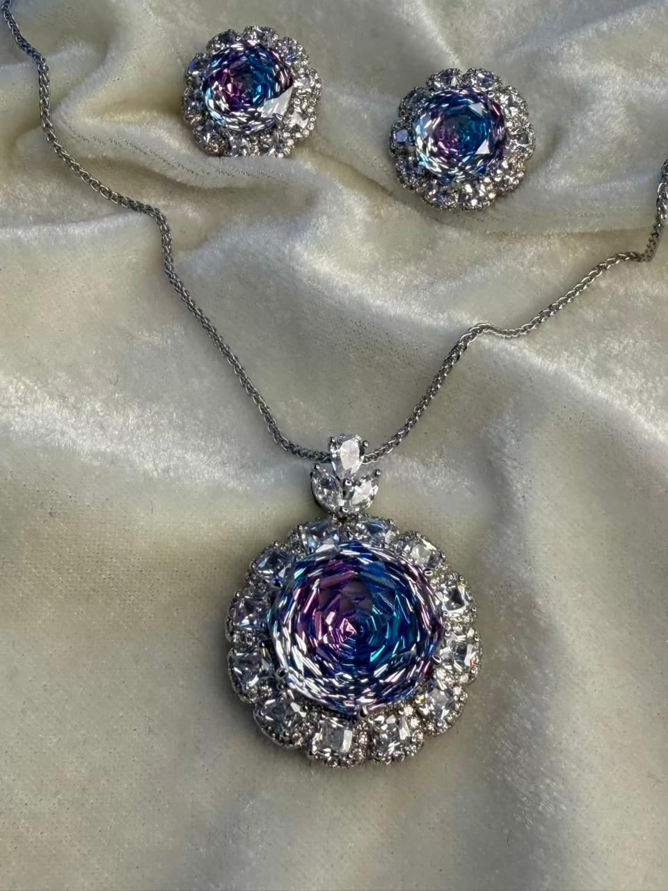 Round Floral Halo Rhodium-Plated Silver Necklace Set with Iridescent Blue Stones