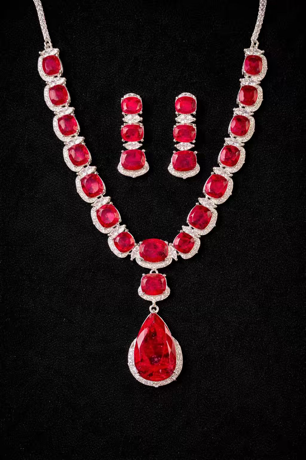 Ruby Red Luxury Studded Necklace and Studs Sets in Rhodium Silver Plating