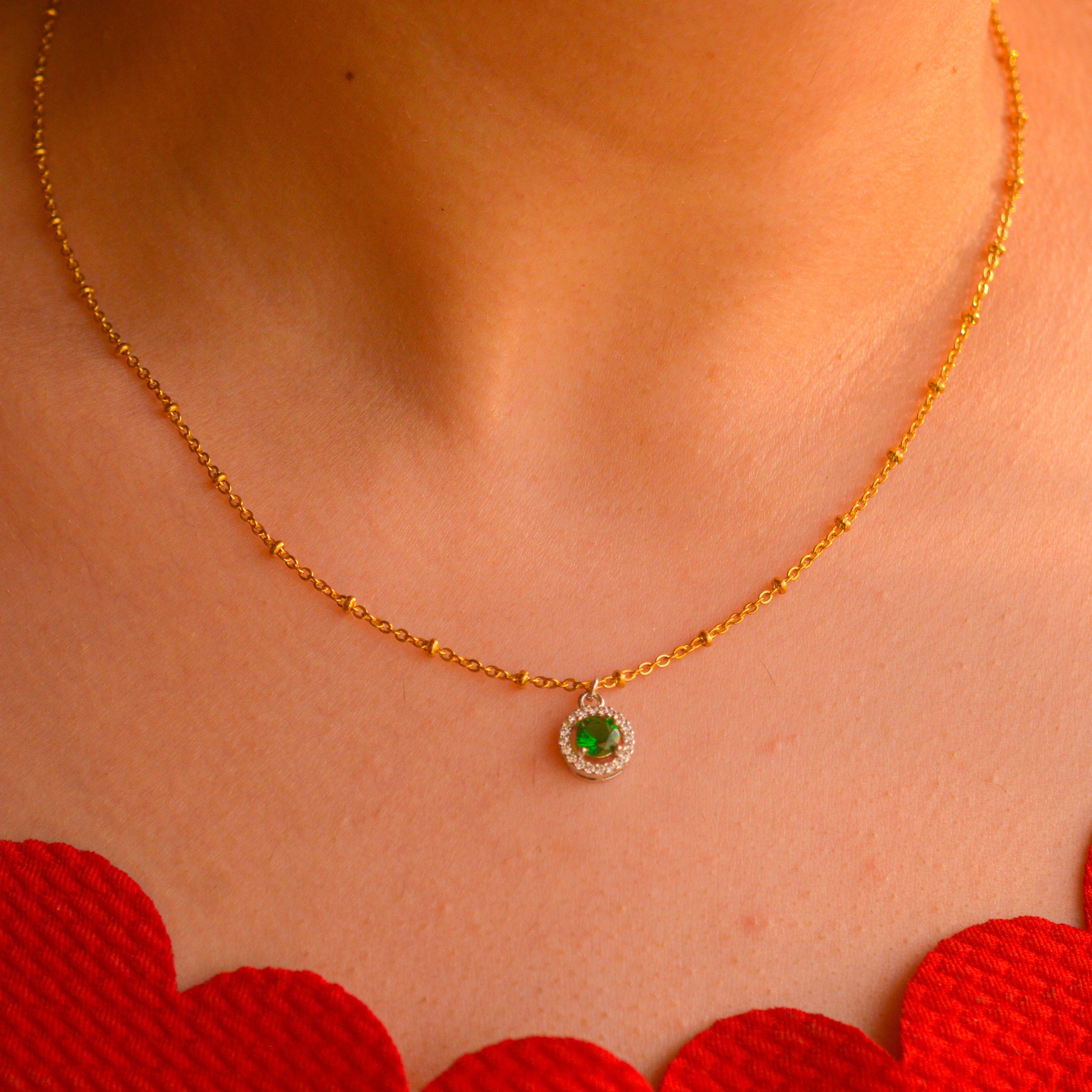 Silver Green Emerald in Gold Beaded Chain Necklace