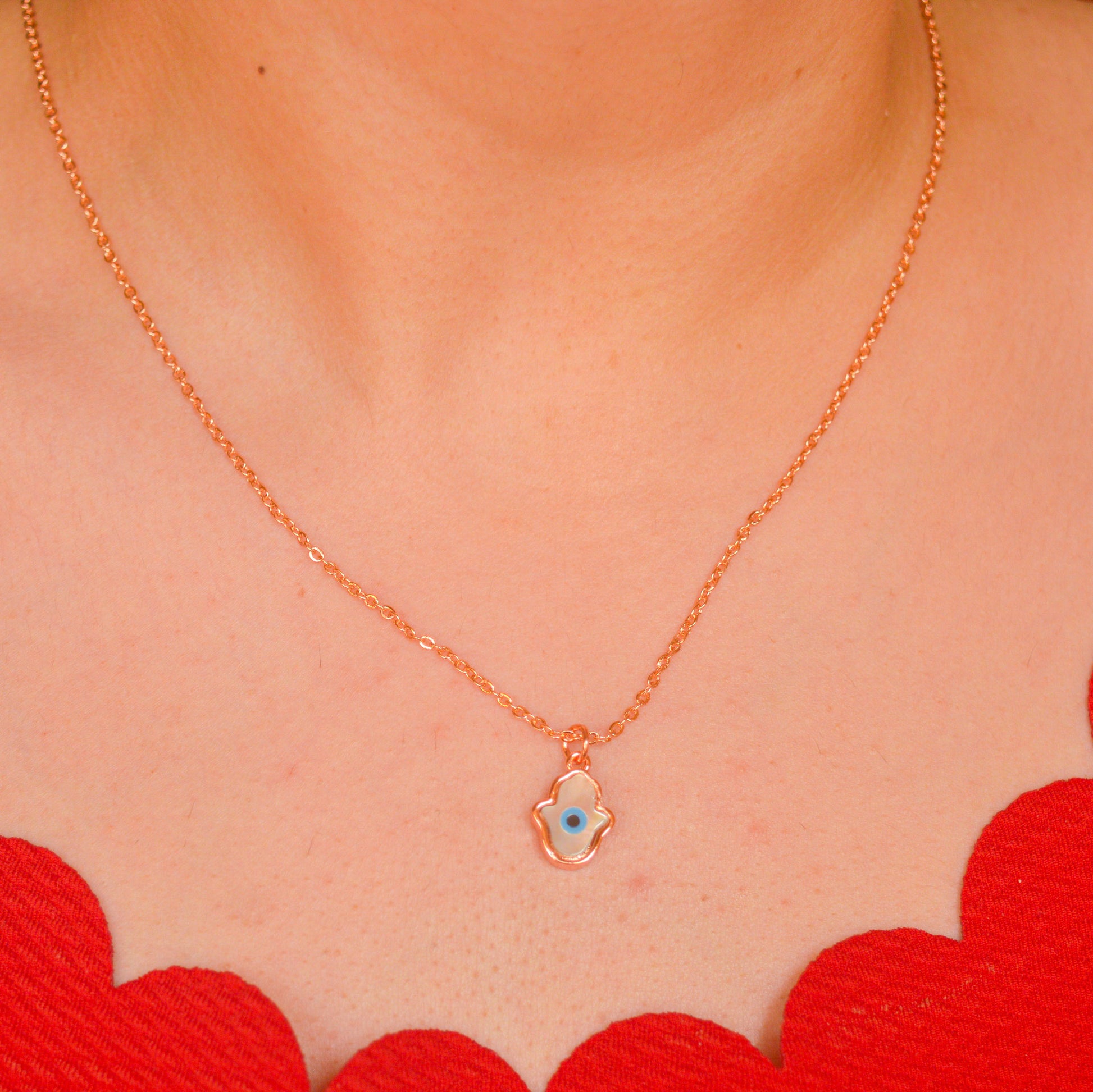 Tiny Hamsa Pearl Evil Eye Necklace - Rose Gold