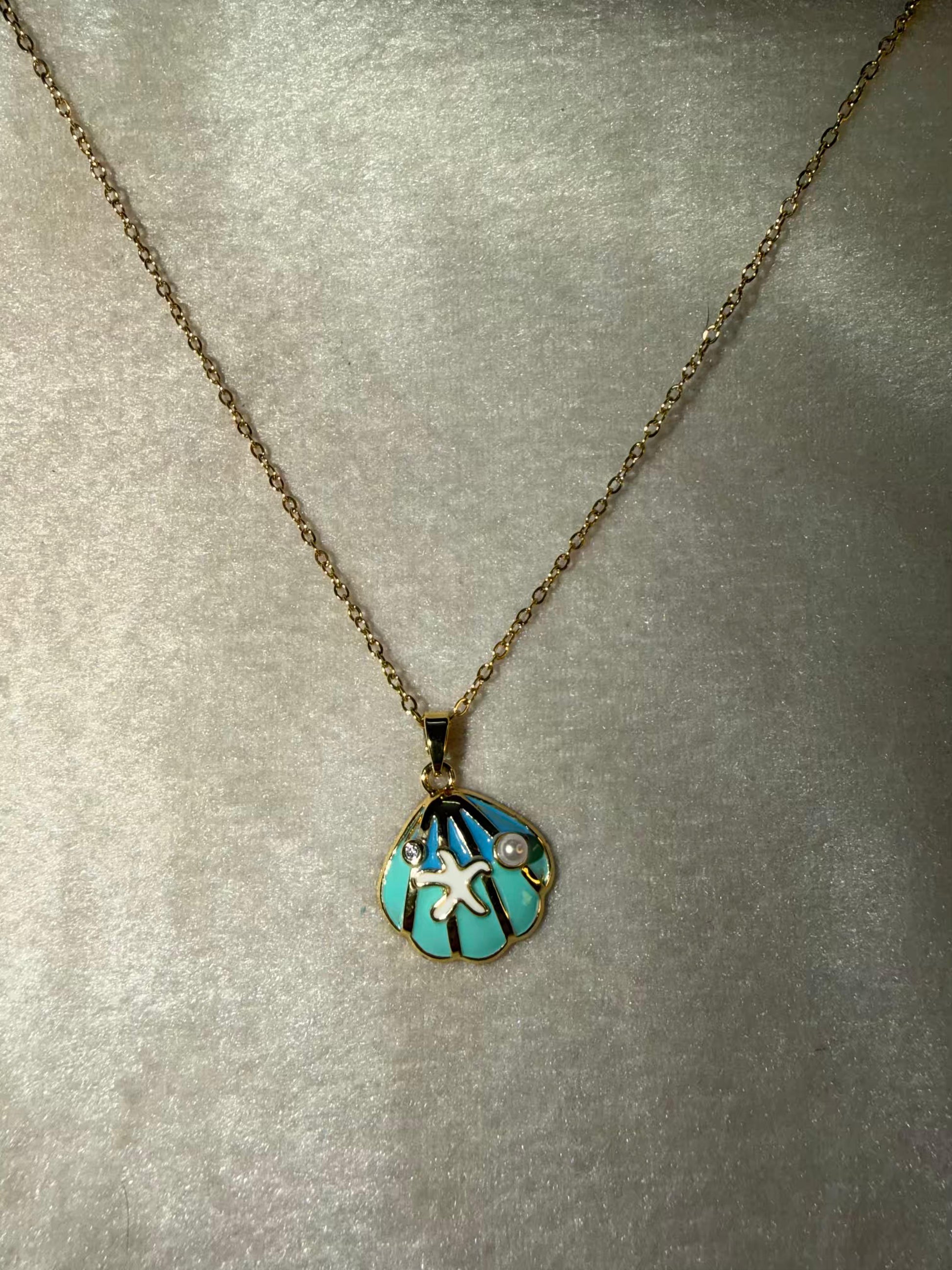 Turquoise Shell & Starfish Pearl Charm Chain Necklace Gold Plated Premium Necklace